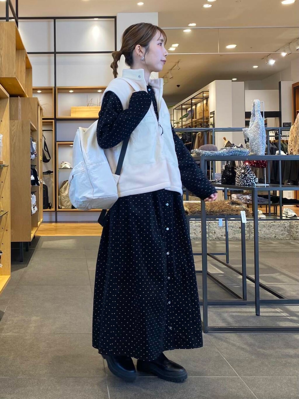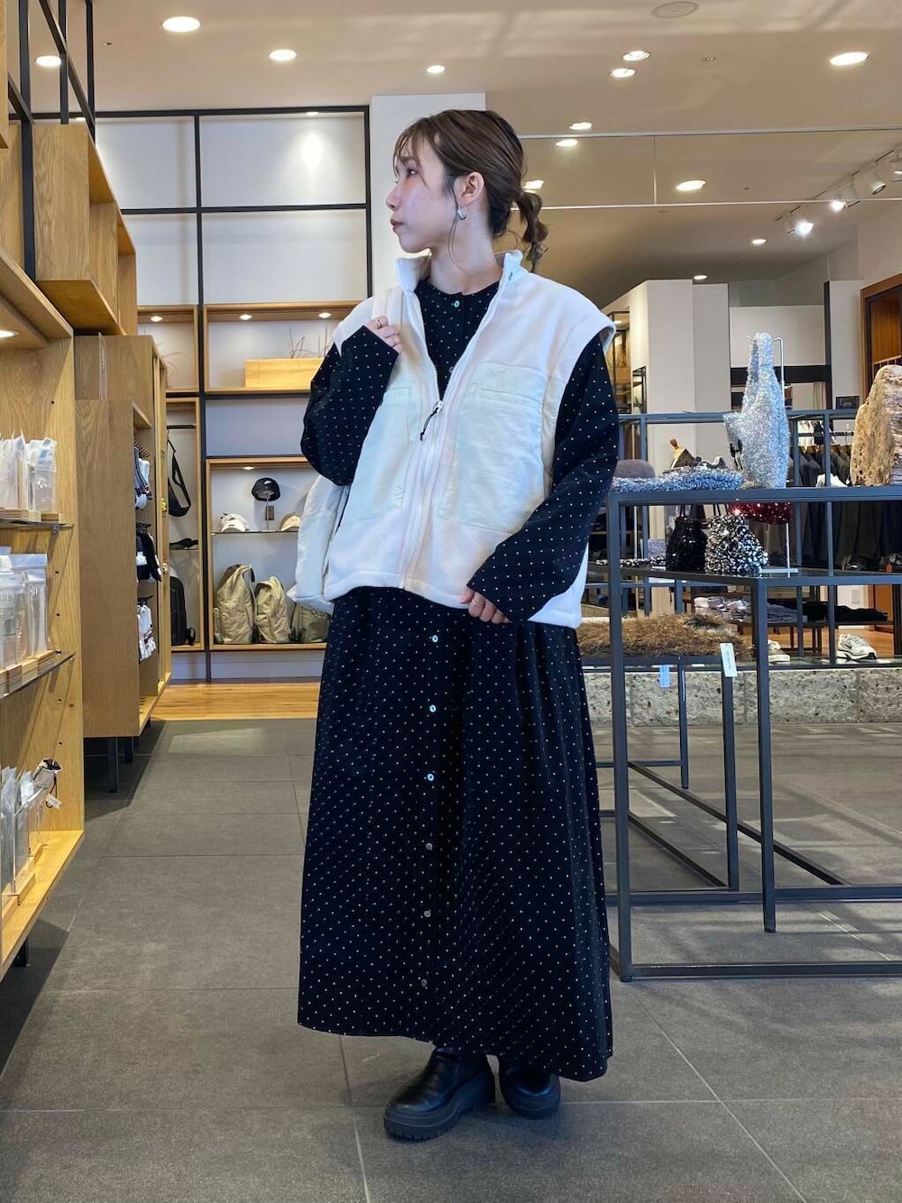かぐれのドットワンピースをカジュアルにスタイリング。