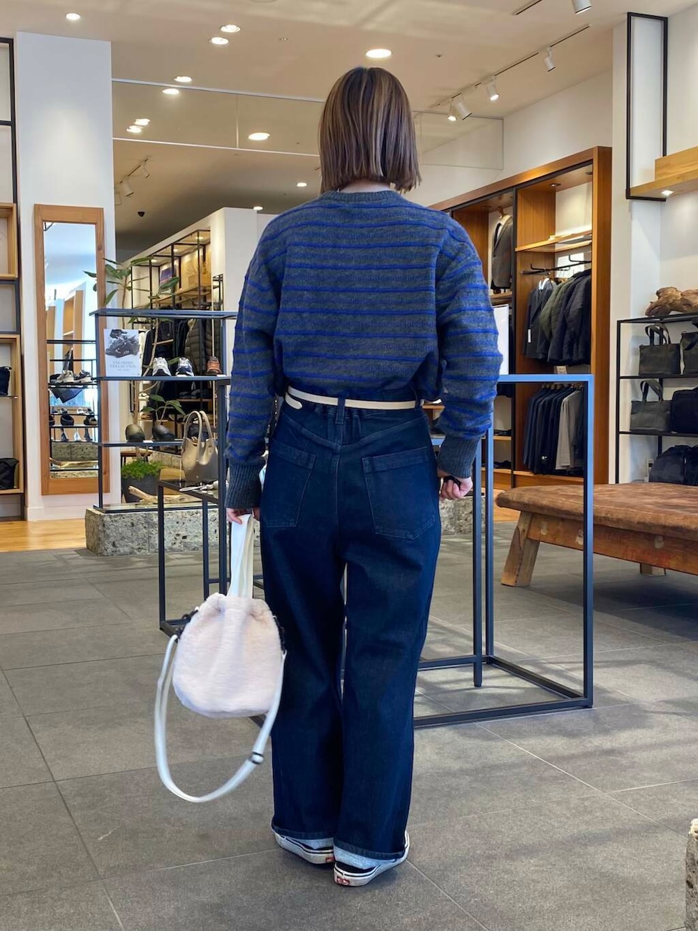 薄手のニットをインしてハイウエストでスタイリングをし、アウターを脱いでもかわいいデニムコーデに◎