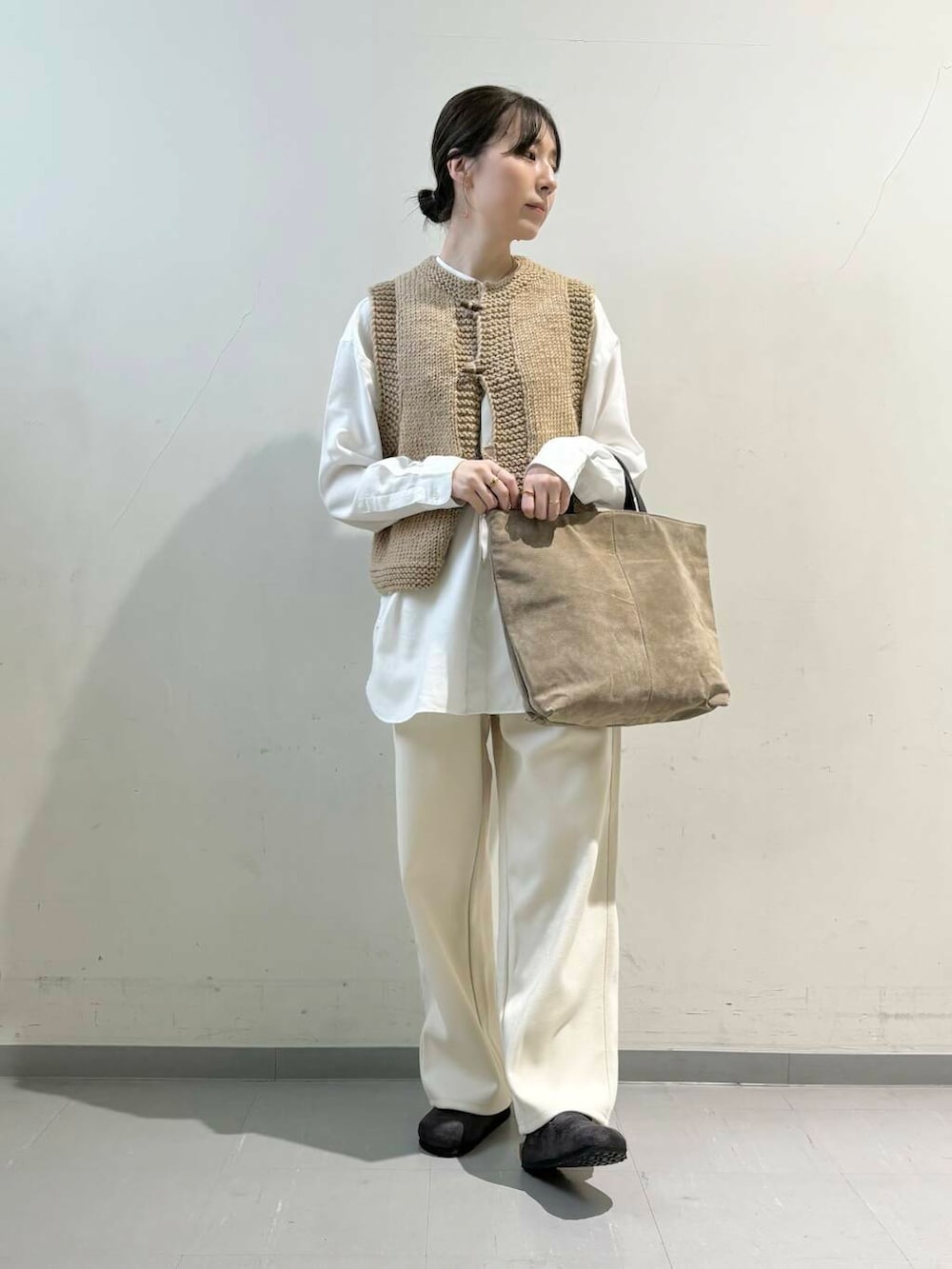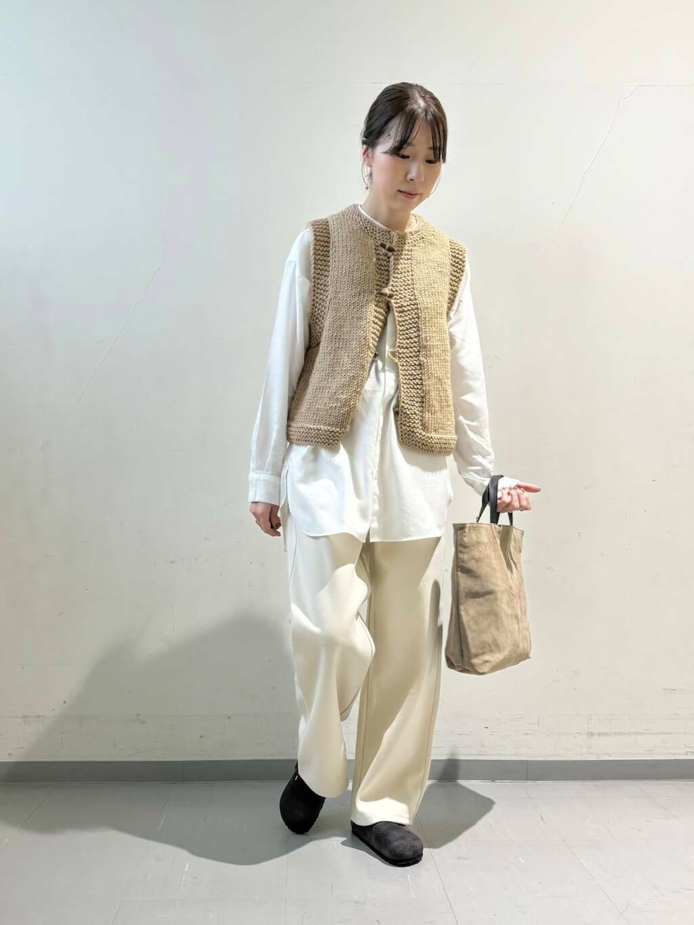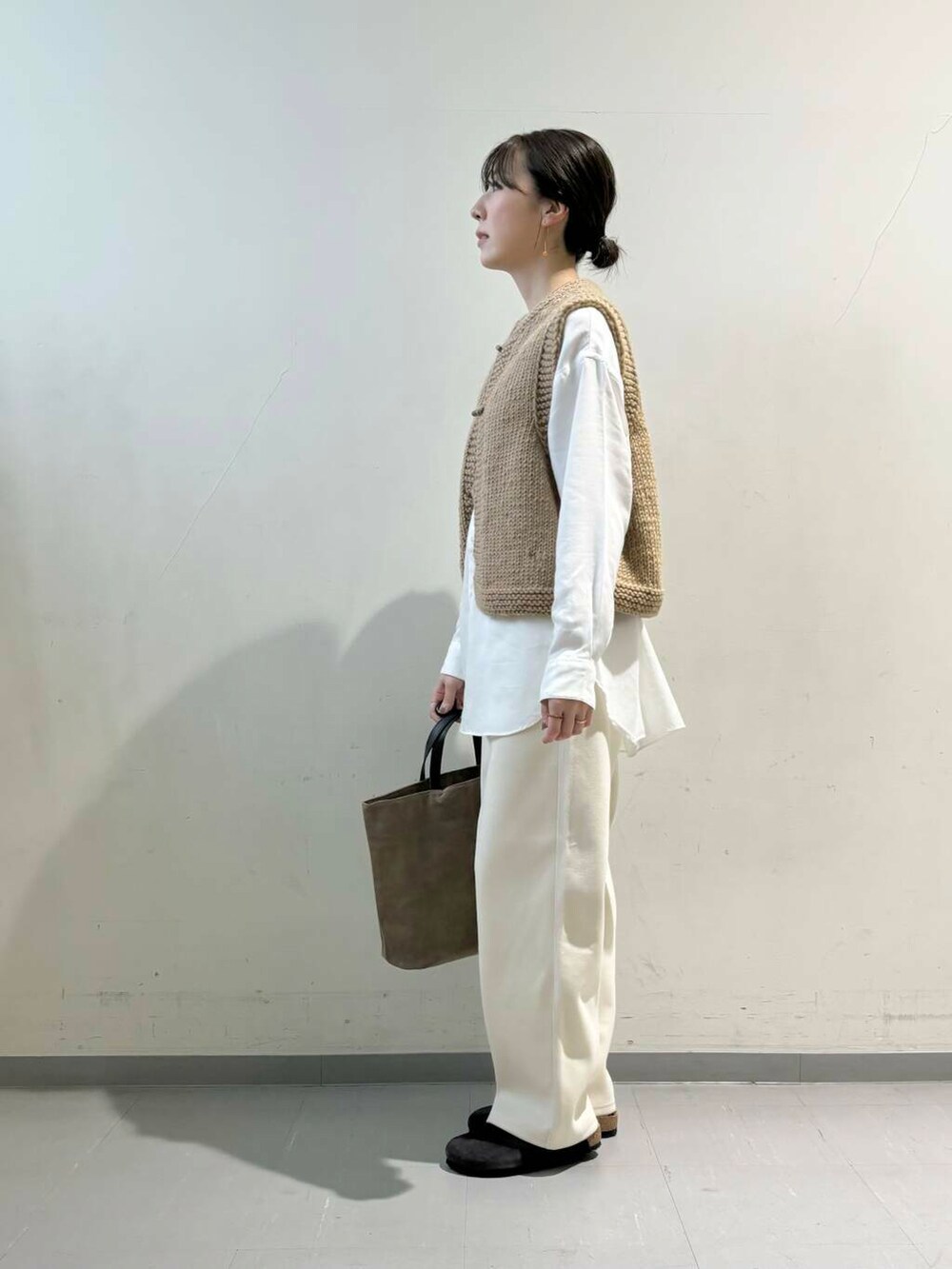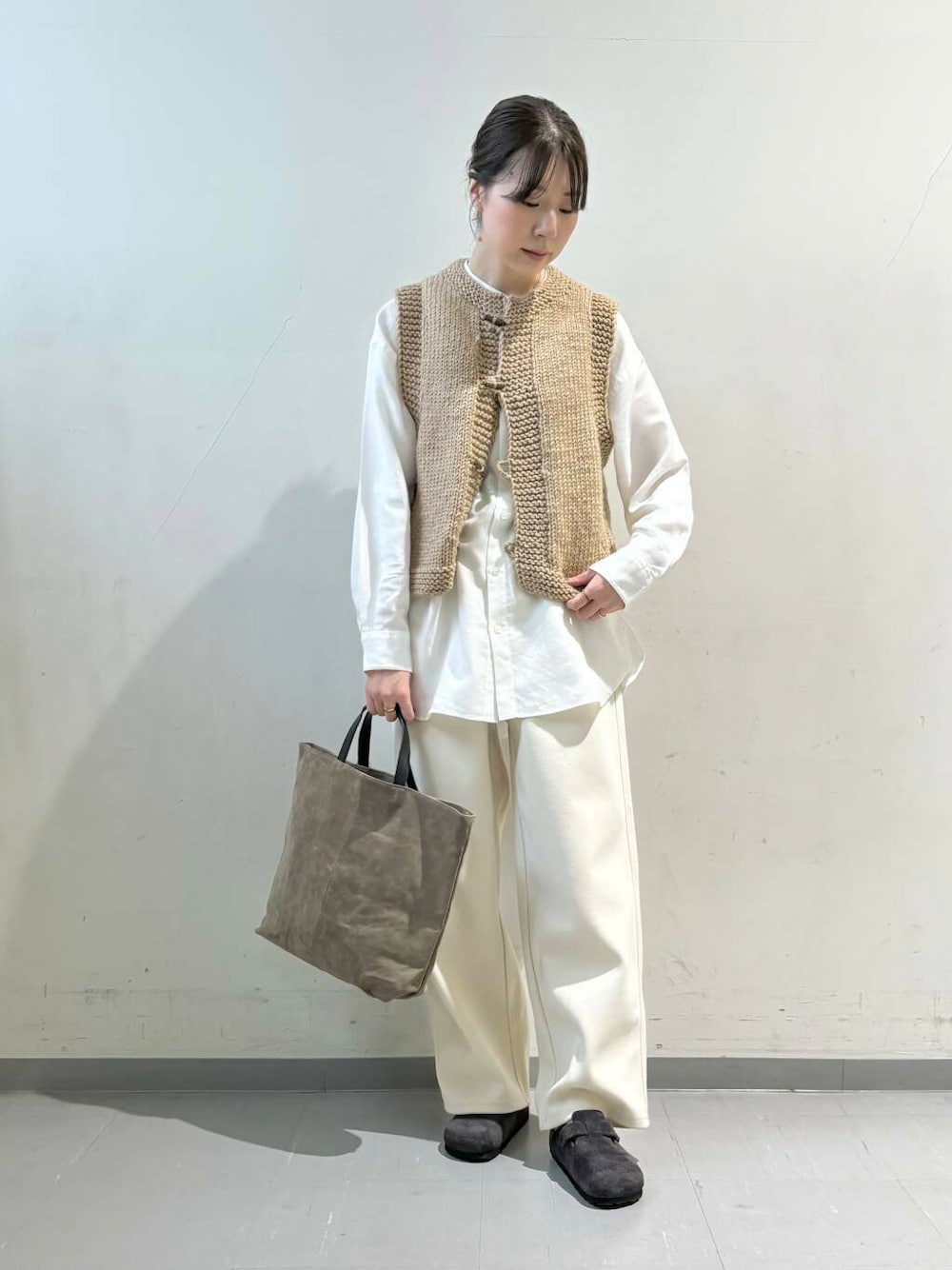メルトン生地のパンツにニットベストでカジュアル感強いので、落ち感のあるシャツでちょっと落ち着いた感じに◎