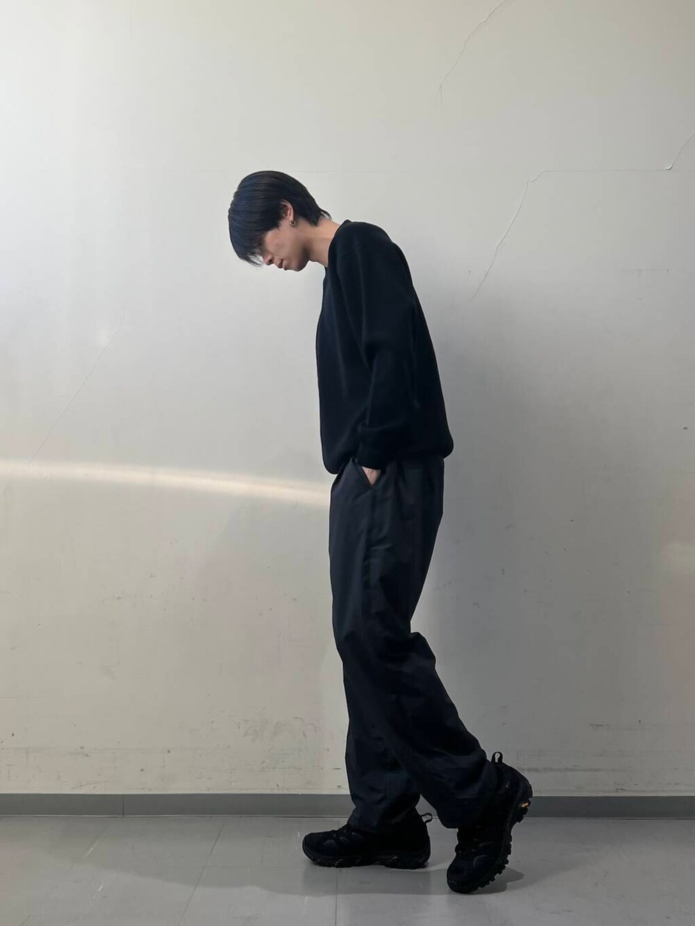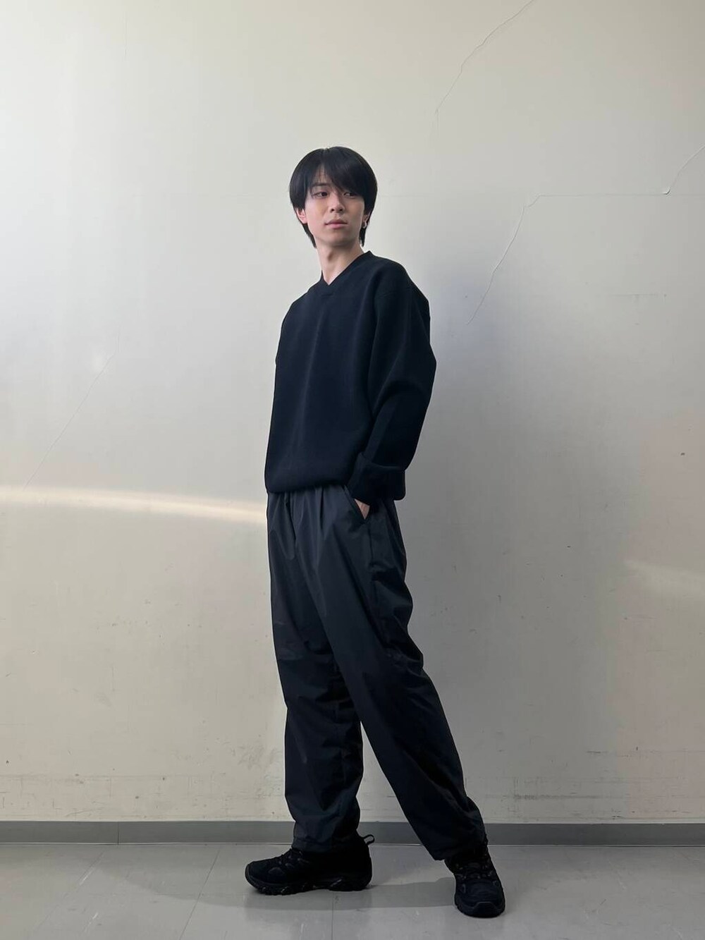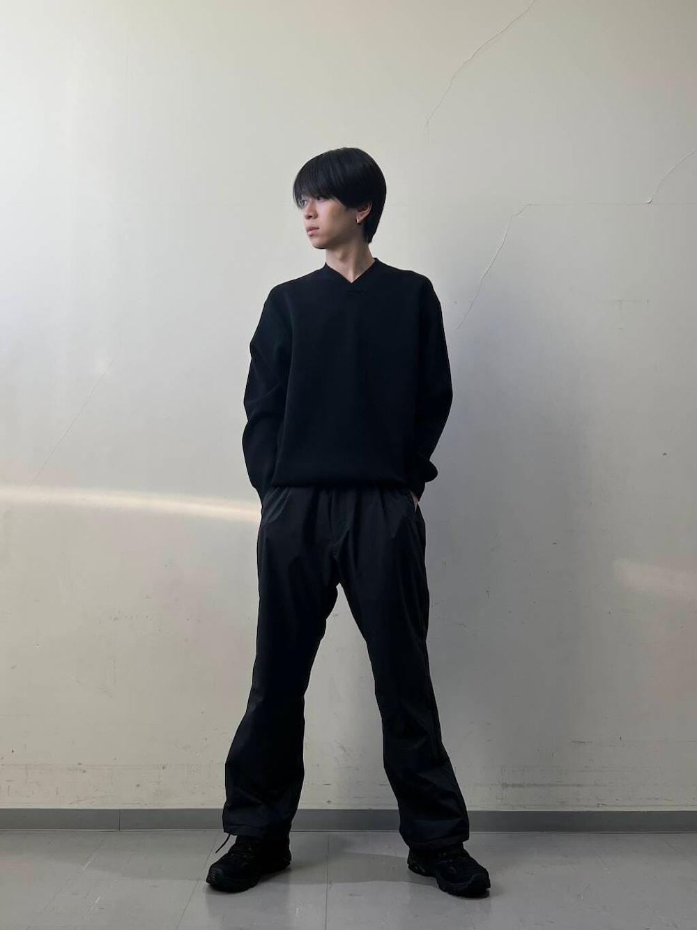 オールブラックコーデです!個人的にお気に入りのコーデになってます、Vネックのニットで綺麗めな印象をもたせます!