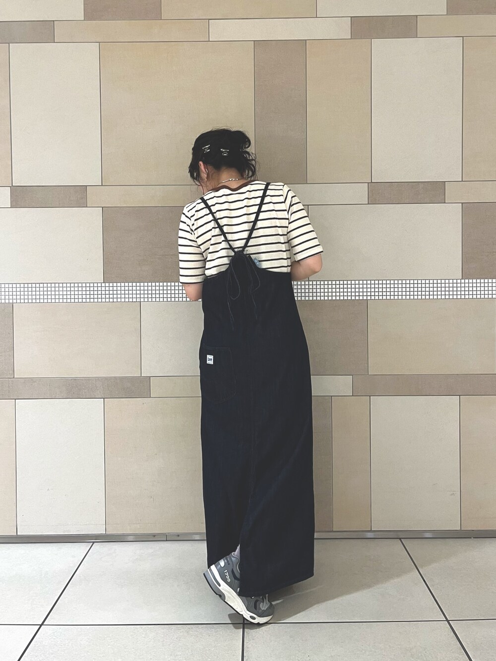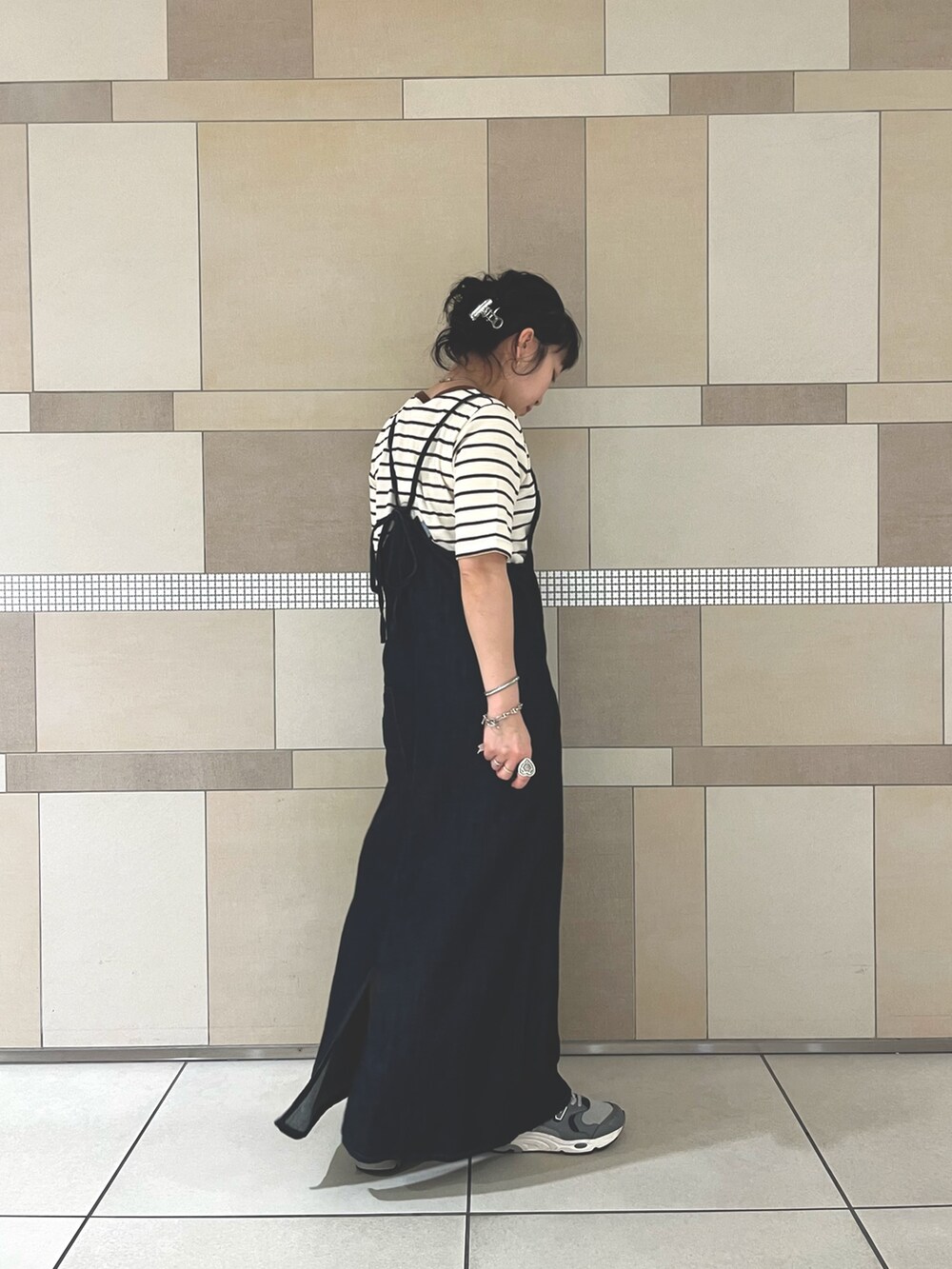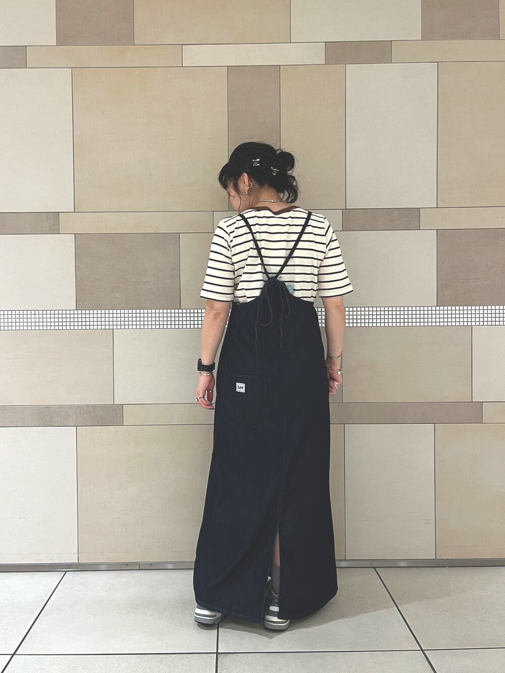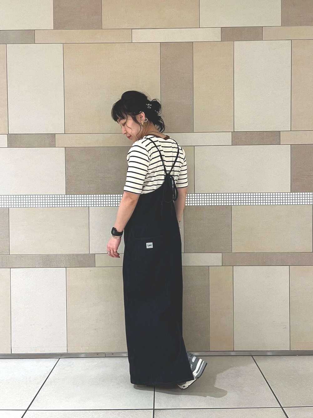 今回はボーダーのTシャツと合わせましたが、背中が大きく開くのでバックプリントのカットソーやノースリーブ、色もののトップスと合わせて、より夏らしく着るのも◎
