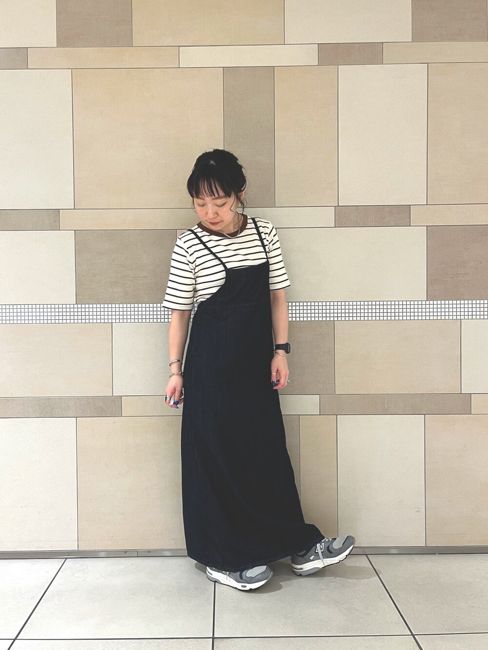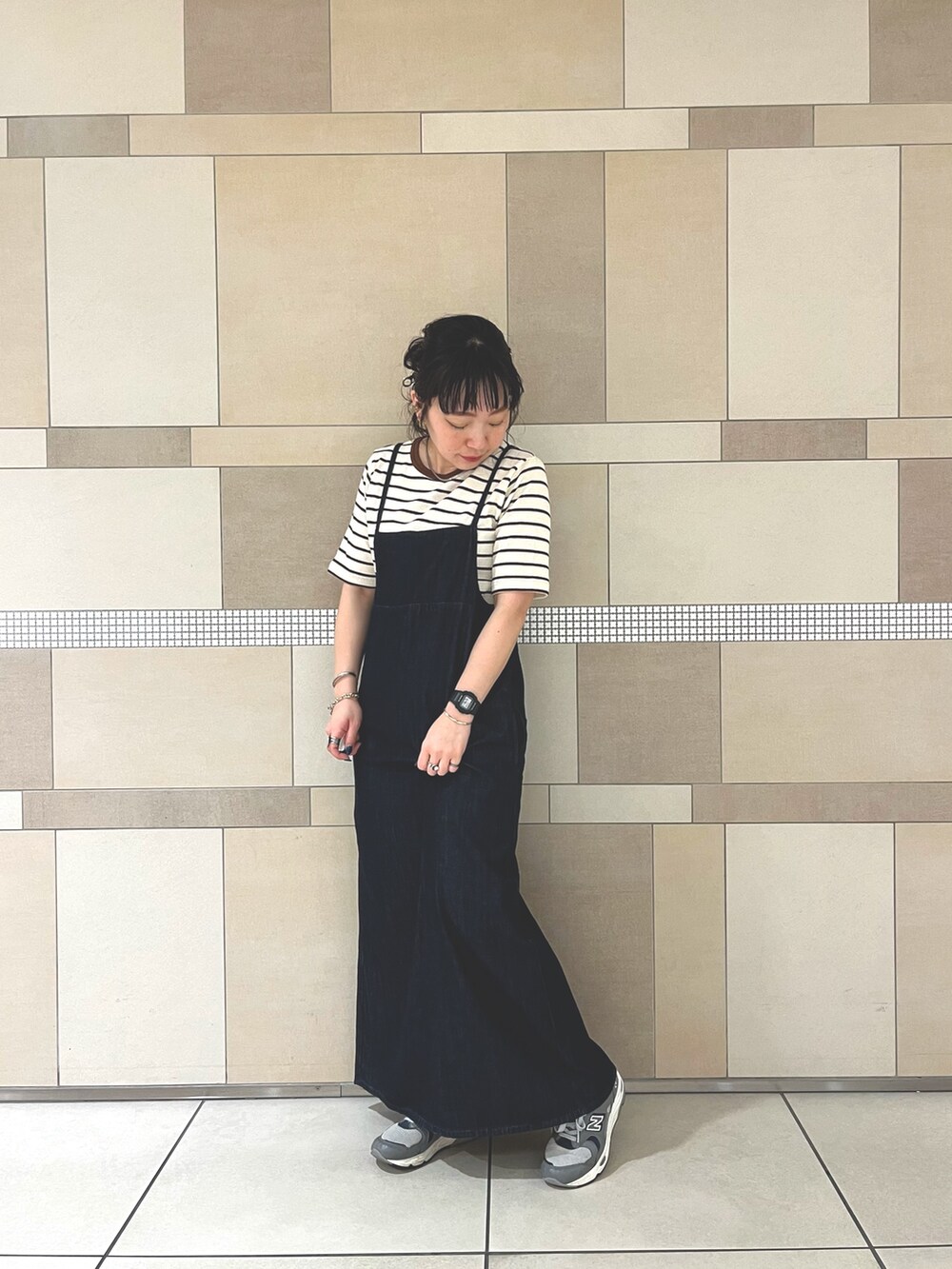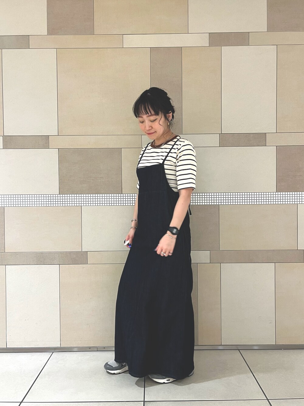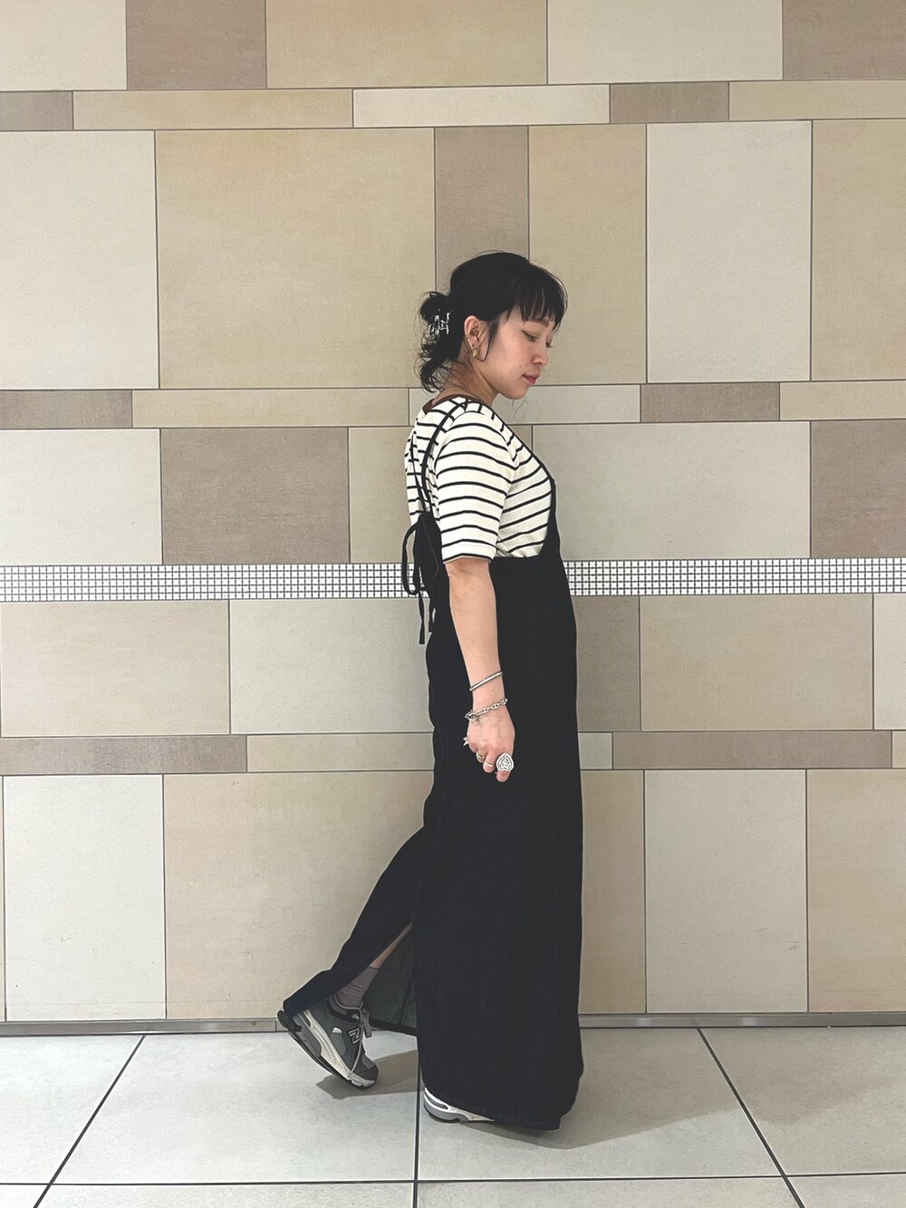 今回はボーダーのTシャツと合わせましたが、背中が大きく開くのでバックプリントのカットソーやノースリーブ、色もののトップスと合わせて、より夏らしく着るのも◎