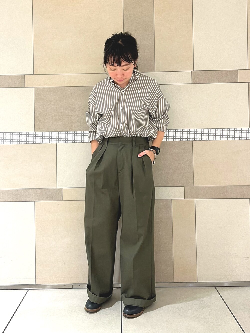 カーキとブラウンで、ちょっぴりミリタリー要素を入れることでシンプルな合わせでもほんのり差がつくスタイルに◎