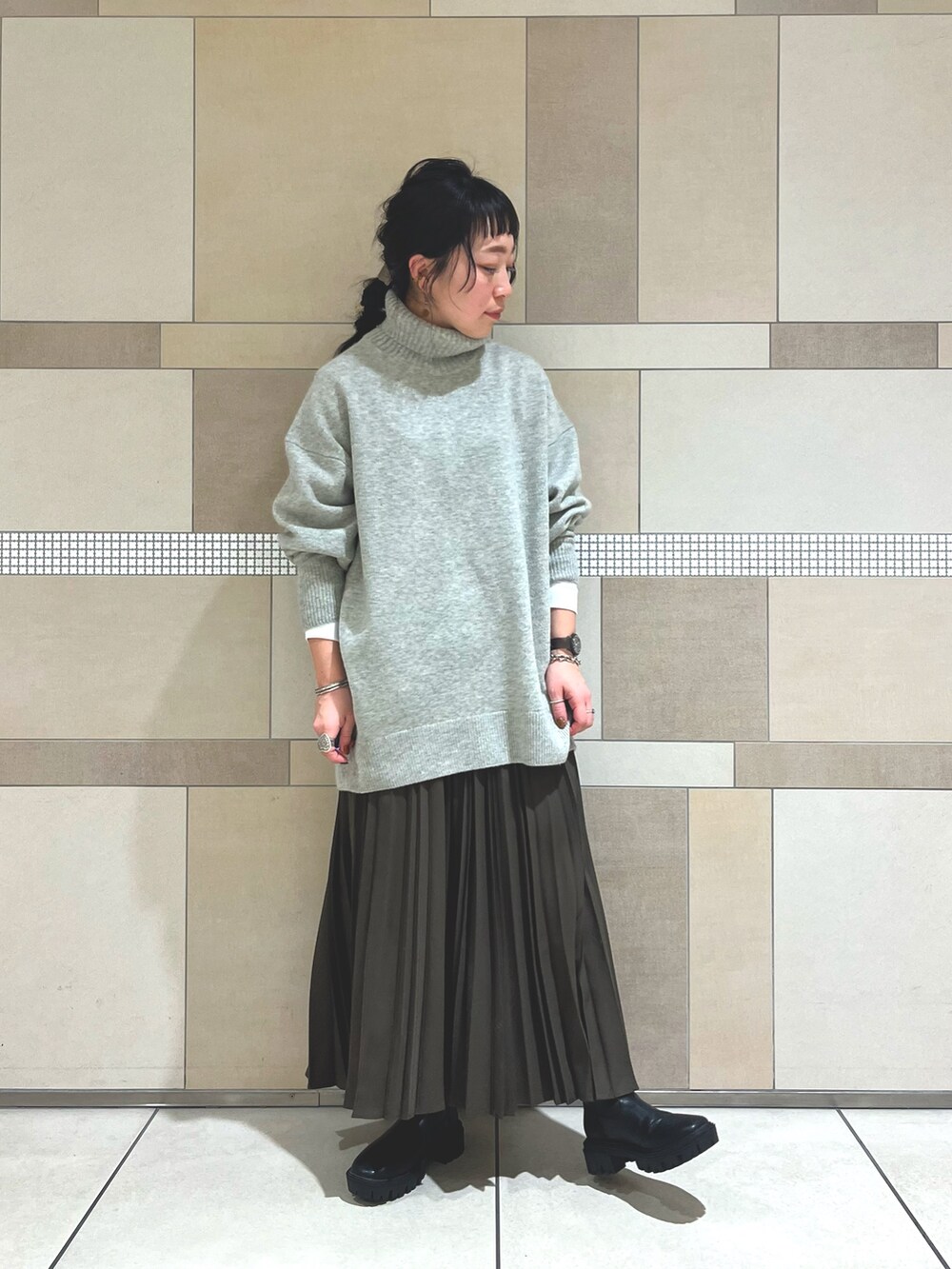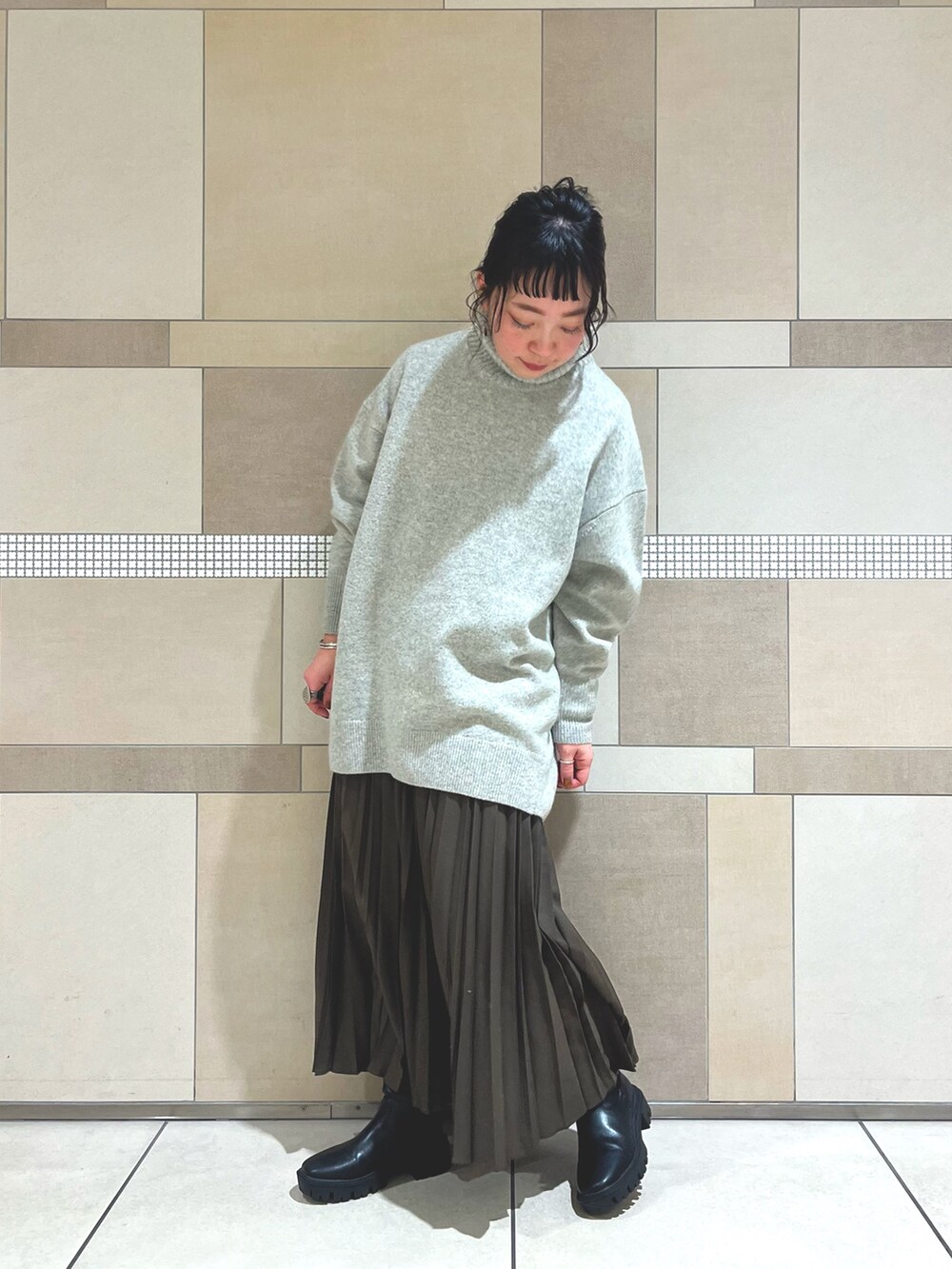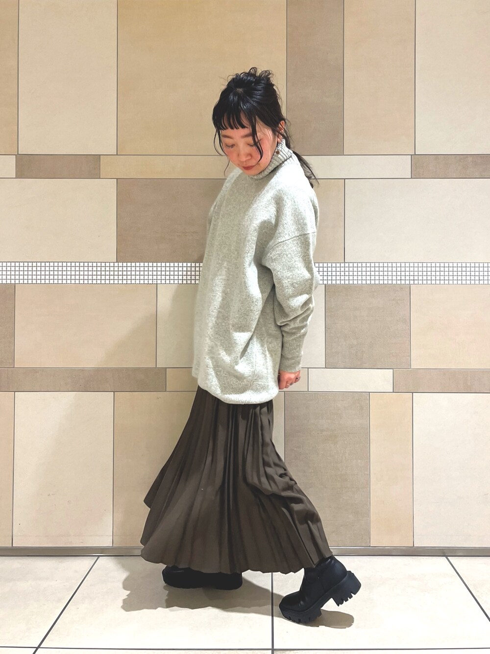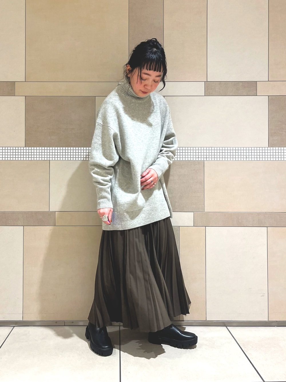 かぐれのチュニック丈タートルニットと、プリーツのスカートで、楽チンなのにキレイ見えするスタイリング。