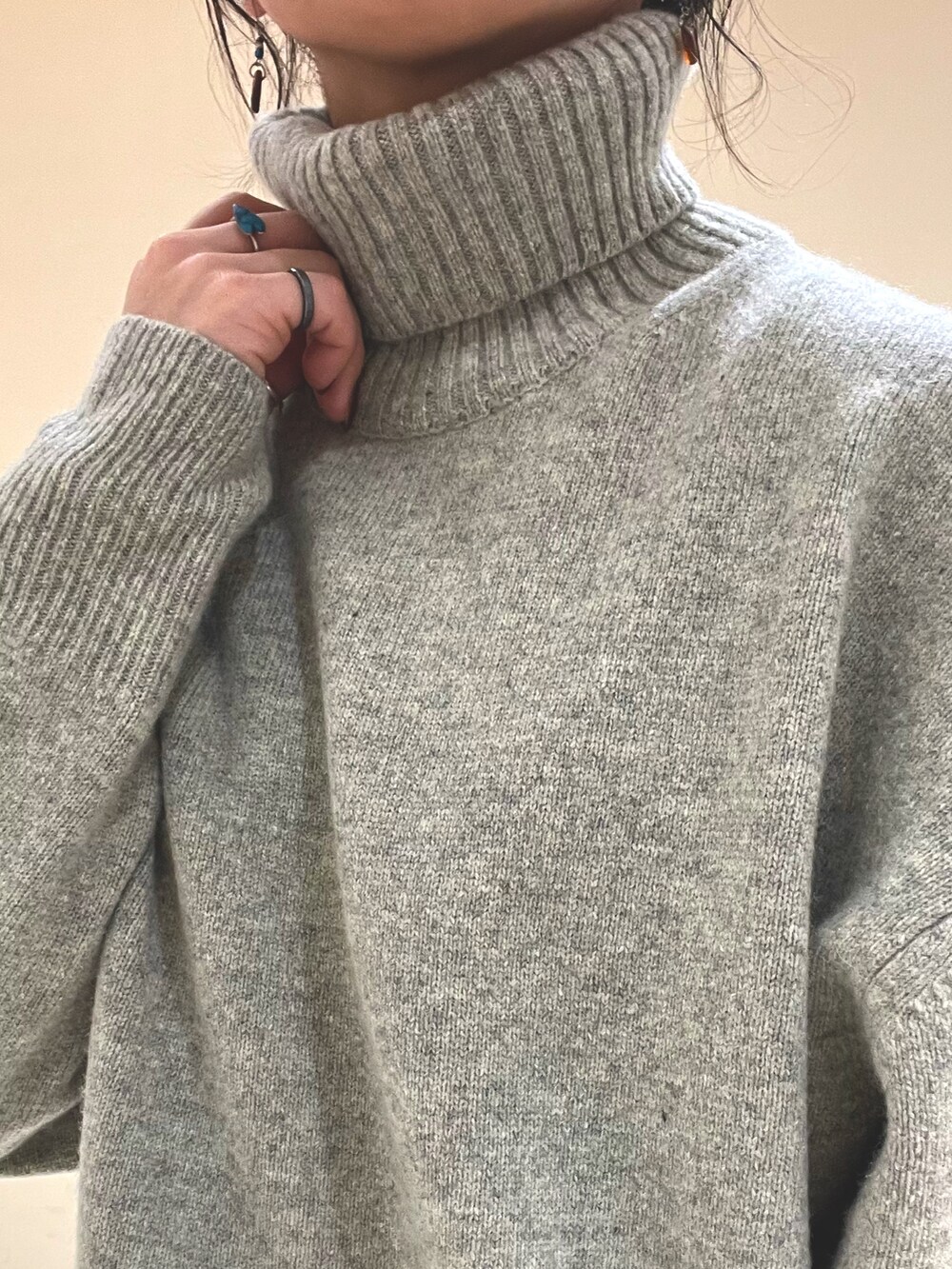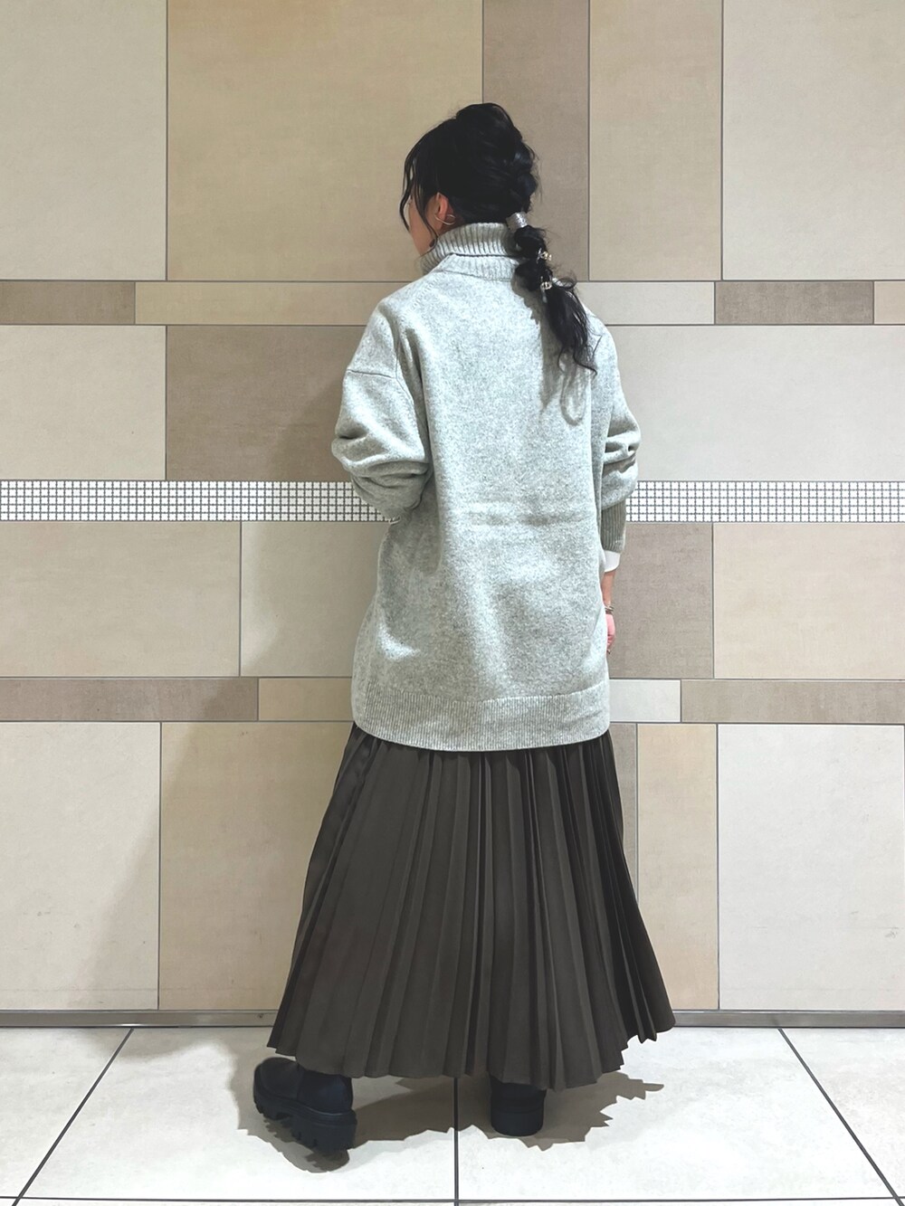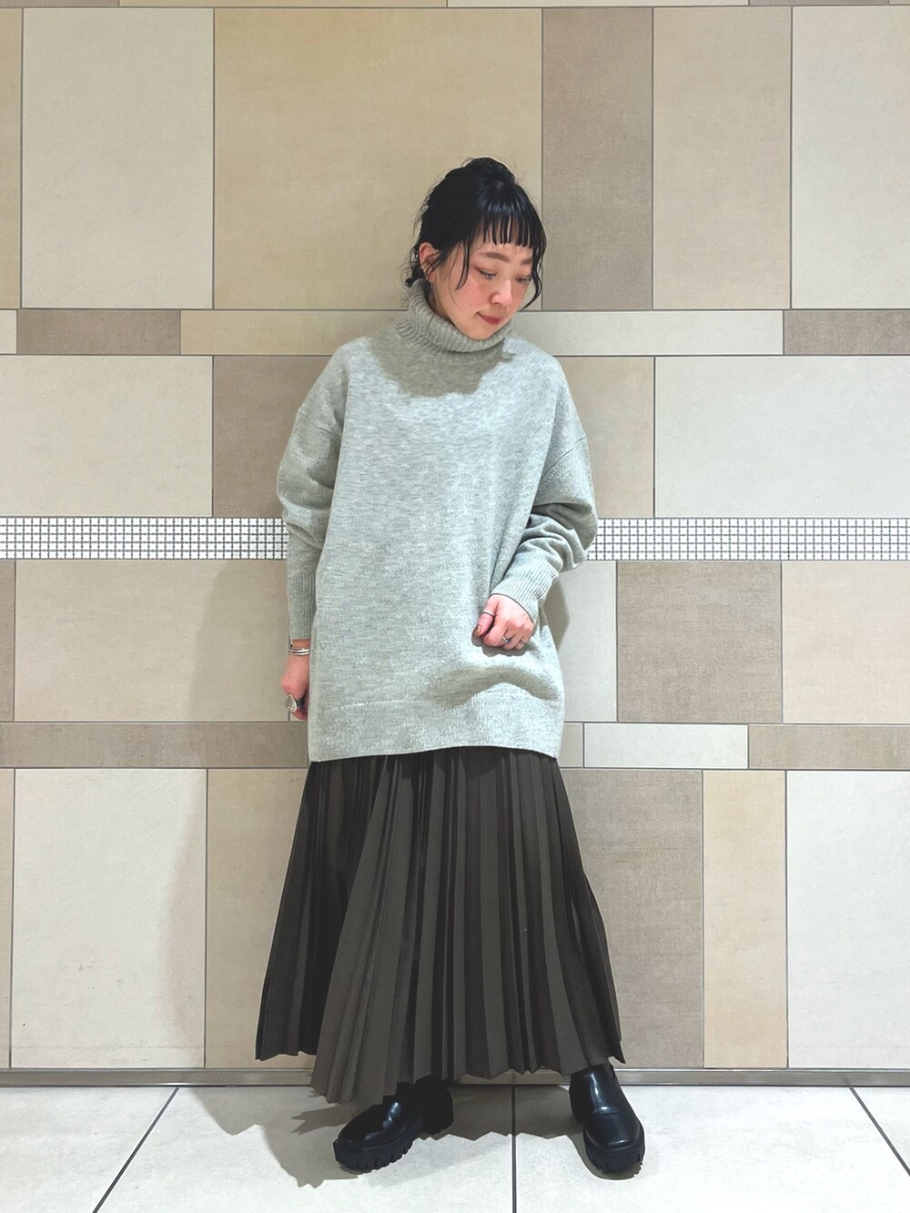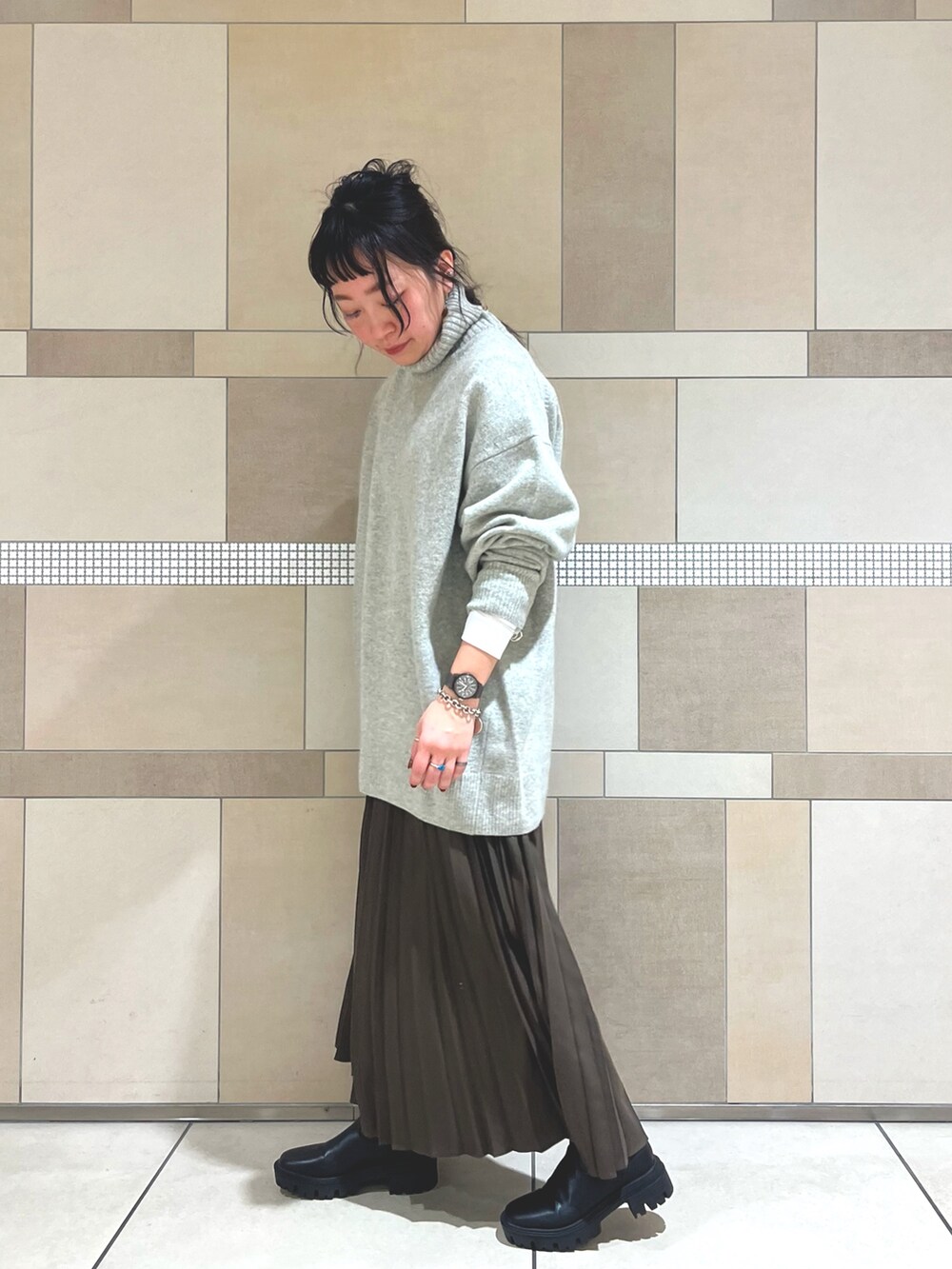 かぐれのチュニック丈タートルニットと、プリーツのスカートで、楽チンなのにキレイ見えするスタイリング。