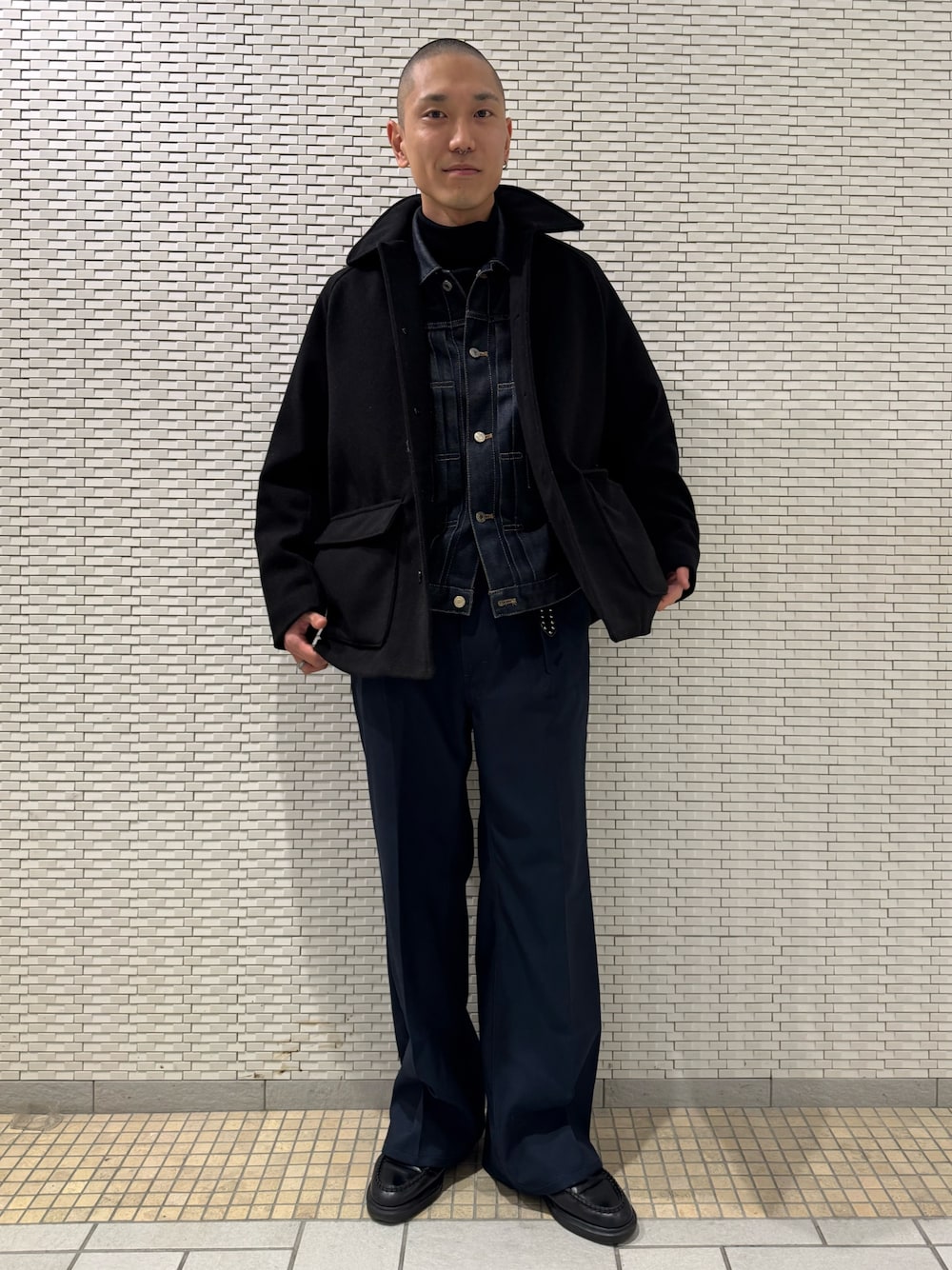 〇インナーのシャツにはメルトンシャツを使用しております!秋冬定番の素材でやや起毛している素材感が柔らかい印象にコーディネートを仕上げてくれます!