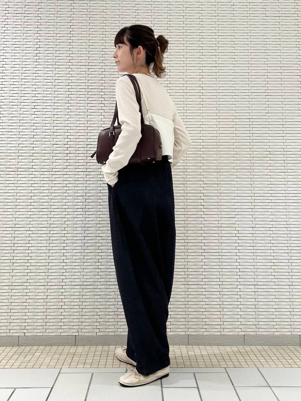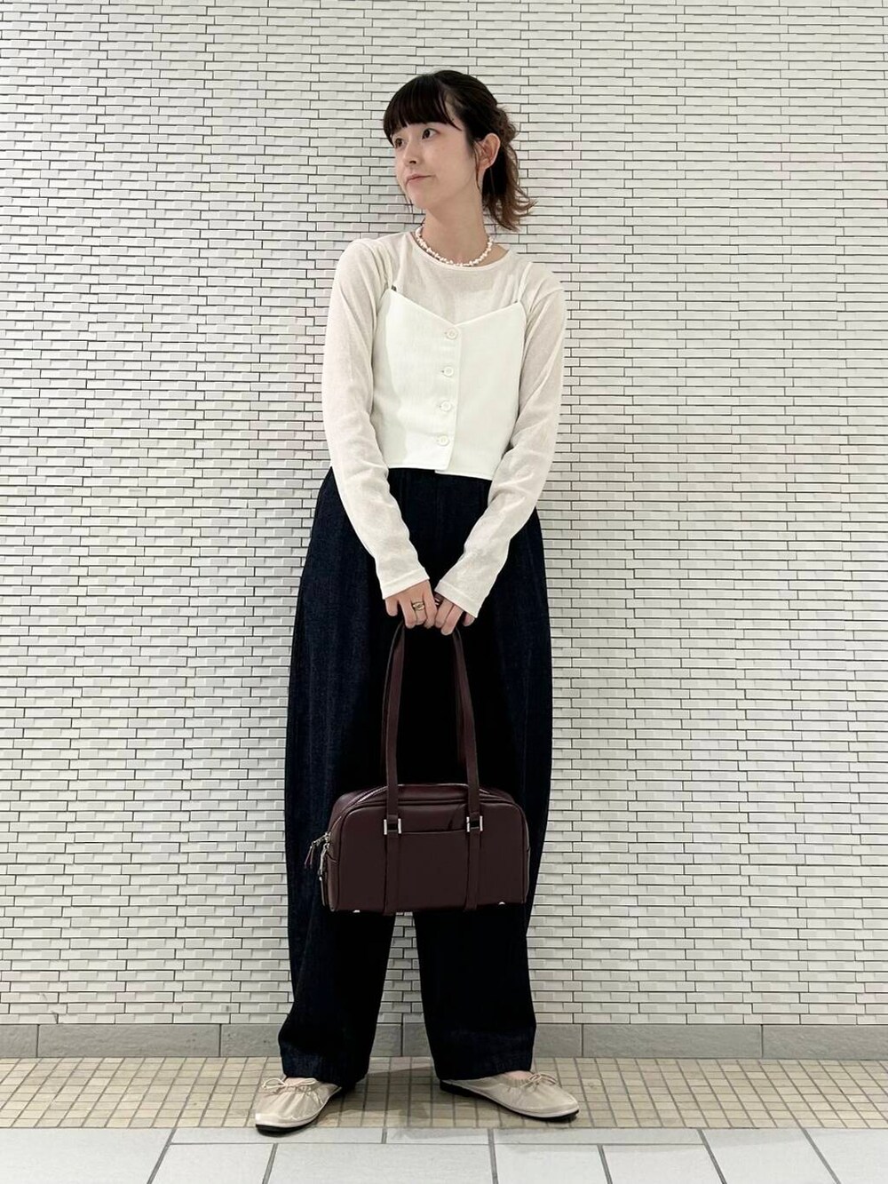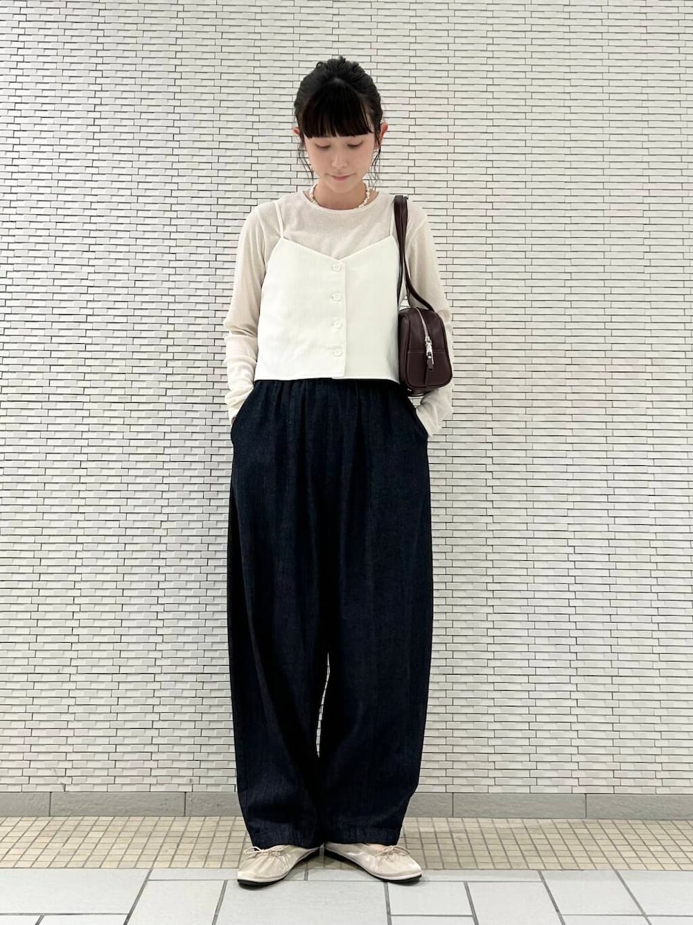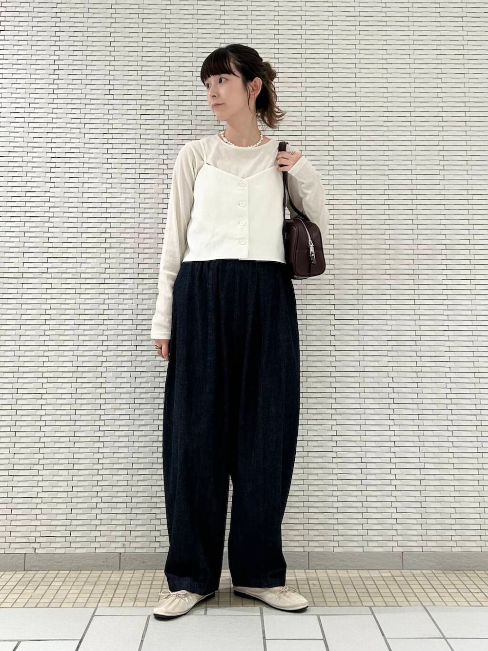 キャミソールビスチェ×デニムでカジュアルダウンしすぎず、女性らしい印象で着ていただけます。