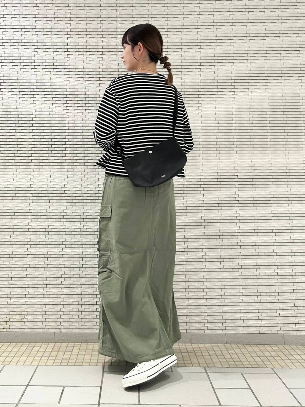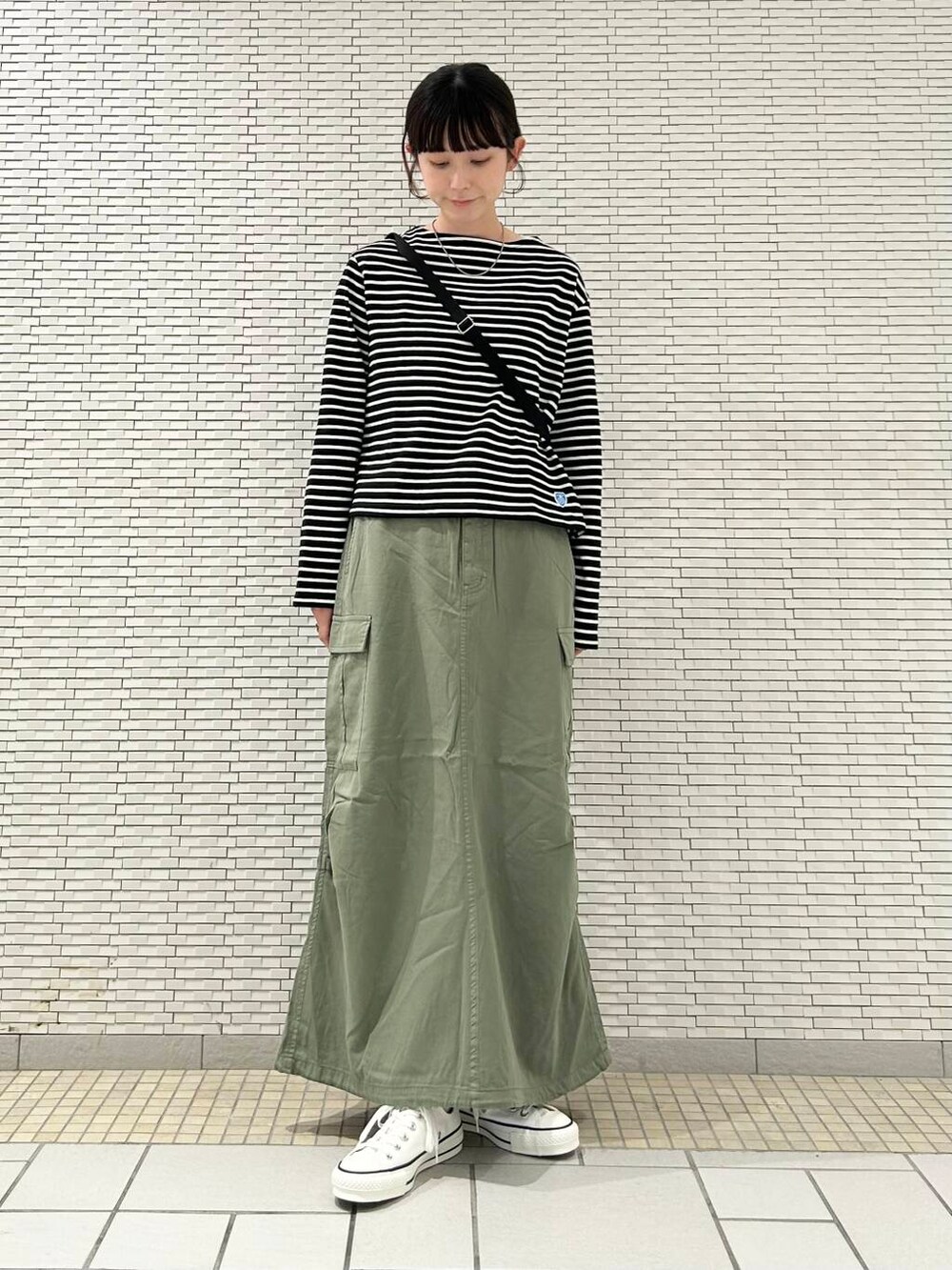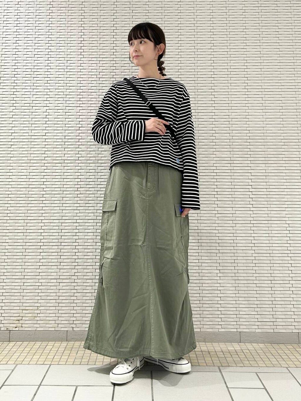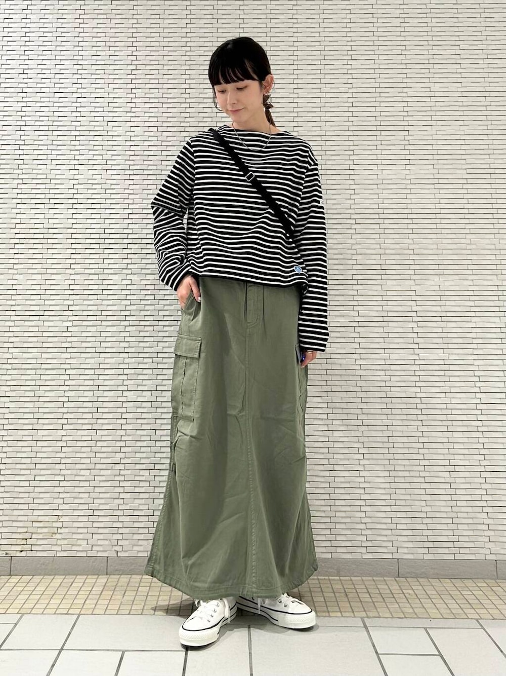 カジュアルダウンしがちなカーゴですが、スカートなら女性らしいコーデにも合わせやすいです◎