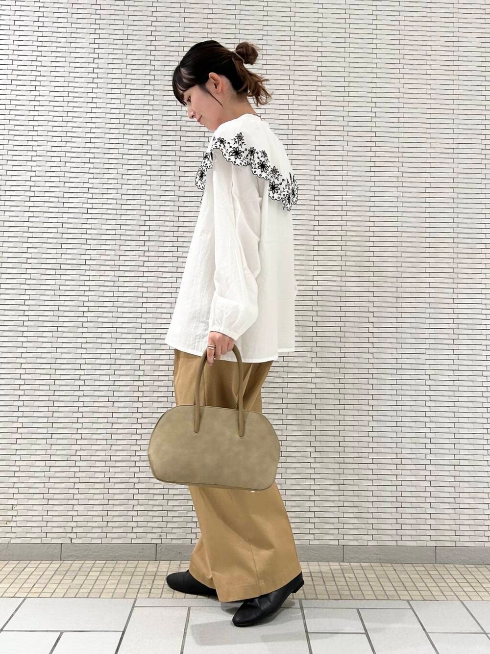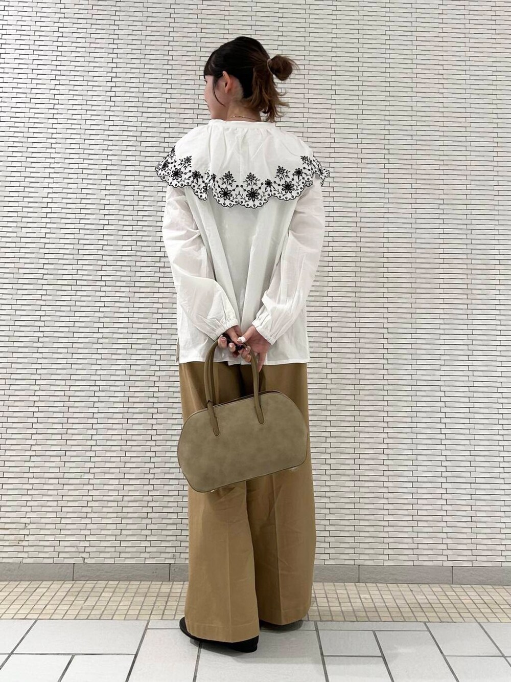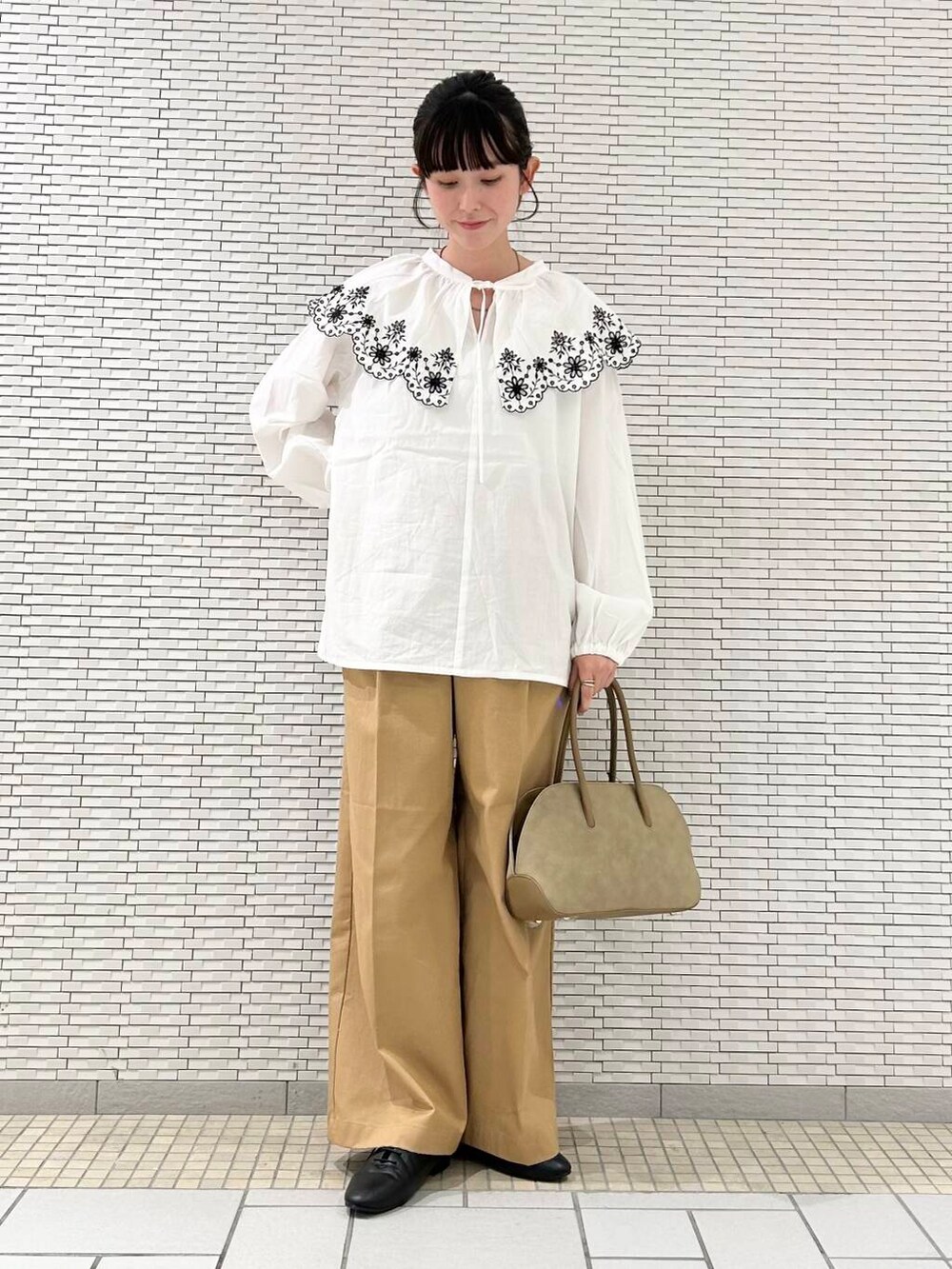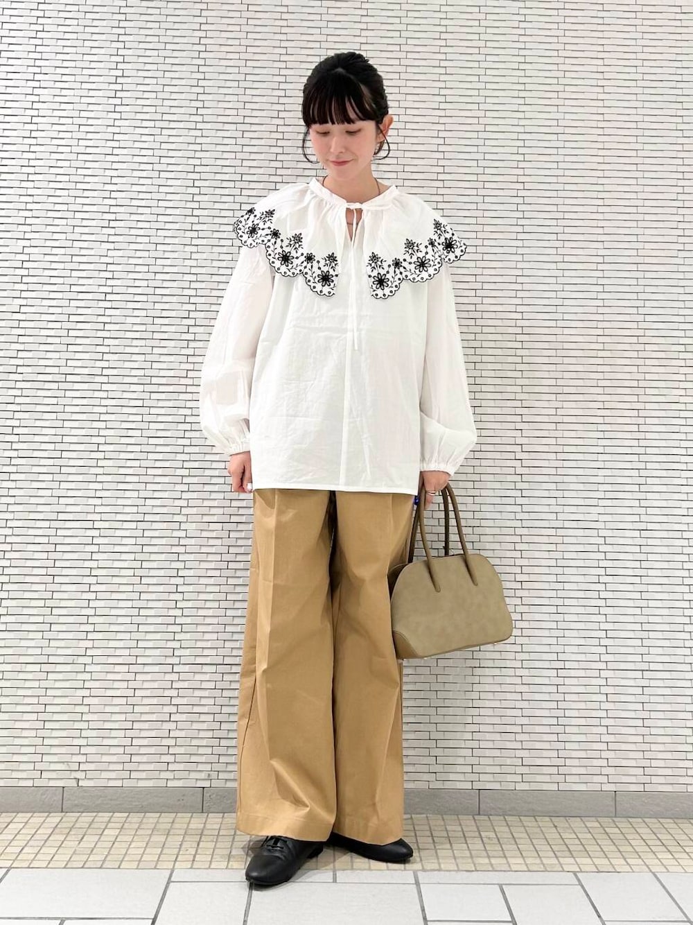 レース刺繍されたデザインがアクセントで、シンプルながらも華やかさのあるブラウスです。