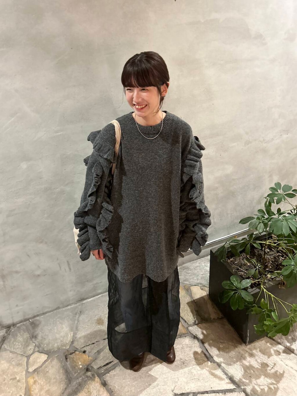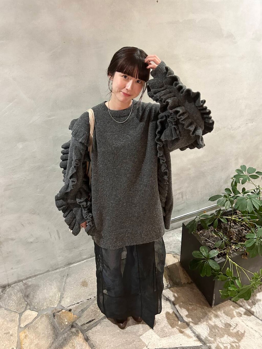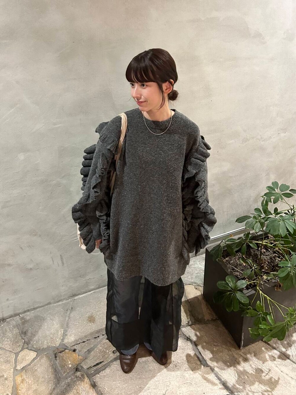 袖のフリルがポイントで、シンプルながらも華やかさのあるデザインです。