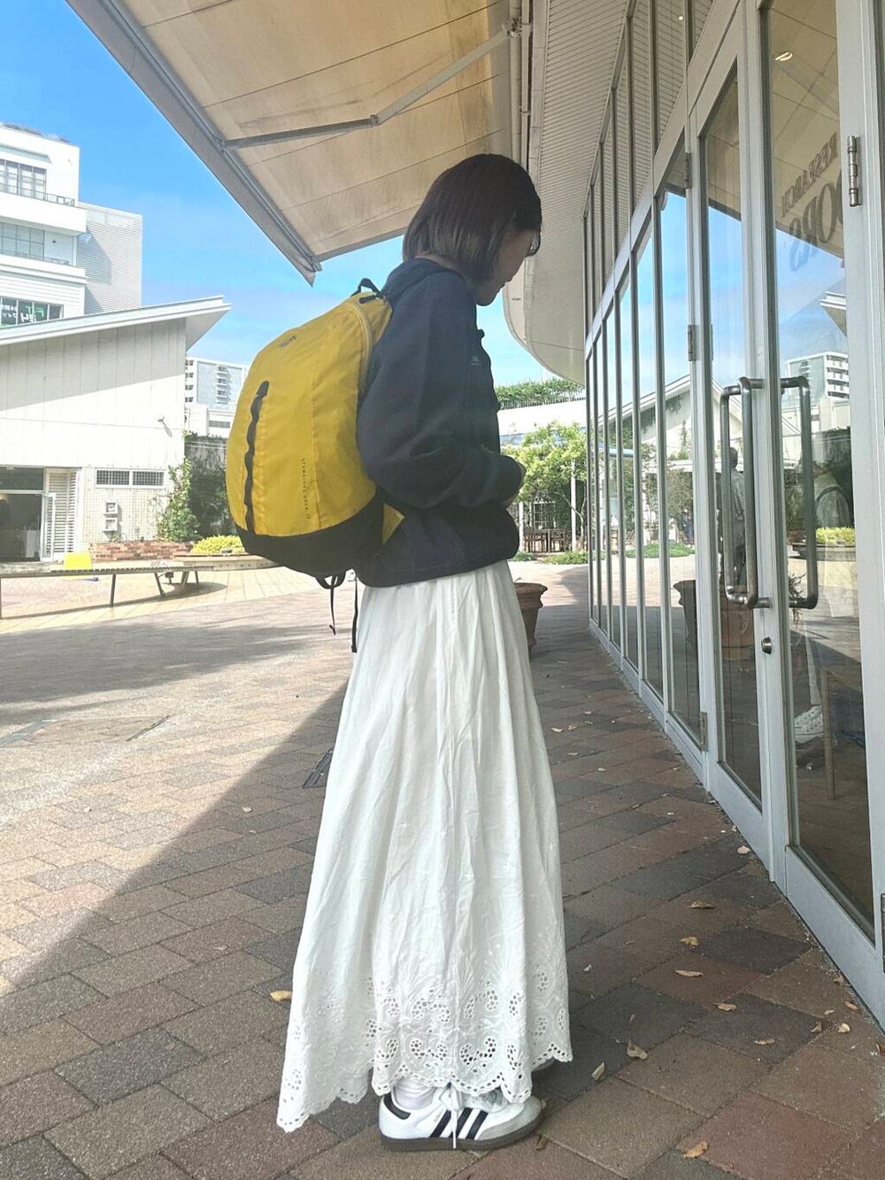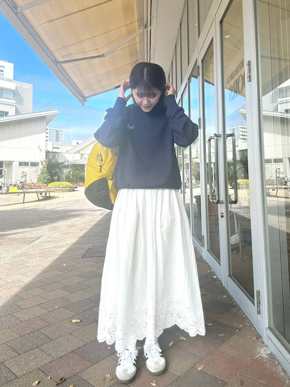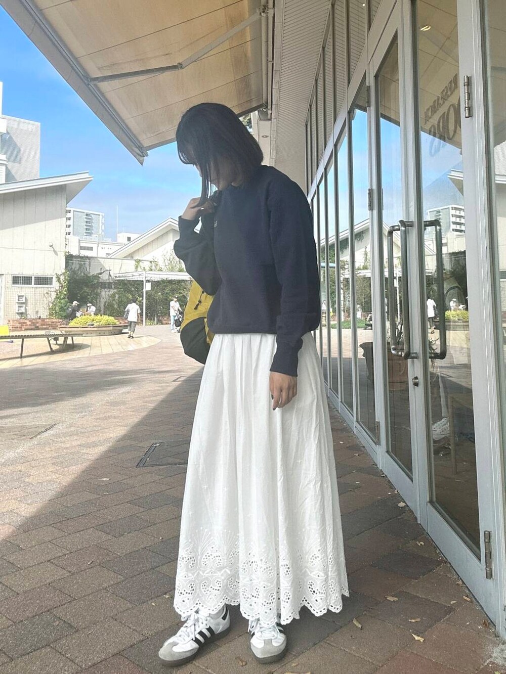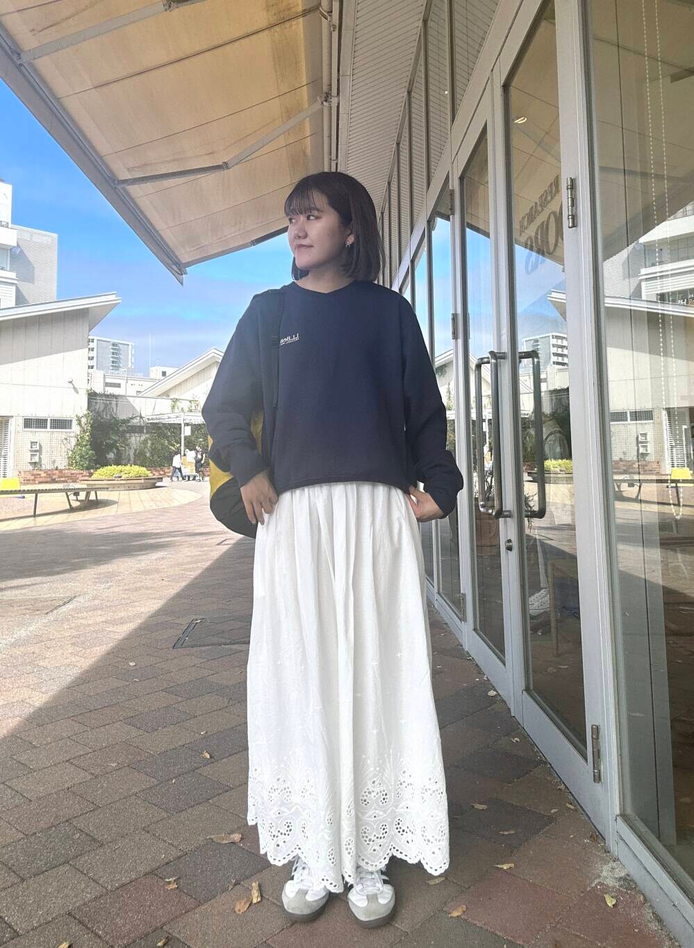 L.L.Beanのスウェットは丈が長すぎないため、スカート合わせでもバランスが取りやすいです!