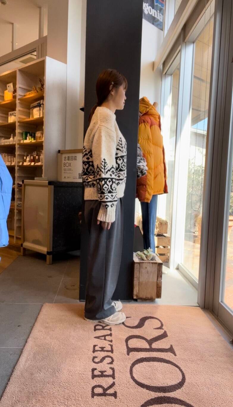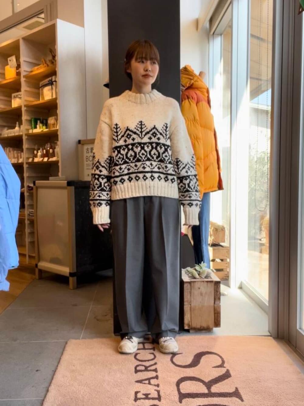 かぐれのニットですが、アルパカの生地も入っていますので柔らかく着心地良いです!また、少しゆったりしてるので腰回りもしっかりカバーでき気軽に着ていただけます。