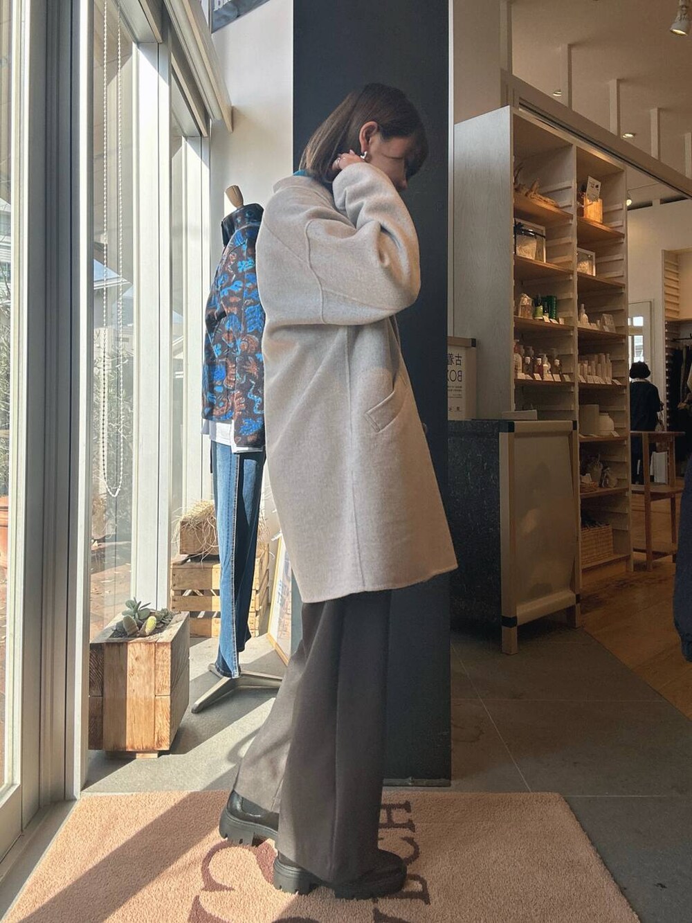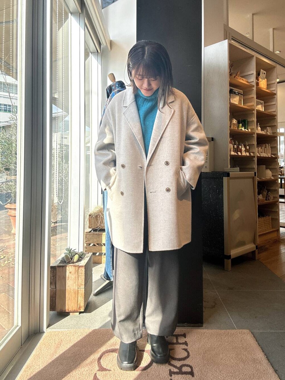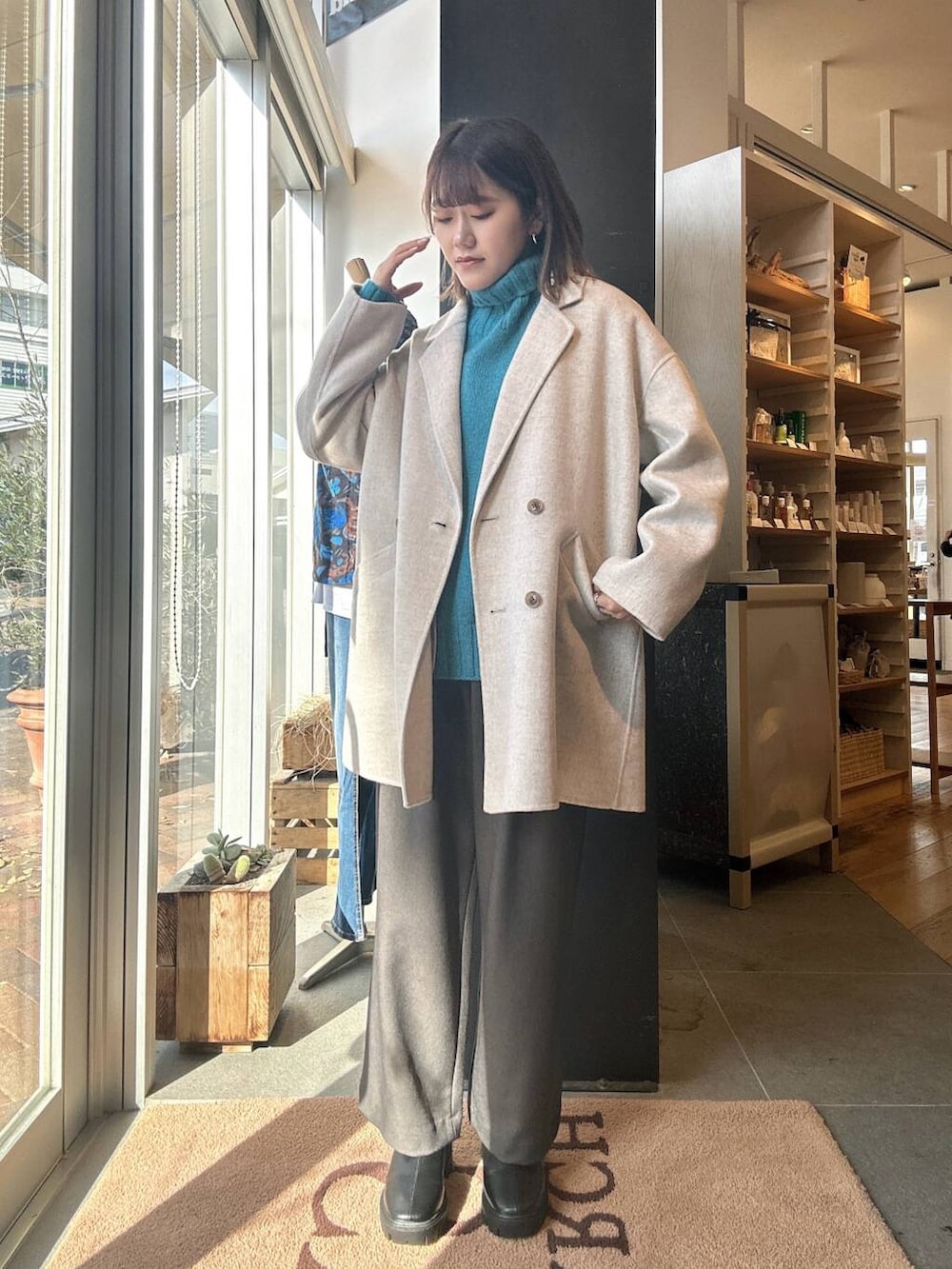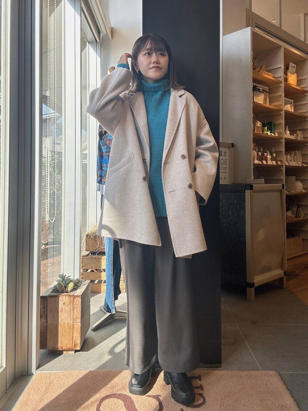 秋冬はアウターが落ち着いたカラーになりやすいため、トップスに色物を入れると顔周りが明る見えておすすめです✨