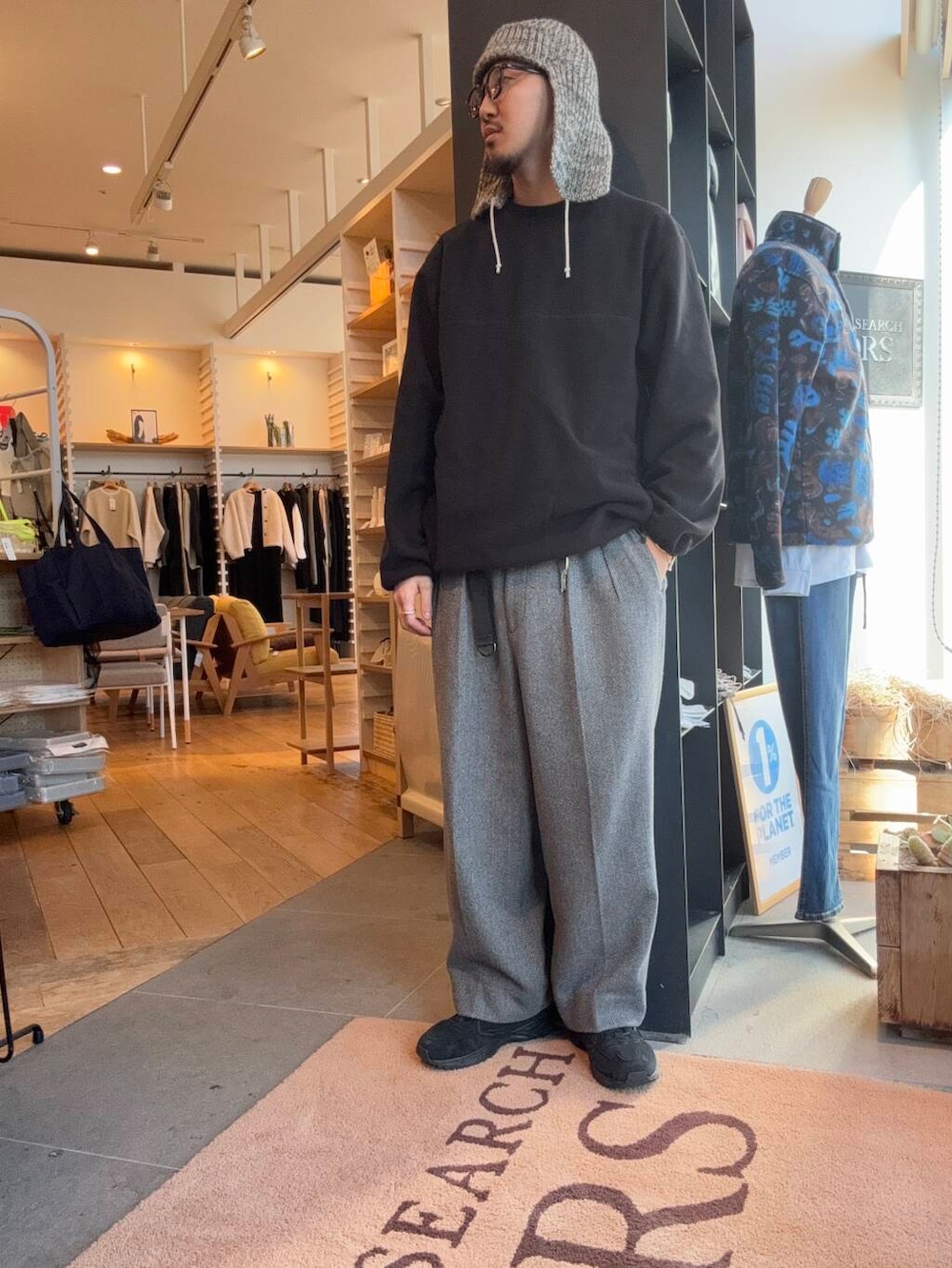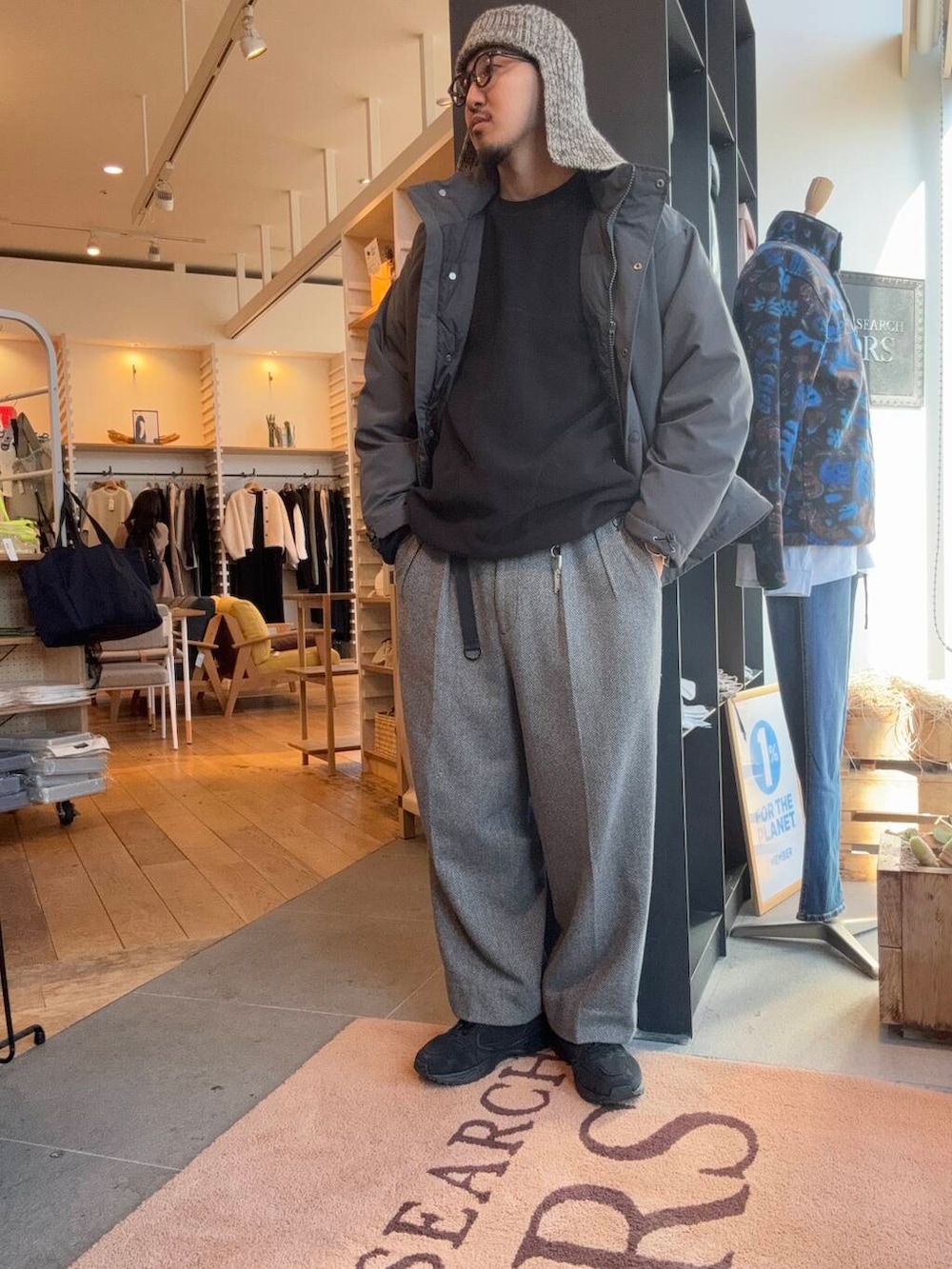グレーとブラックのシンプルなスタイリングに帽子でアクセントを加えたスタイリングです。