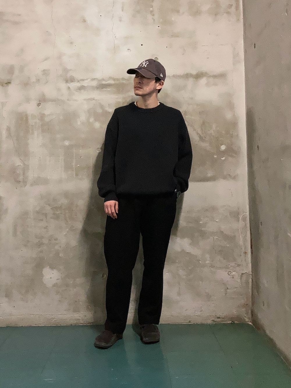 チンストラップ付きの、クラシックなバルマカーンだからこそ、イージーなパンツに、キャップでラフに。
