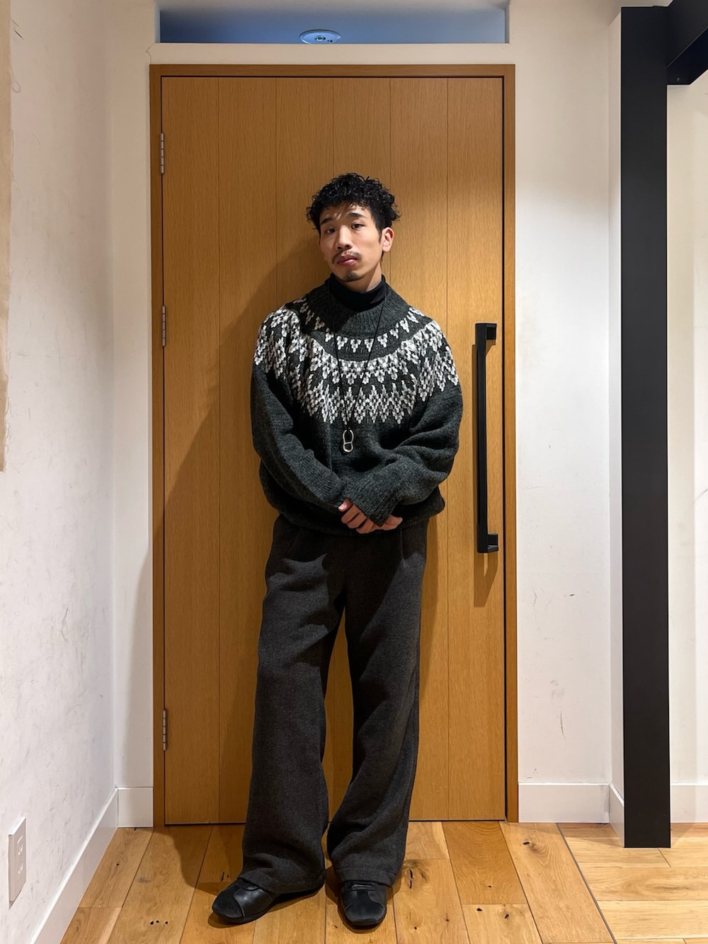 パンツにはオリジナルのジャガードワイドパンツを採用。抜け感と遊び心のあるスタイリングに仕上がりました。