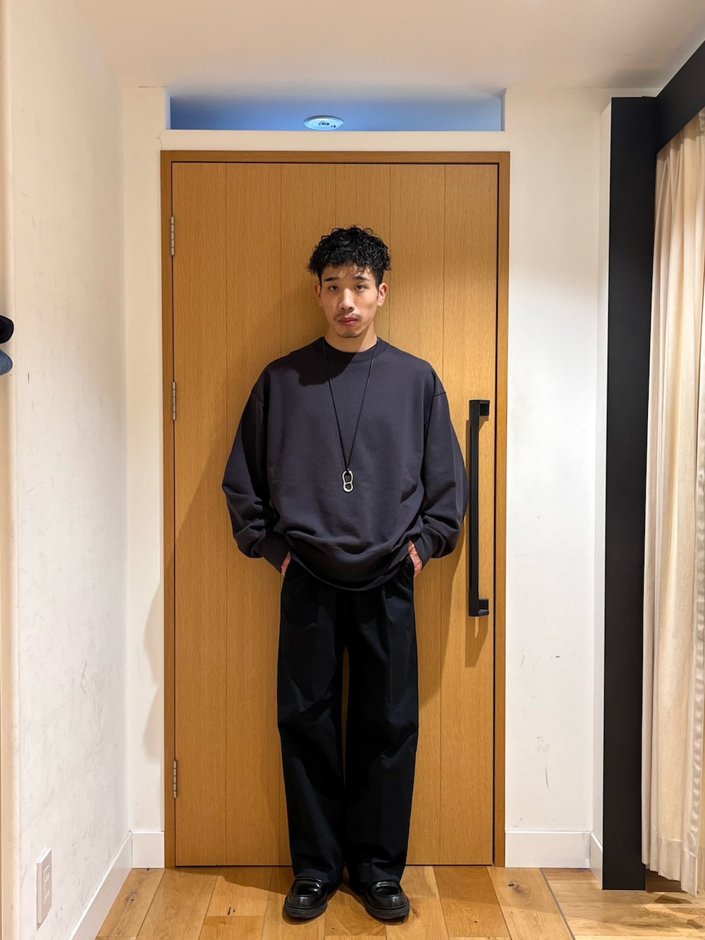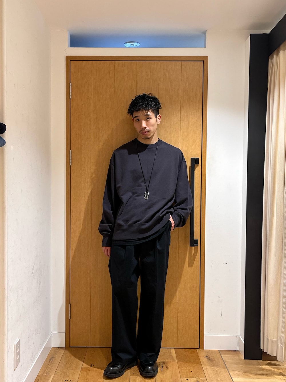 オーバーなシルエットのトップスにセンタープレスの入ったチノパンツを合わせ全体のバランスをとります。縦のラインを意識しつつも抜け感のある仕上がりになっています。