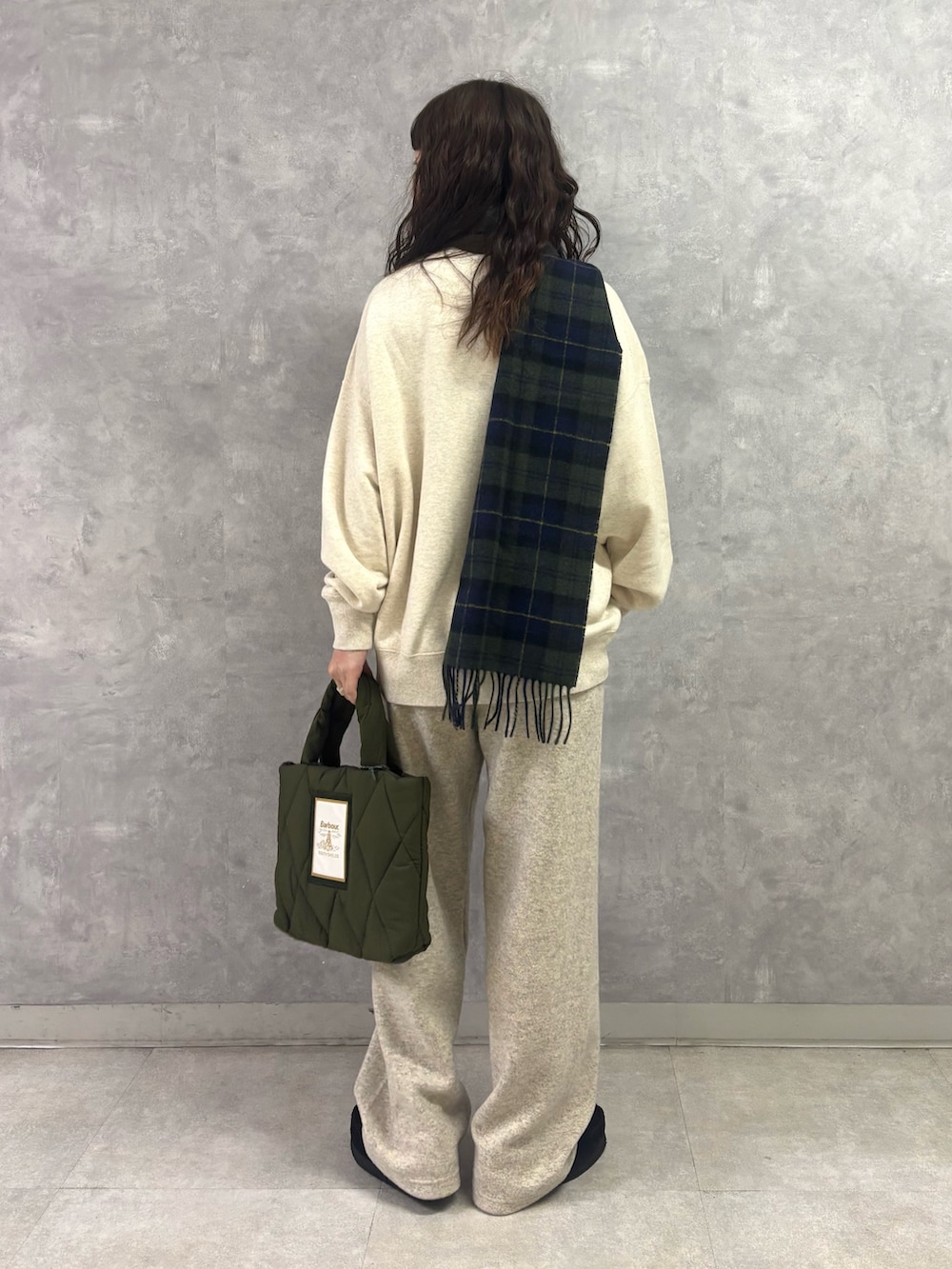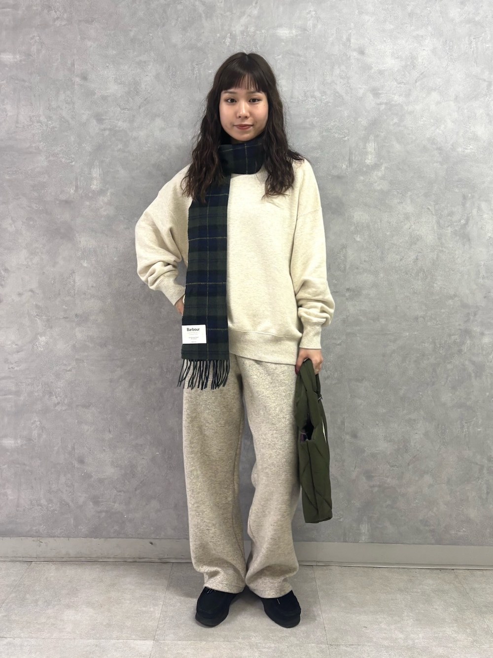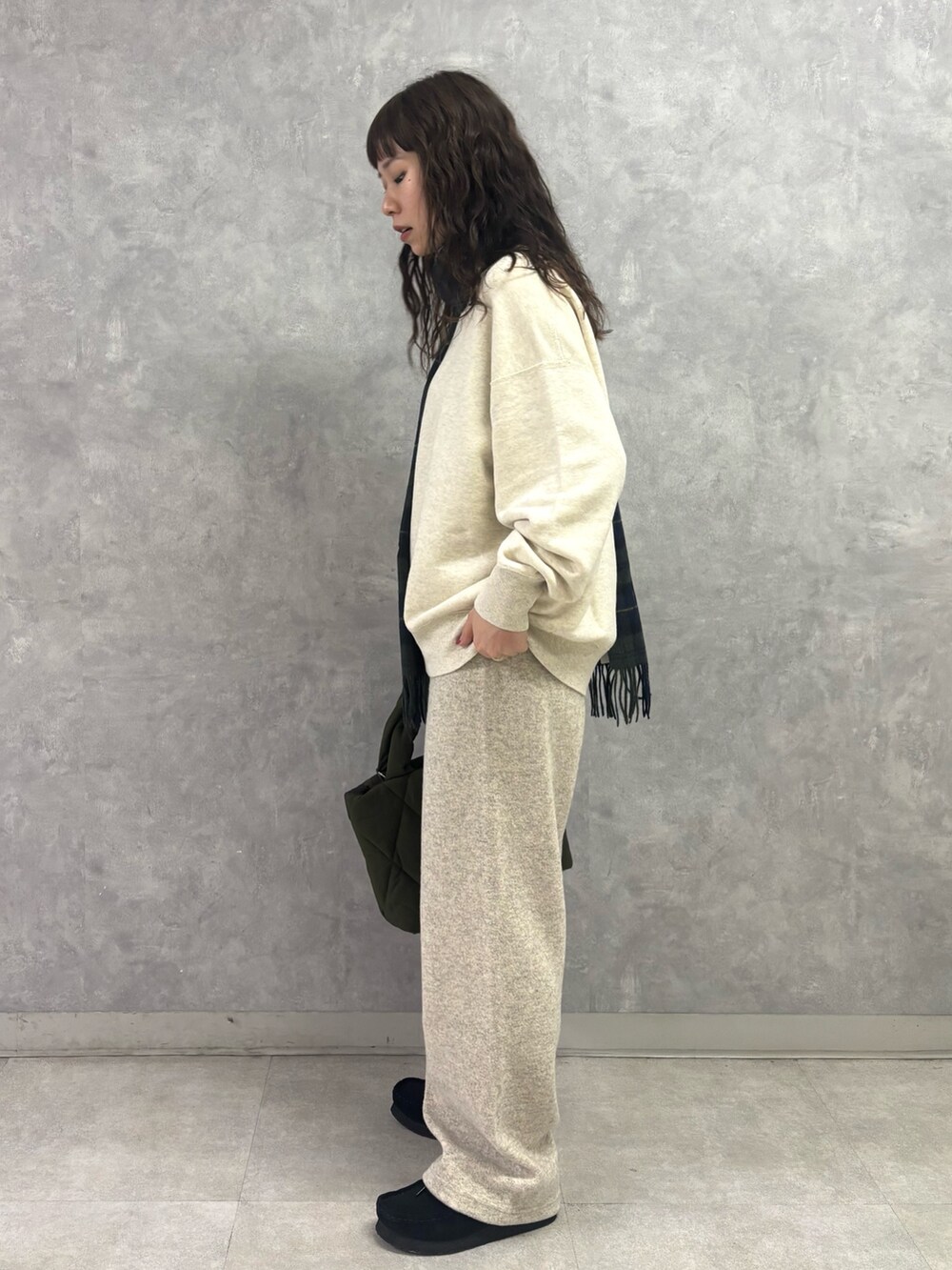 ボトムスの「ダブルフェイスイージーパンツ」は、ニット素材で暖かさがありつつ裏地はチクチク感のない綿素材。脚のラインを拾いにくい程よいゆるさがGOODです!