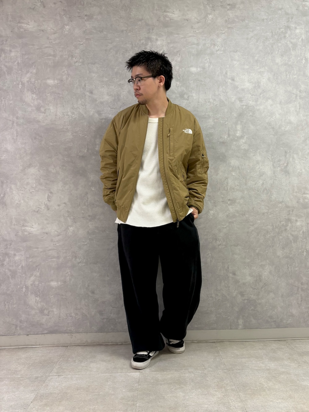 サイズ感もMでLくらいだと思っていただいて大丈夫です。中にスウェットなりフーディーなり厚手なのガンガンいけます。