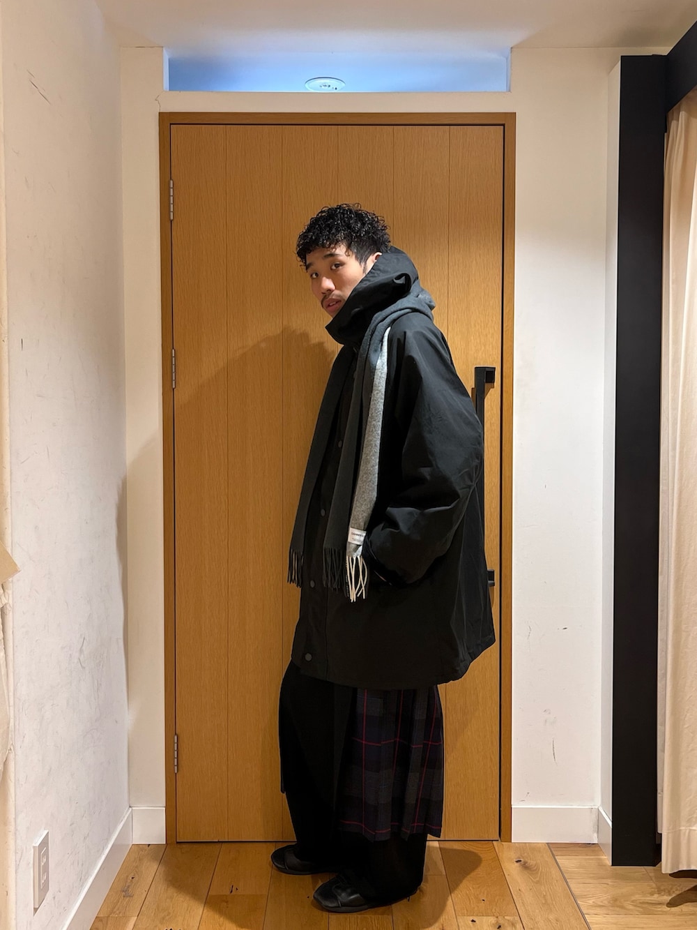 タータンチェックを使用した「O’NEILL」との別注アイテムのスカートとイギリスを代表するブランド「Barbour」との別注アイテムを合わせました。