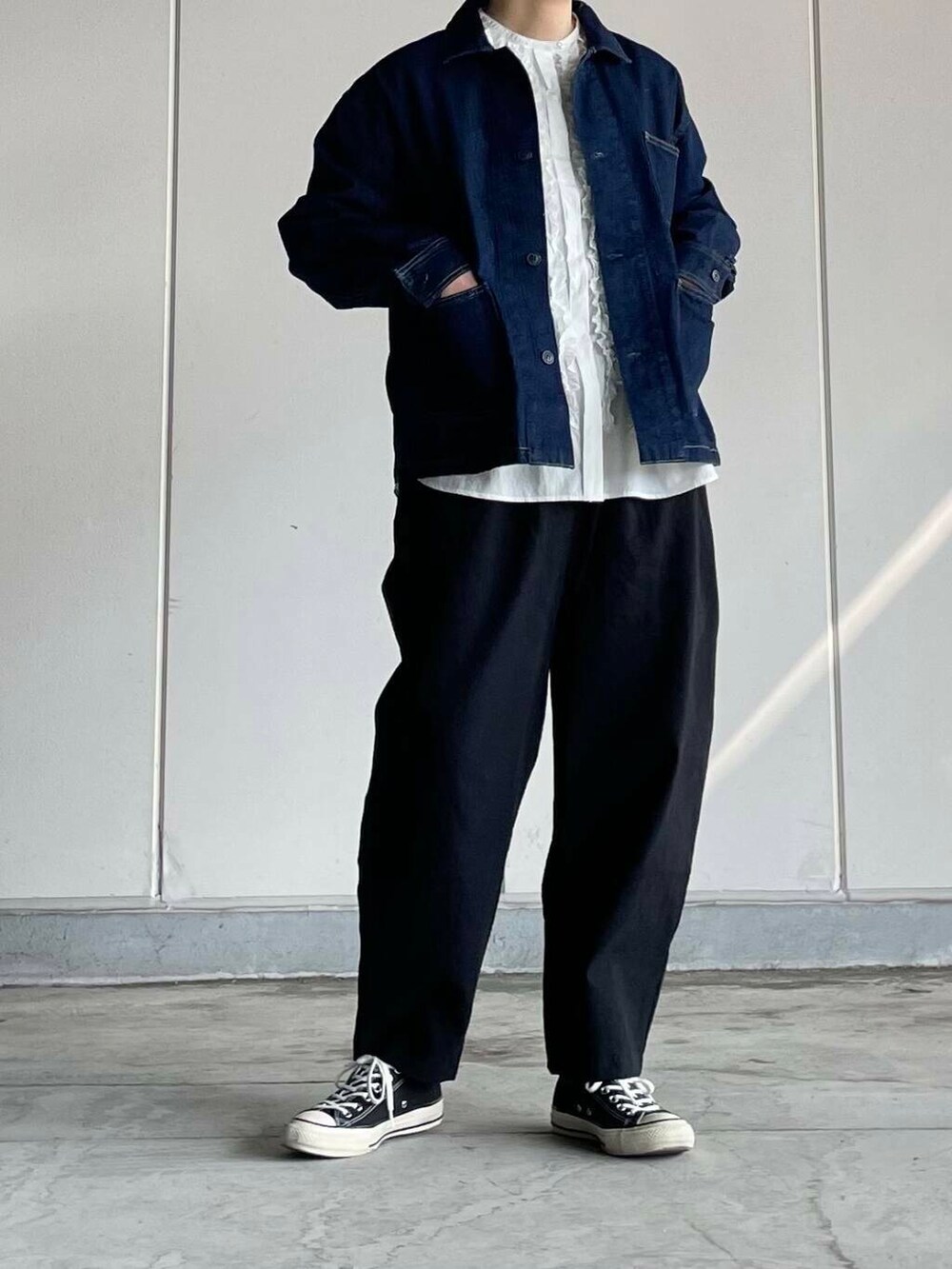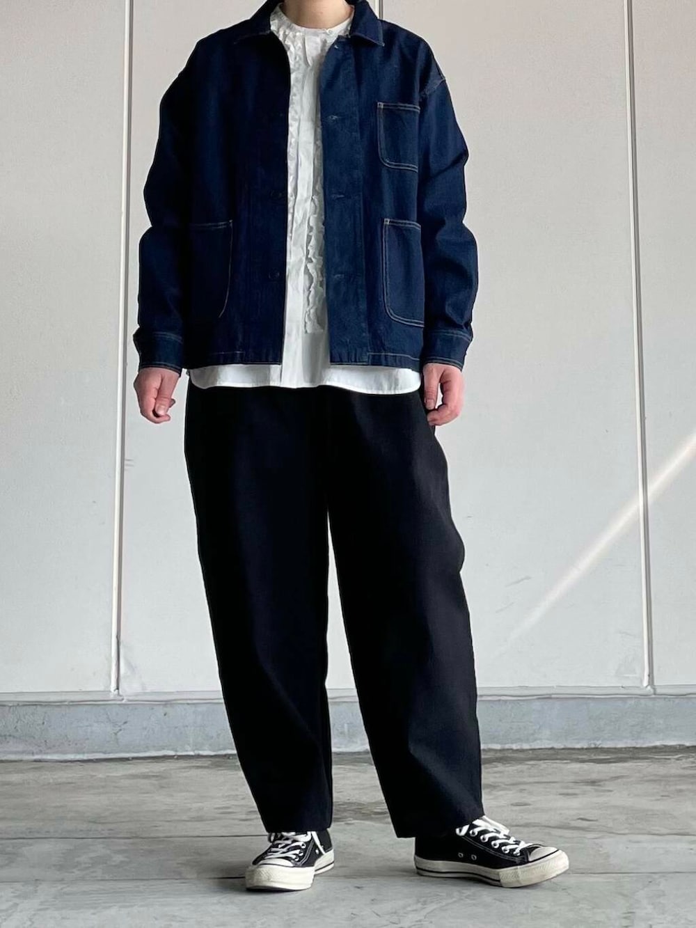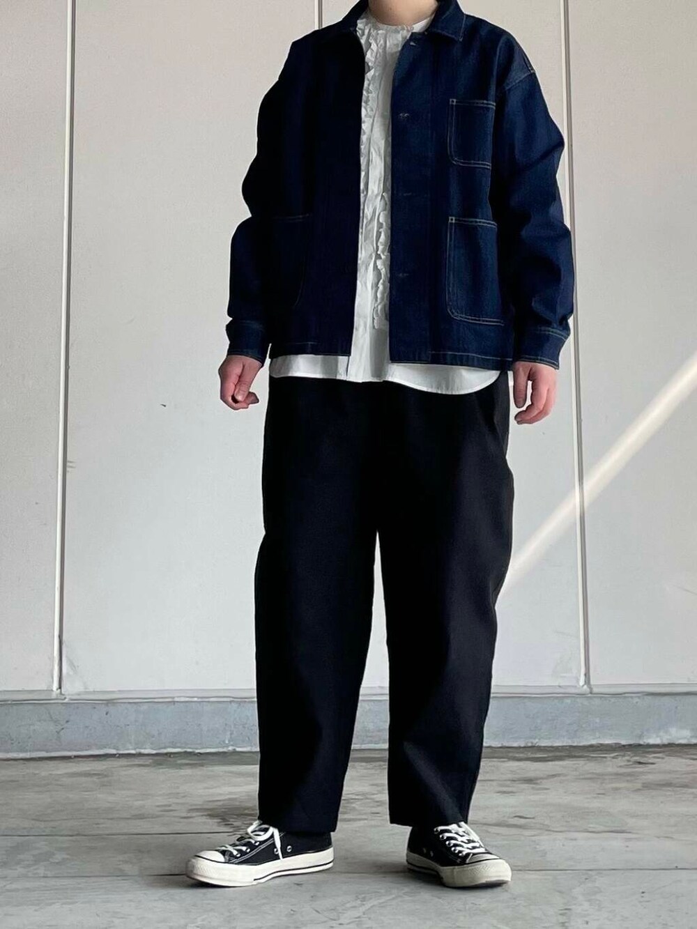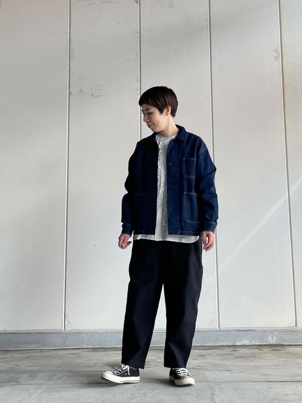 デニムのカバーオールはしっかりした生地感で羽織としてもトップス風に着ても◎