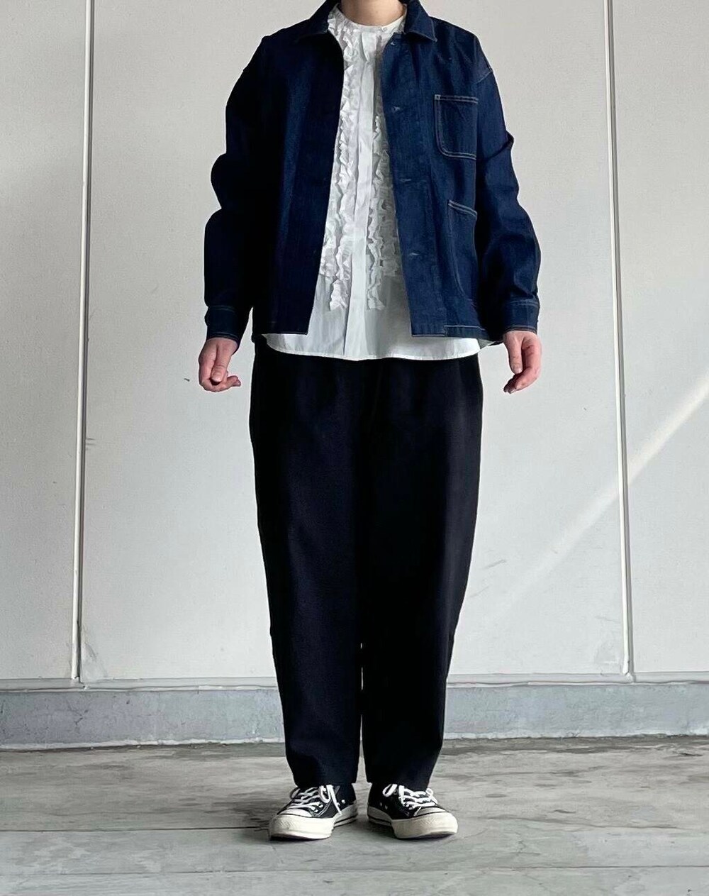 フリルブラウスはノーカラーで甘さも控えめですので、ジャケットやサロペットのインナーにもよさそうです。