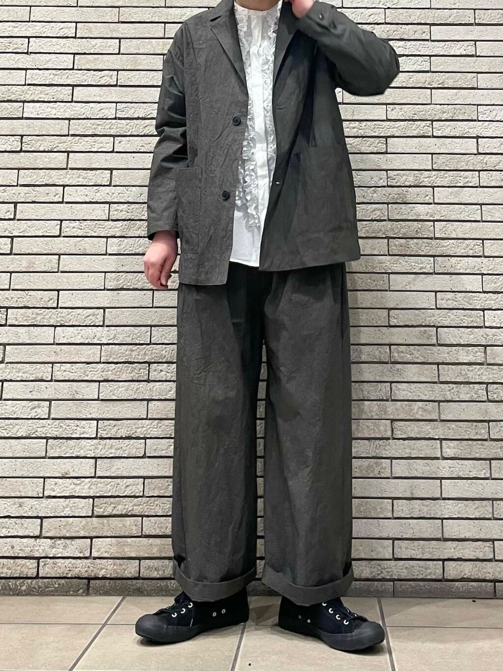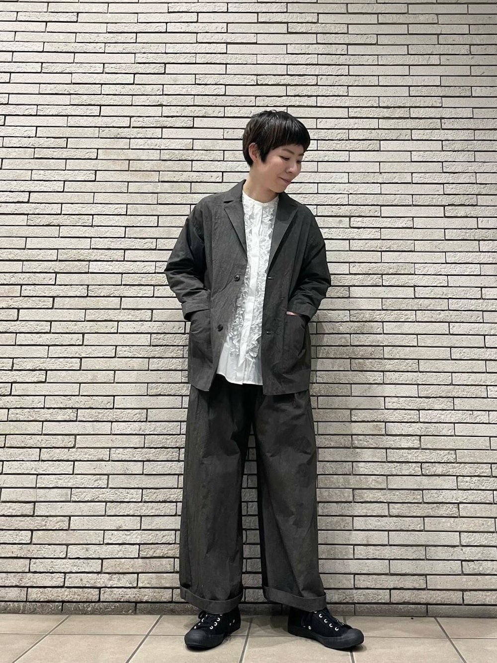 甘めのフリルシャツですが、セットアップでマニッシュな雰囲気にまとめてみました。