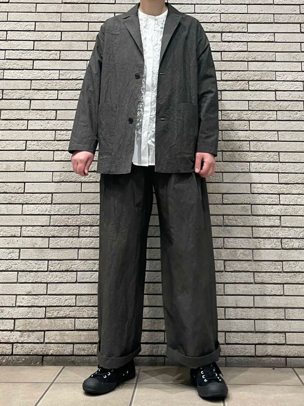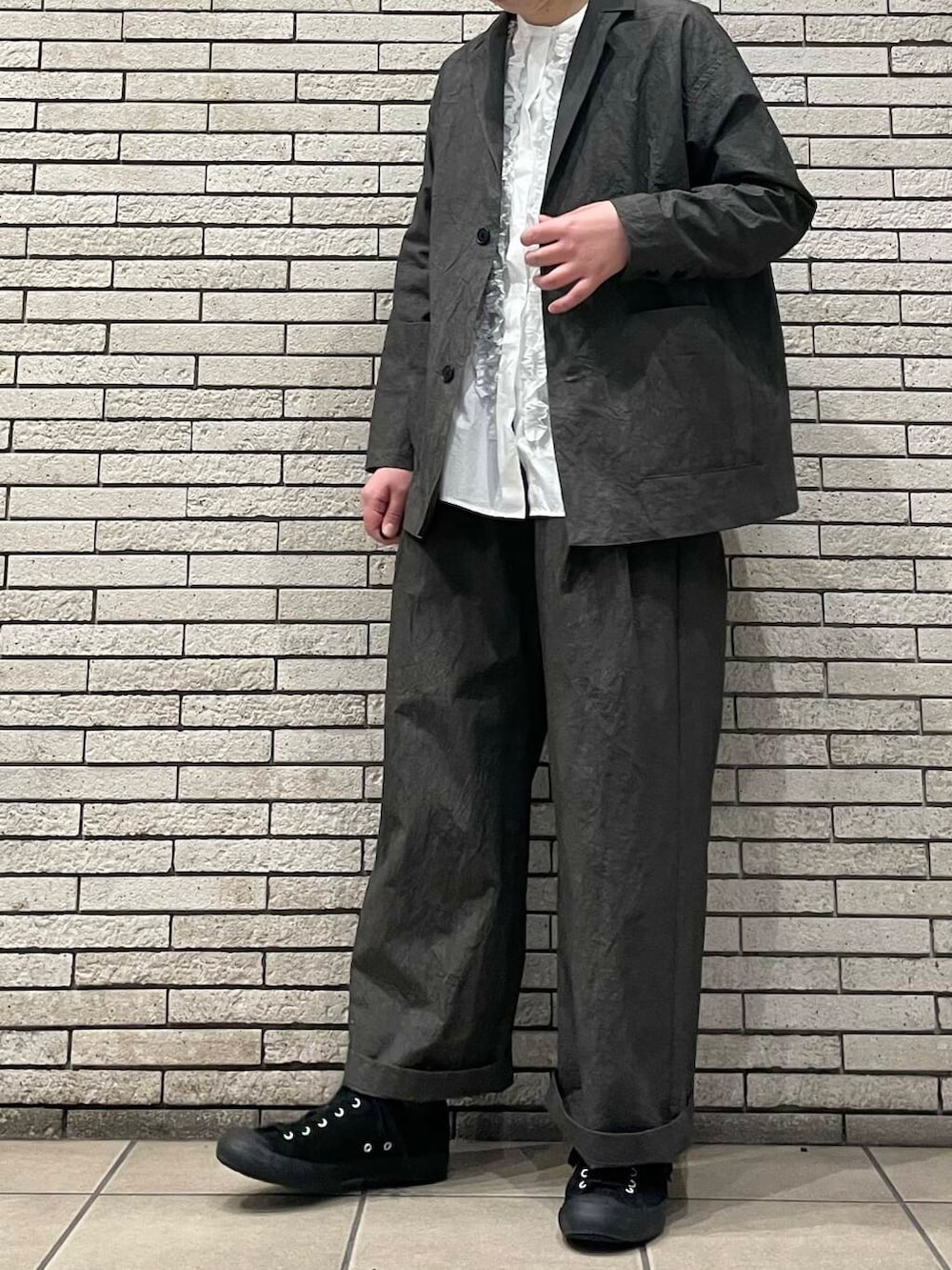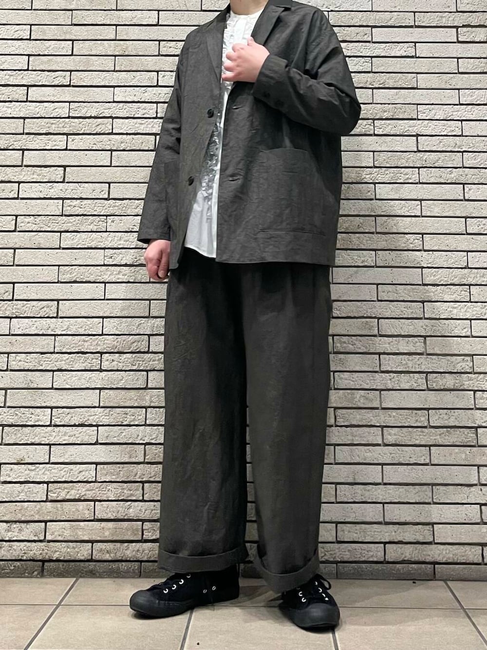 セットアップは、適度にハリのある生地感ですので、これからの季節に肌あたりもよく快適に着用いただけます。