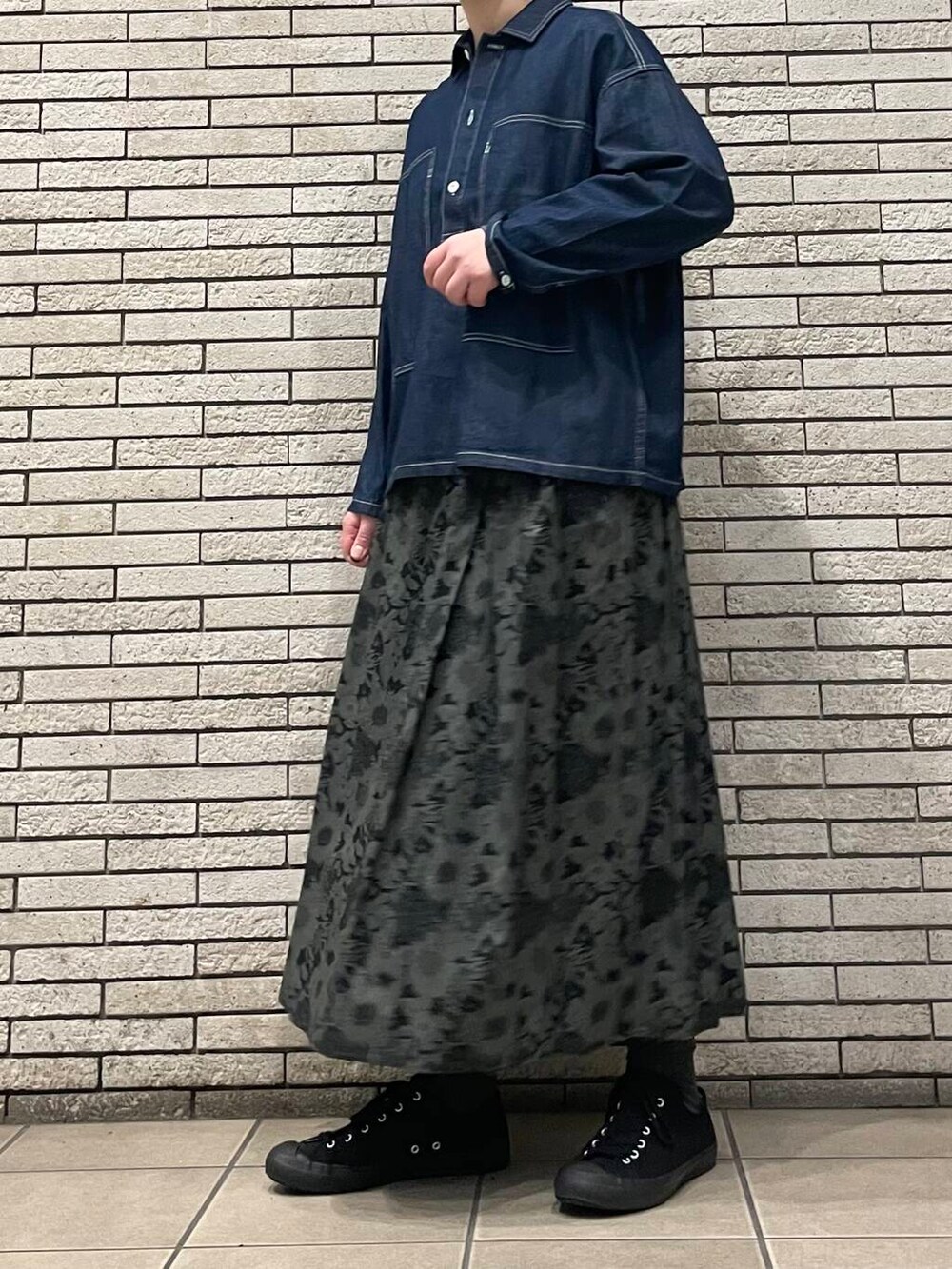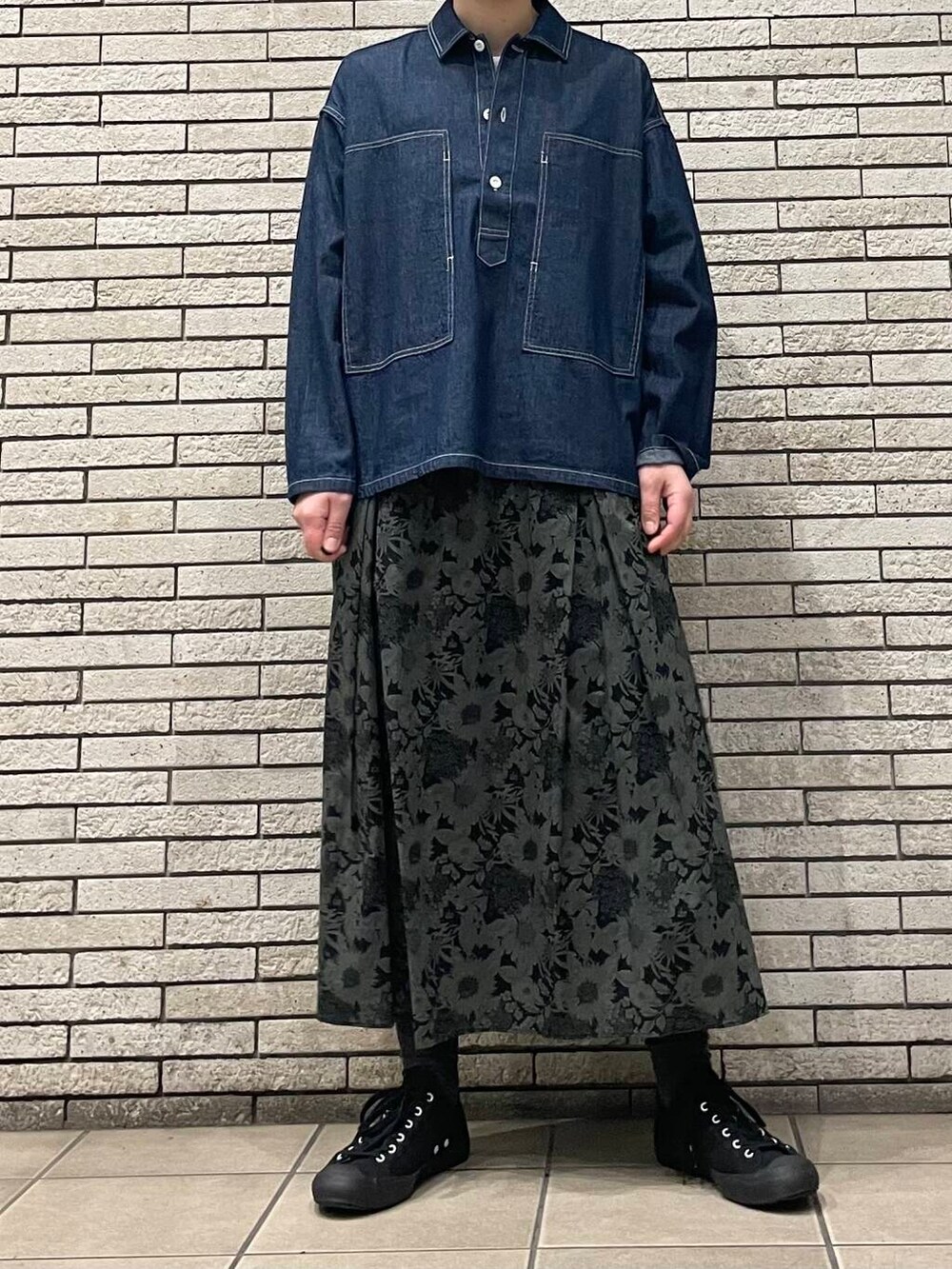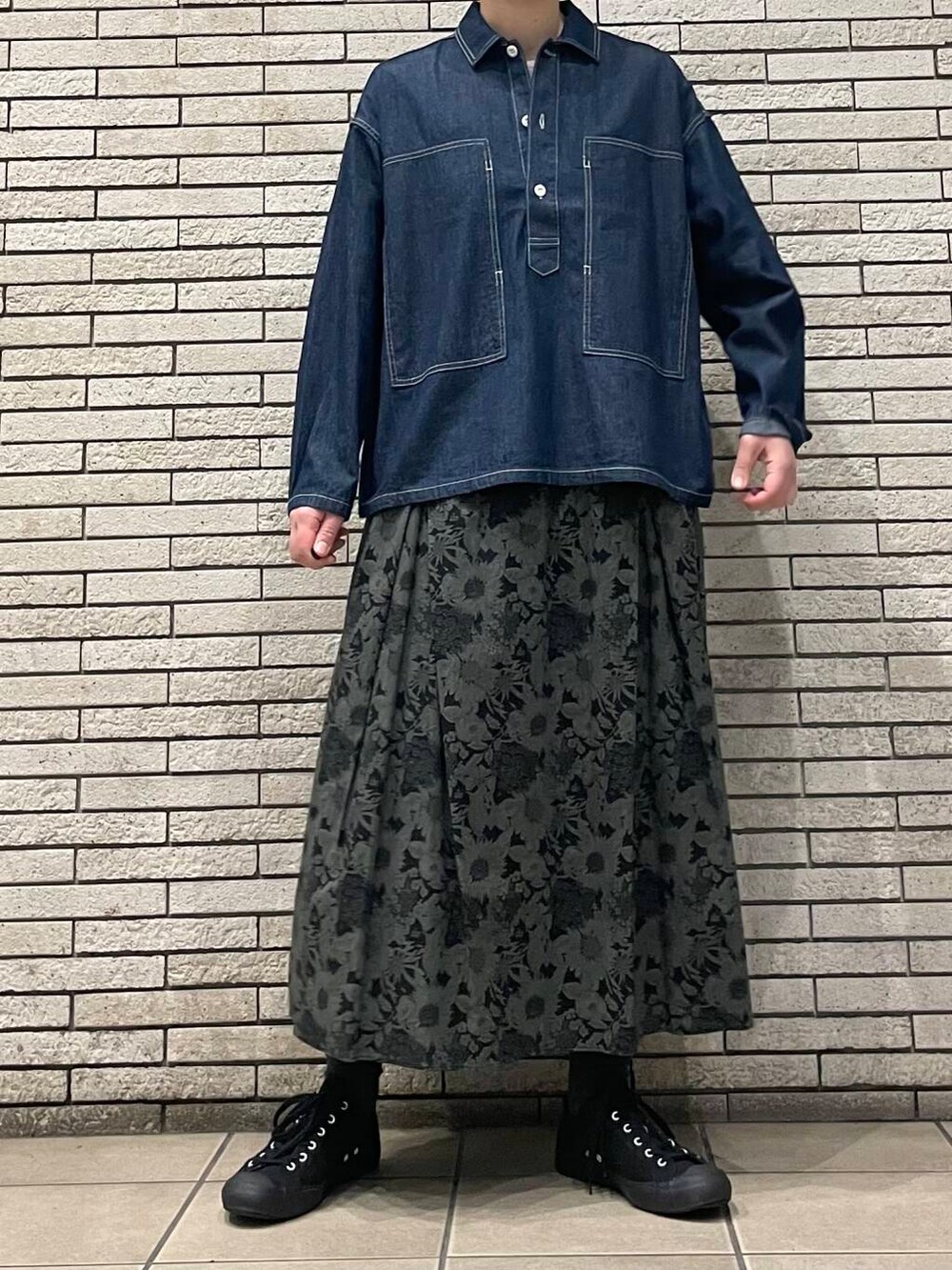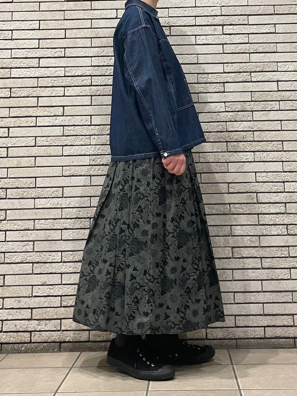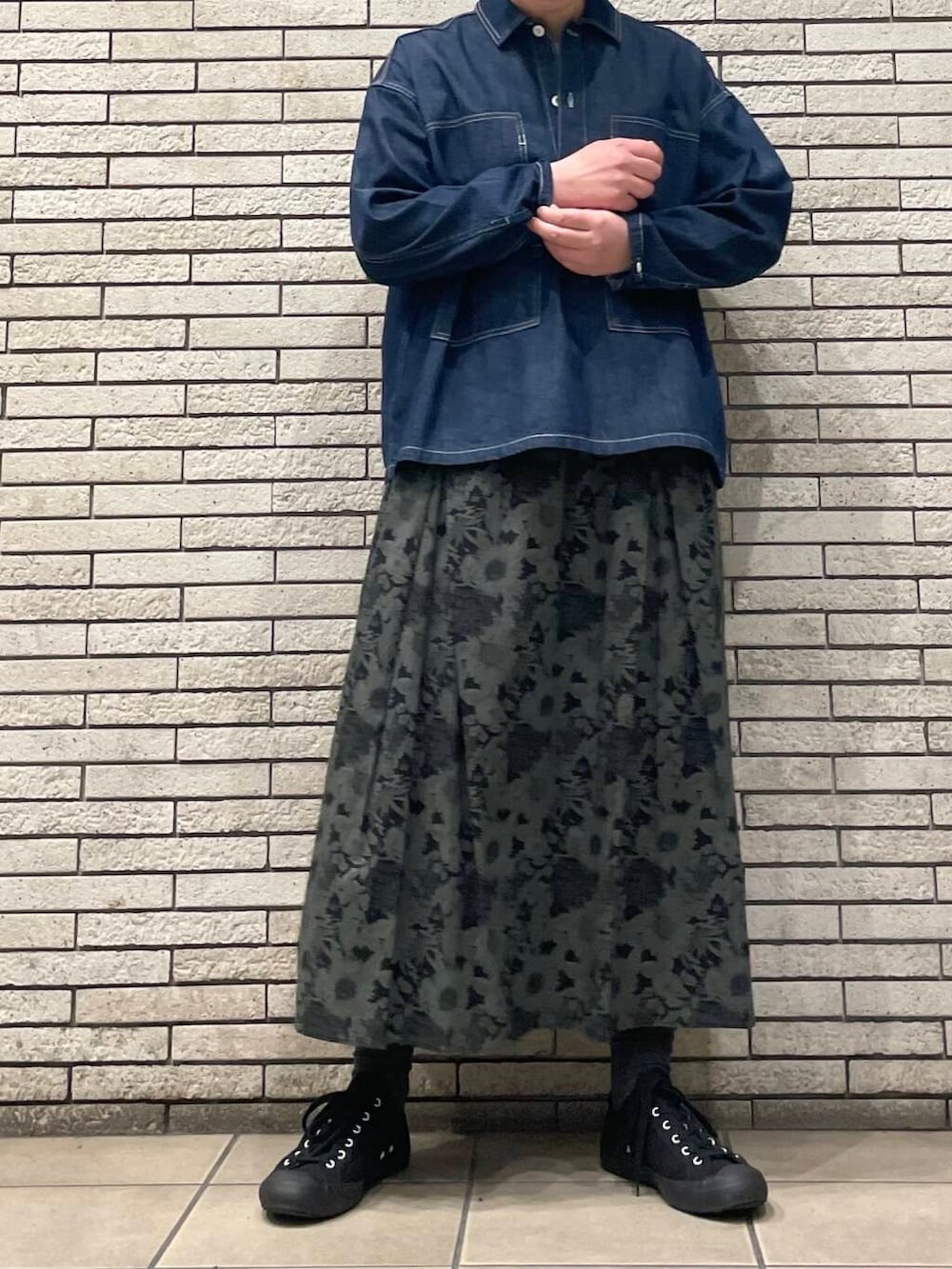 リバティプリントスカートにデニムシャツをあわせた大人カジュアルな装いです。