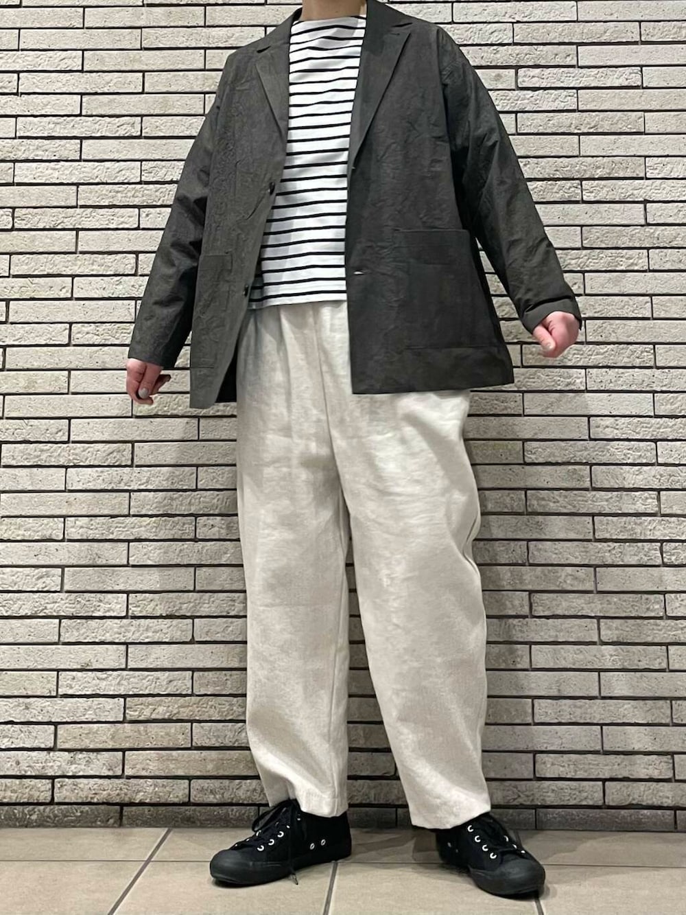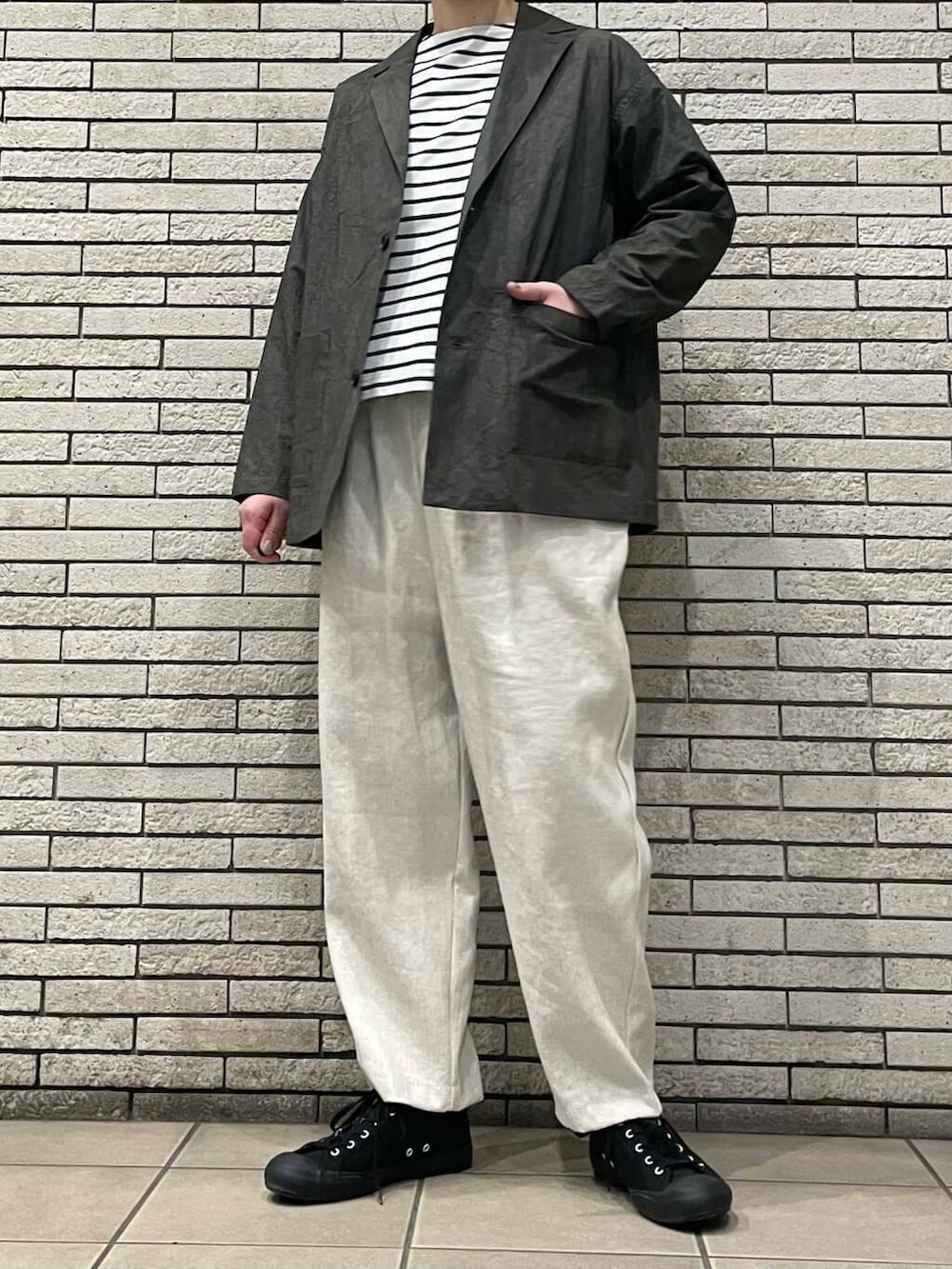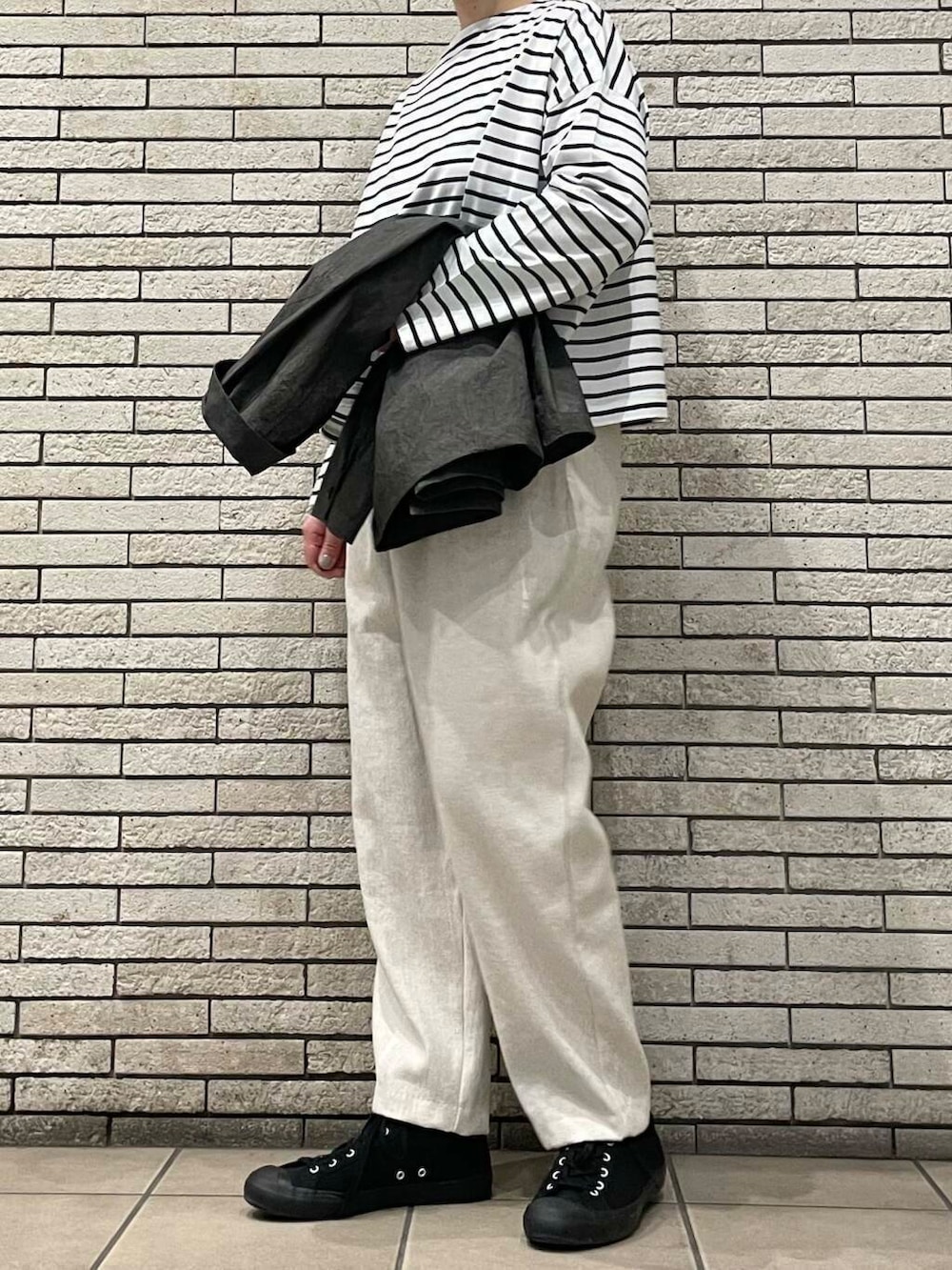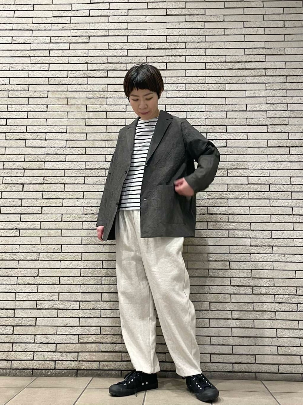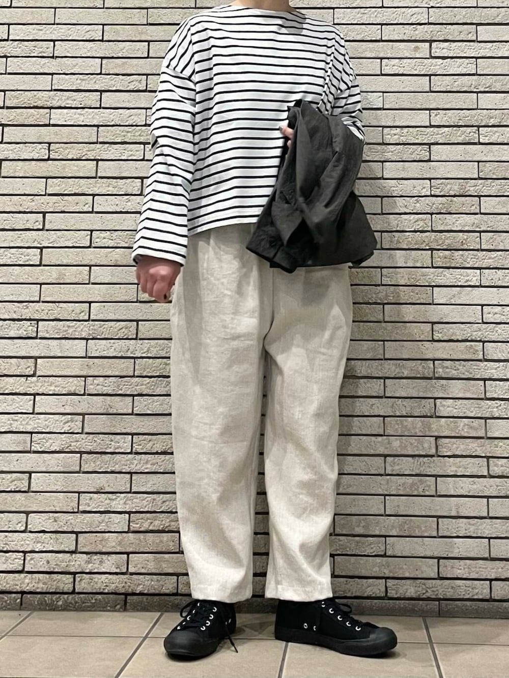 コットンリネンのパンツは肌あたりもよく、はきやすい1着です。