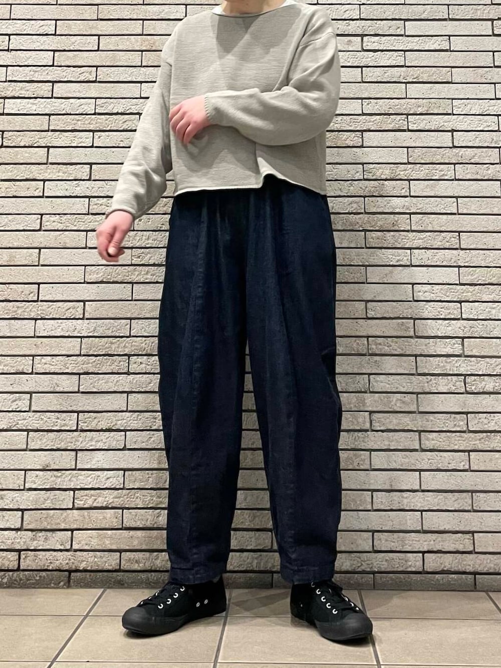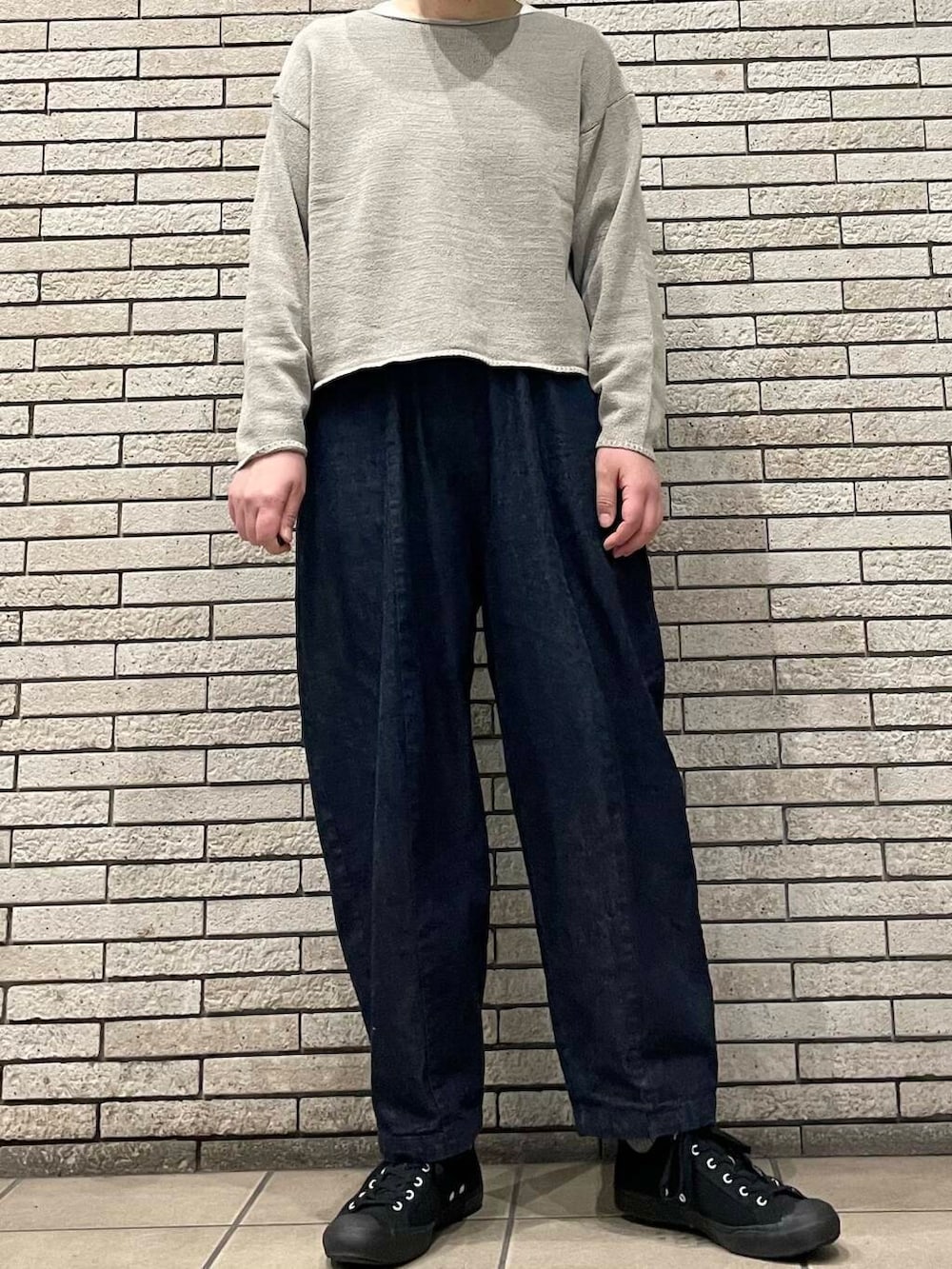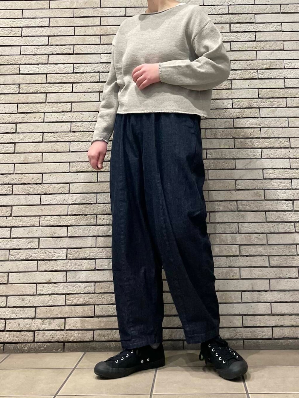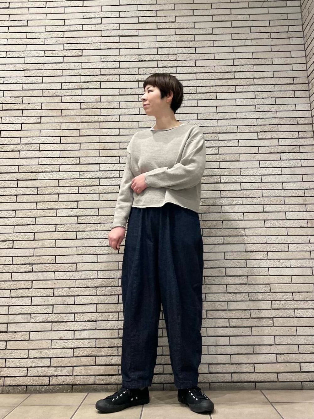 ニットは短めの丈感ですが、程よくゆとりのあるシルエットで着やすいです。