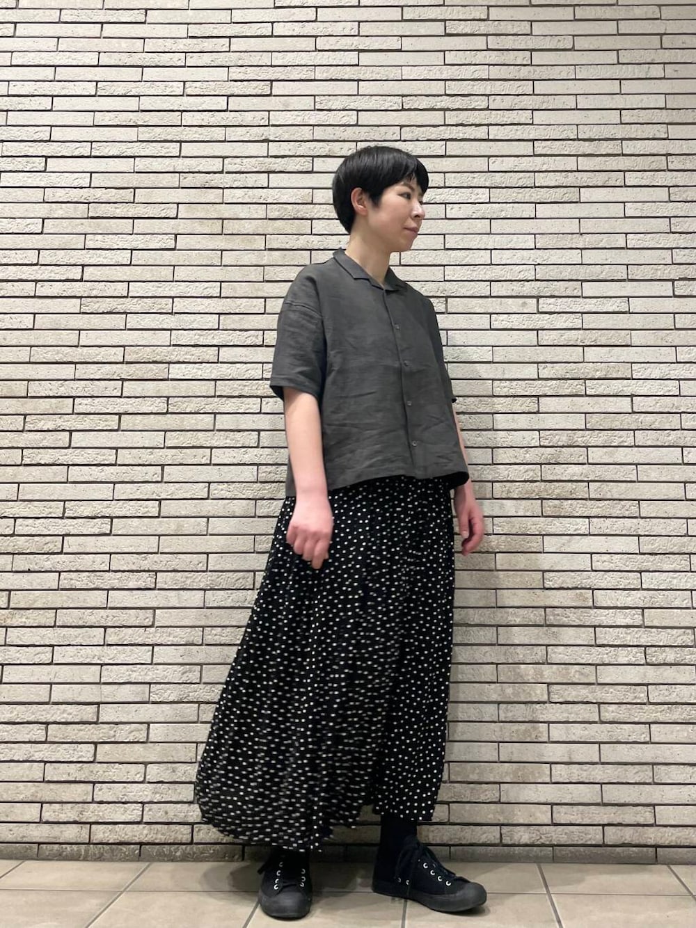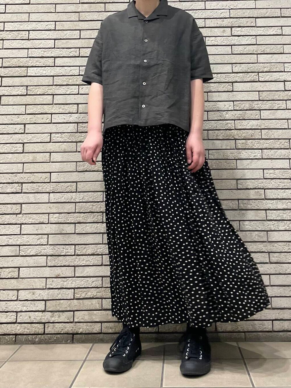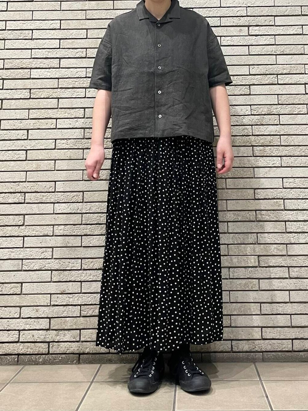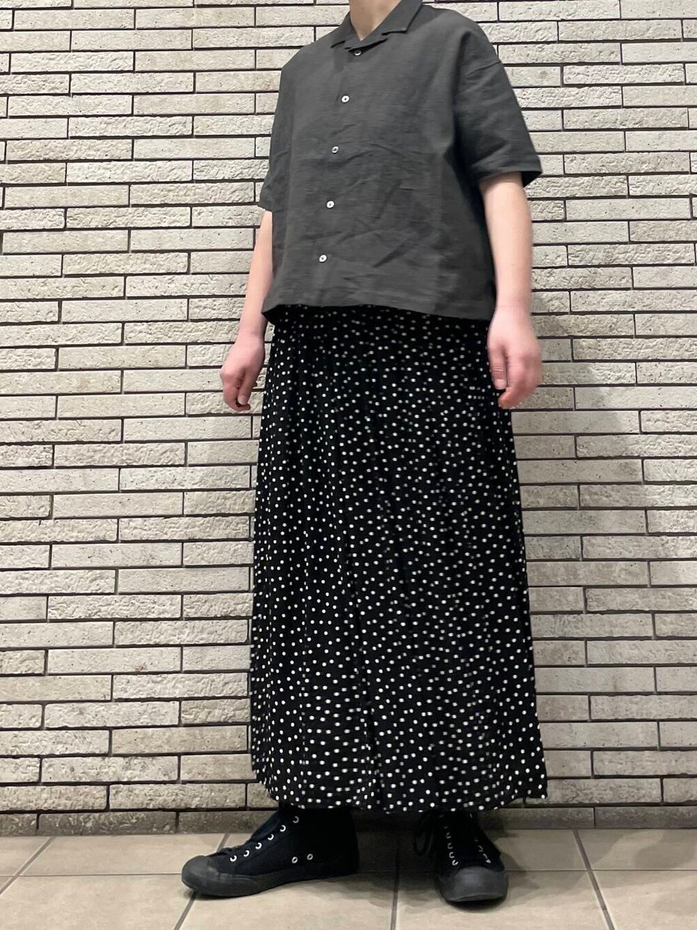 今回は、ドット柄のスカートとあわせてクラシカルな雰囲気に。スカートはサラッとした着心地でシーズン通して着用いただけます。