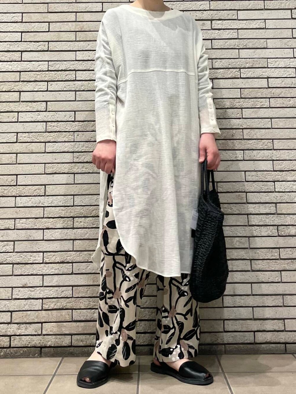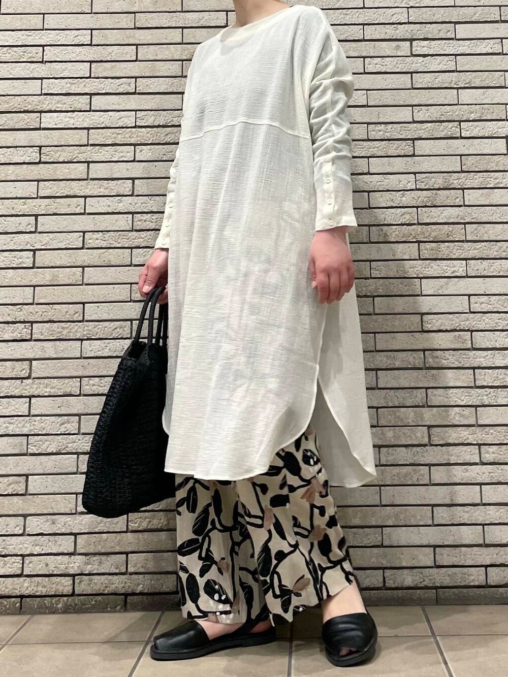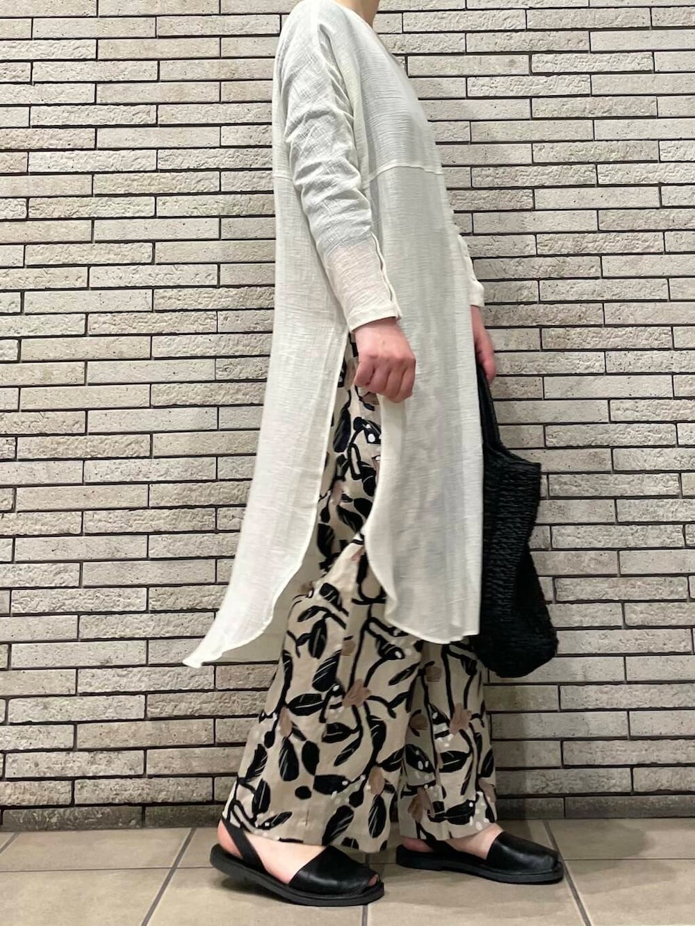 チュニックはガーゼ素材のやさしい肌心地です。ロング丈ですが、深いスリットが入っているため重たい印象になりません。柄のパンツとのレイヤードスタイルにおすすめです○
