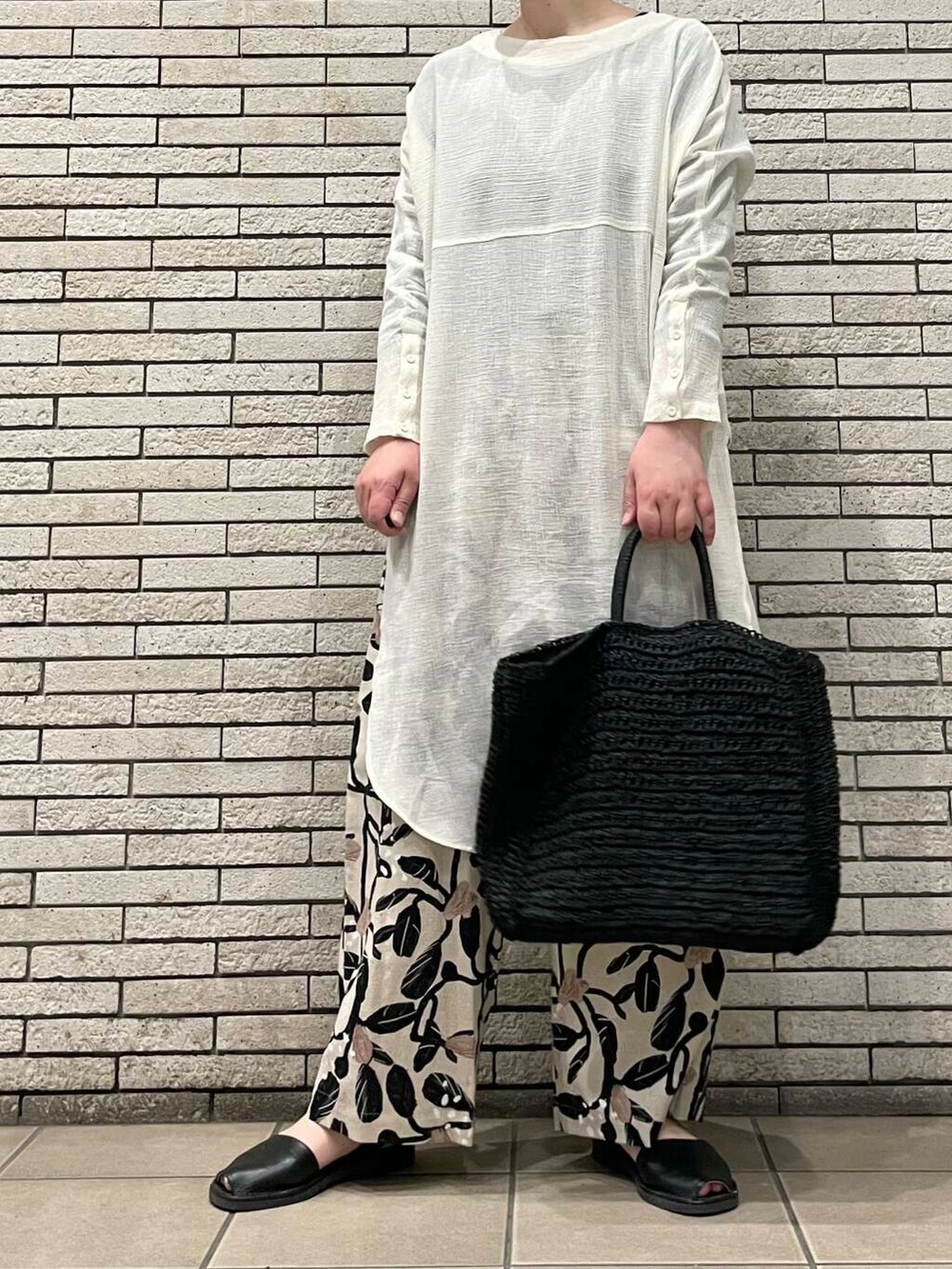 パンツは人気のプリントパンツです。今回はナチュラルな色合いでチュニックとのあわせに統一感をもたせました。小物はブラックで引き締めて。