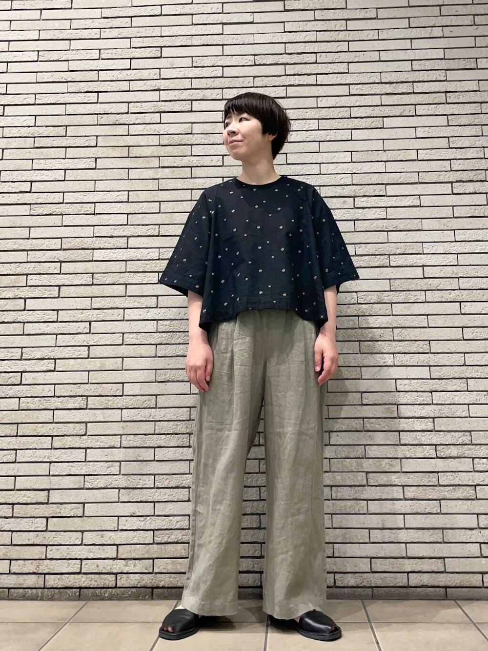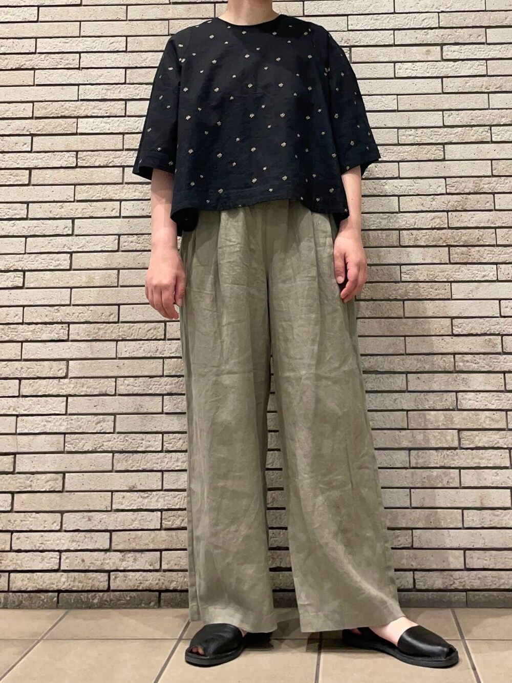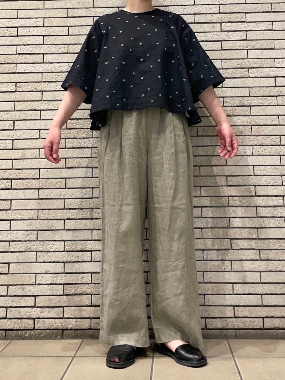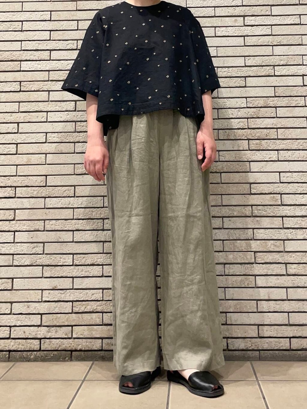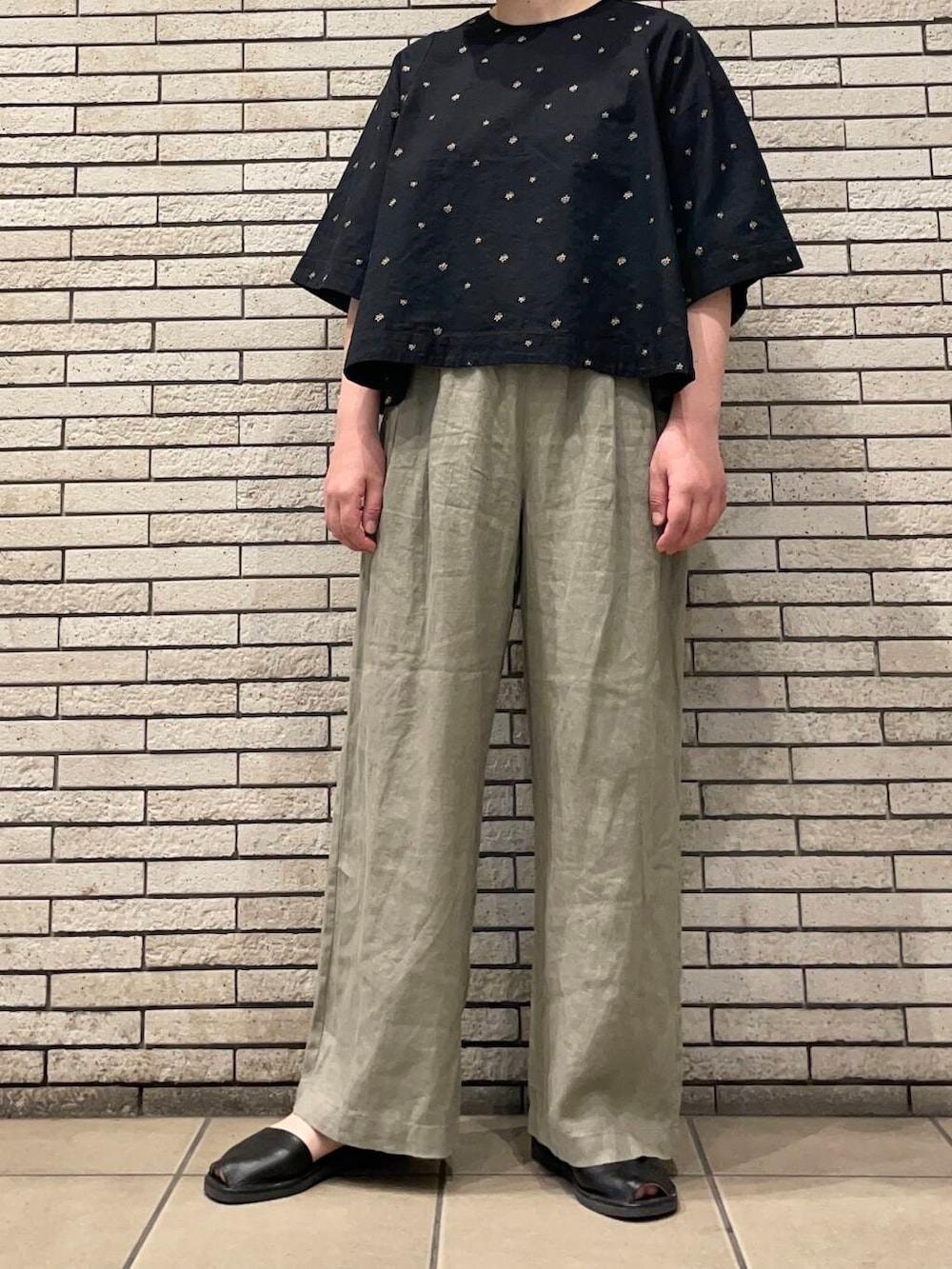 パンツはリネン素材でサラッとしています。落ち感があるきれいなシルエットはトップスを選びません。店頭でも大変人気の1着です。