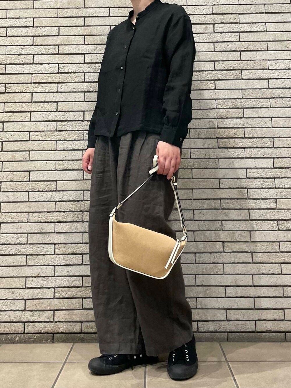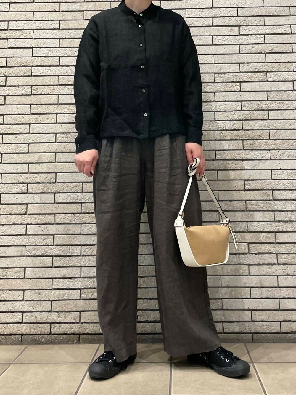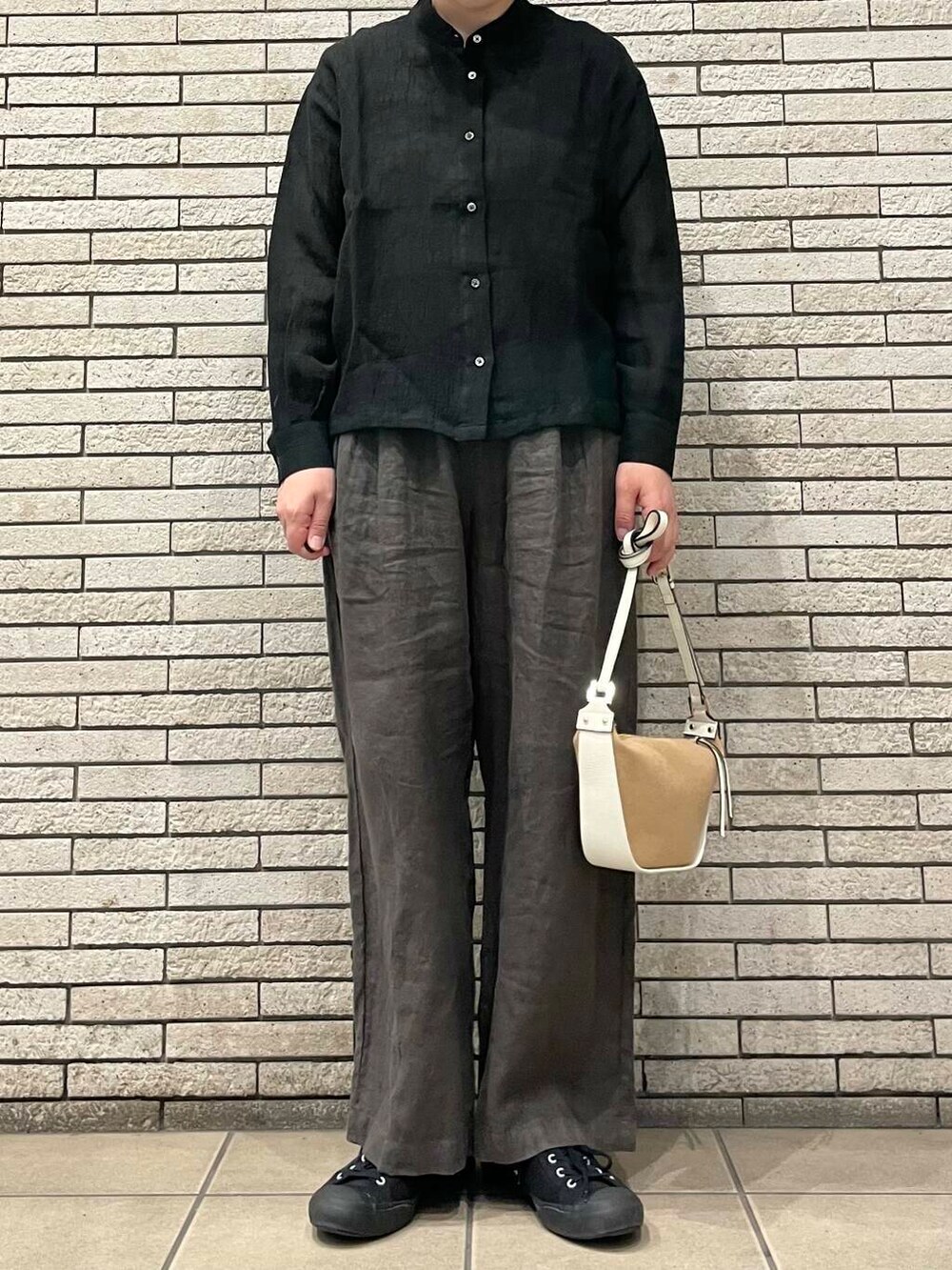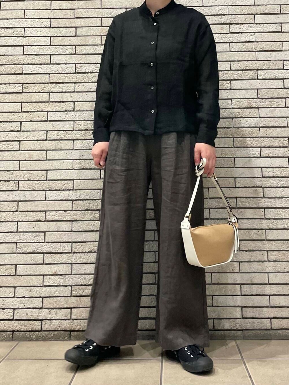 ボトムは、店頭でも人気のリネンイージーパンツです。チャコールの色合いがきれいですので、ちょっとキレイ目なトップスともナチュラルに合わせていただけます。これからの季節にストレスフリーで着用いただけます。
