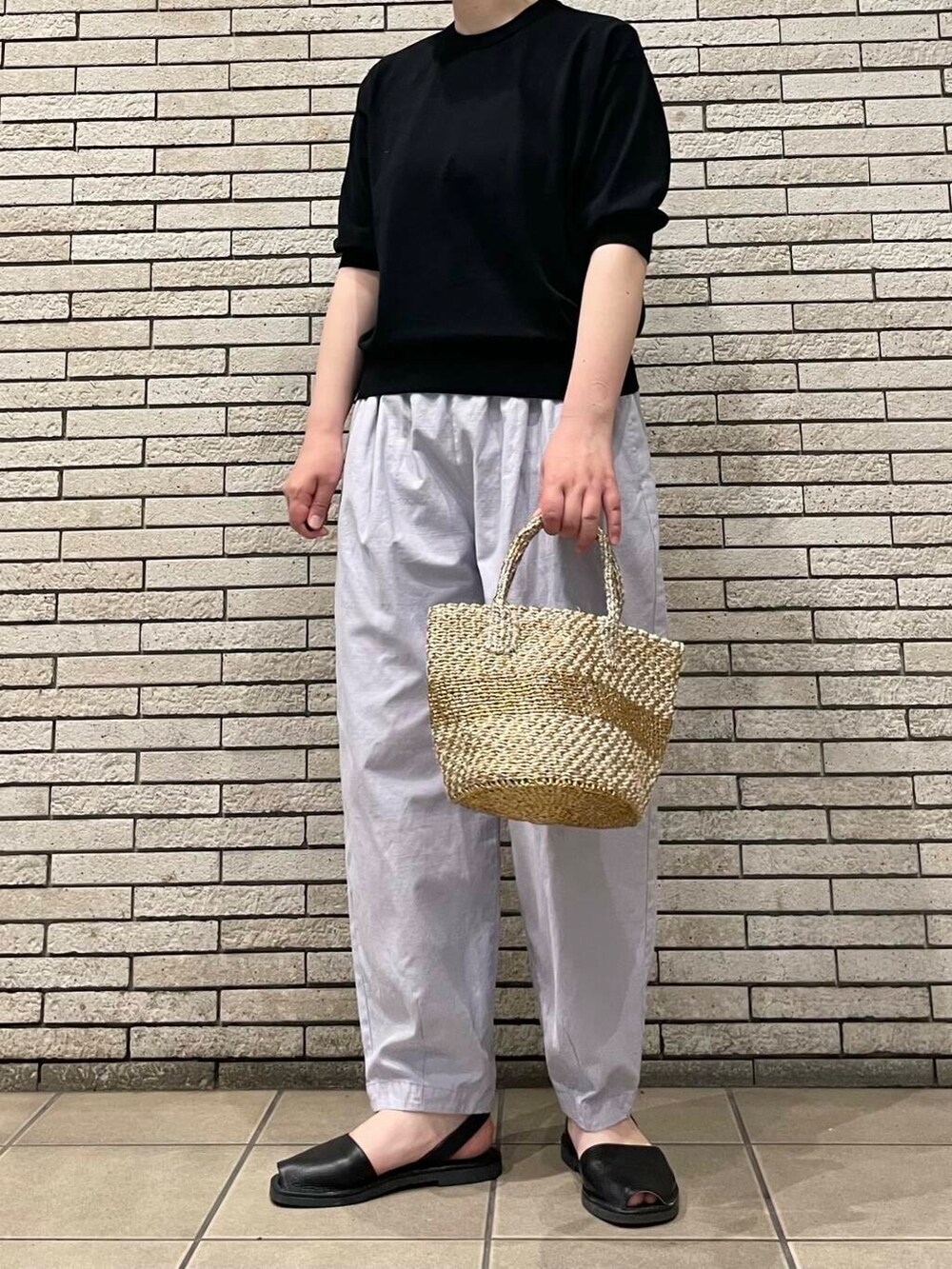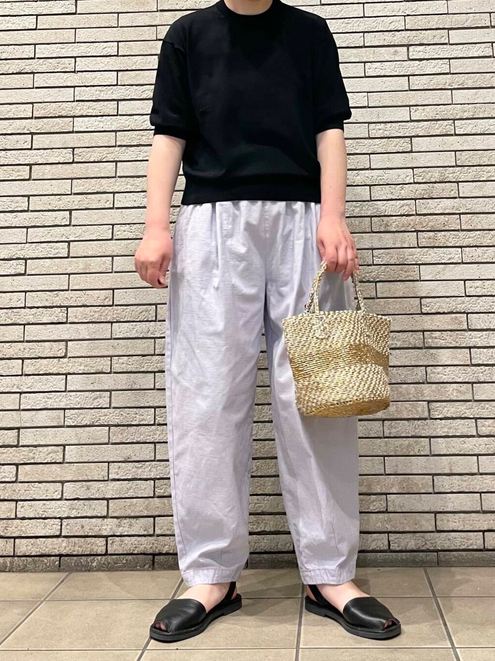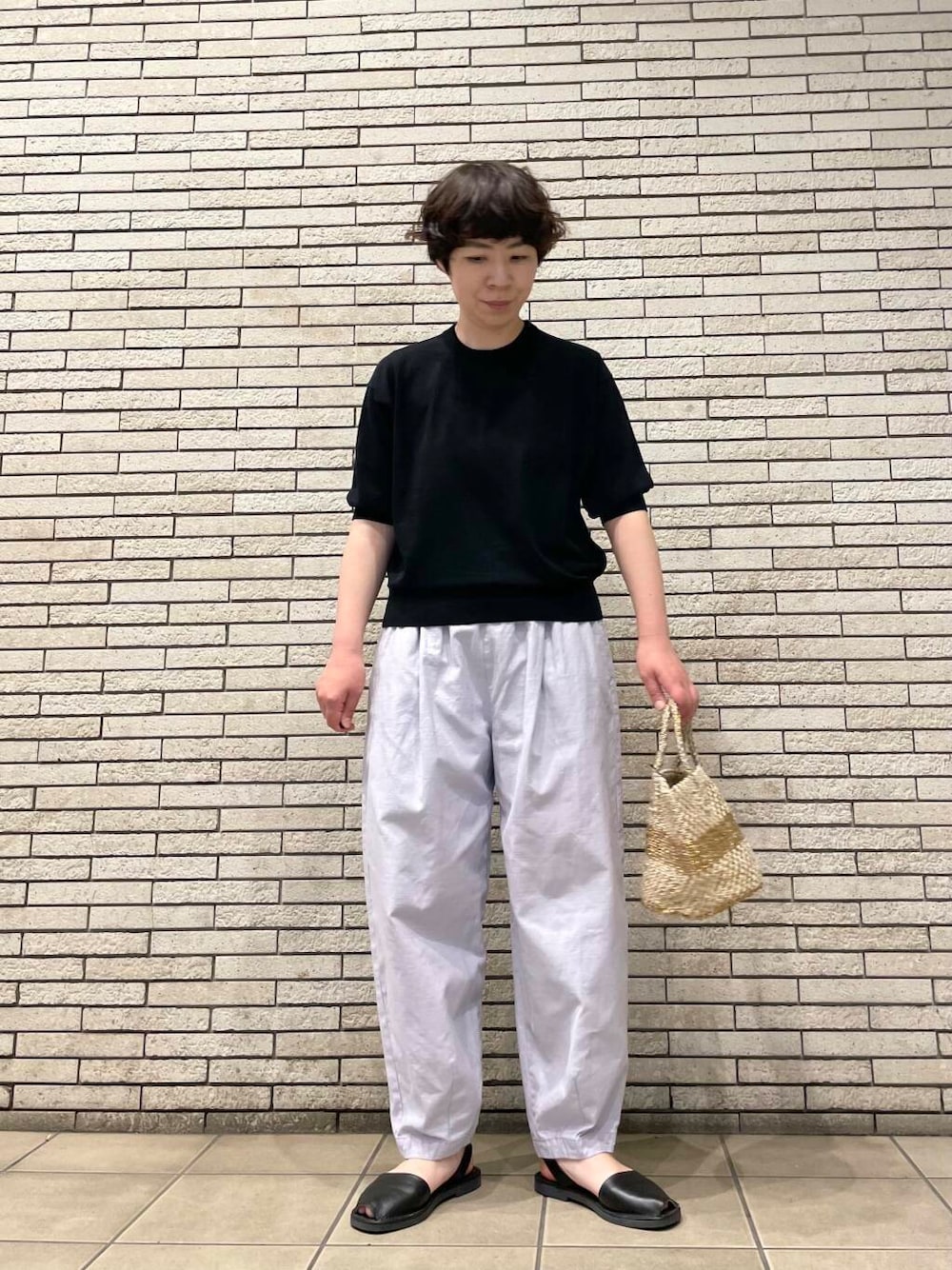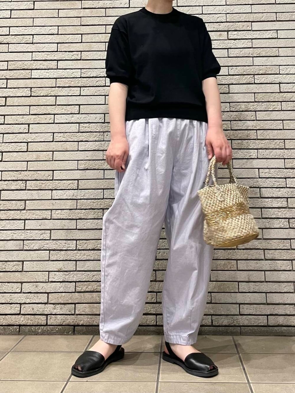 パンツは丸みのあるシルエットがかわいいです。淡いラベンダーの色合いがキレイな1着。今回はブラックのトップスを合わせてめりはりのあるスタイリングに◎