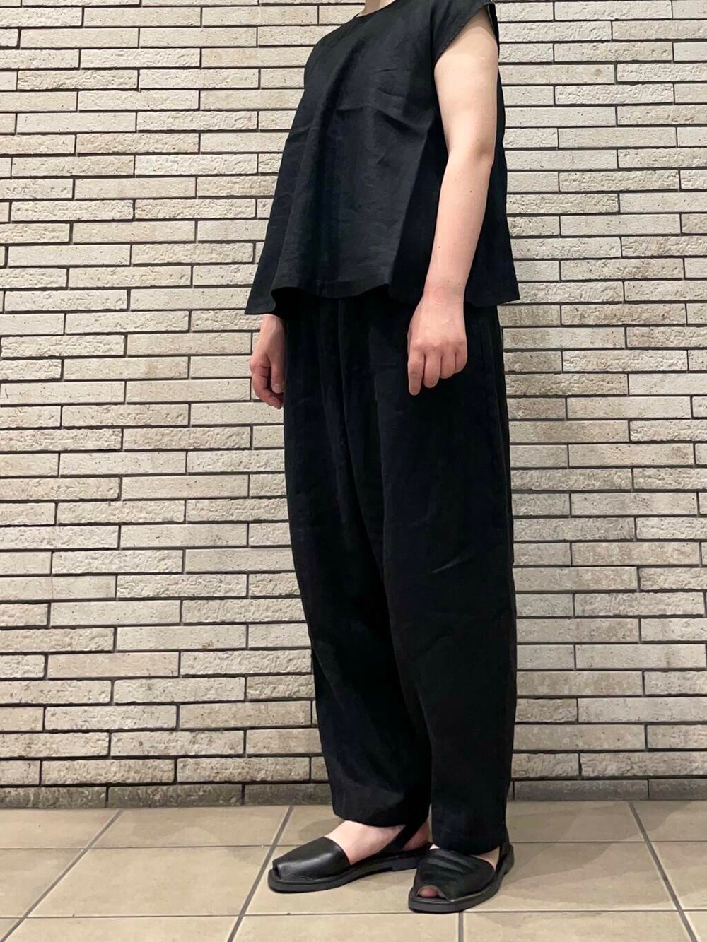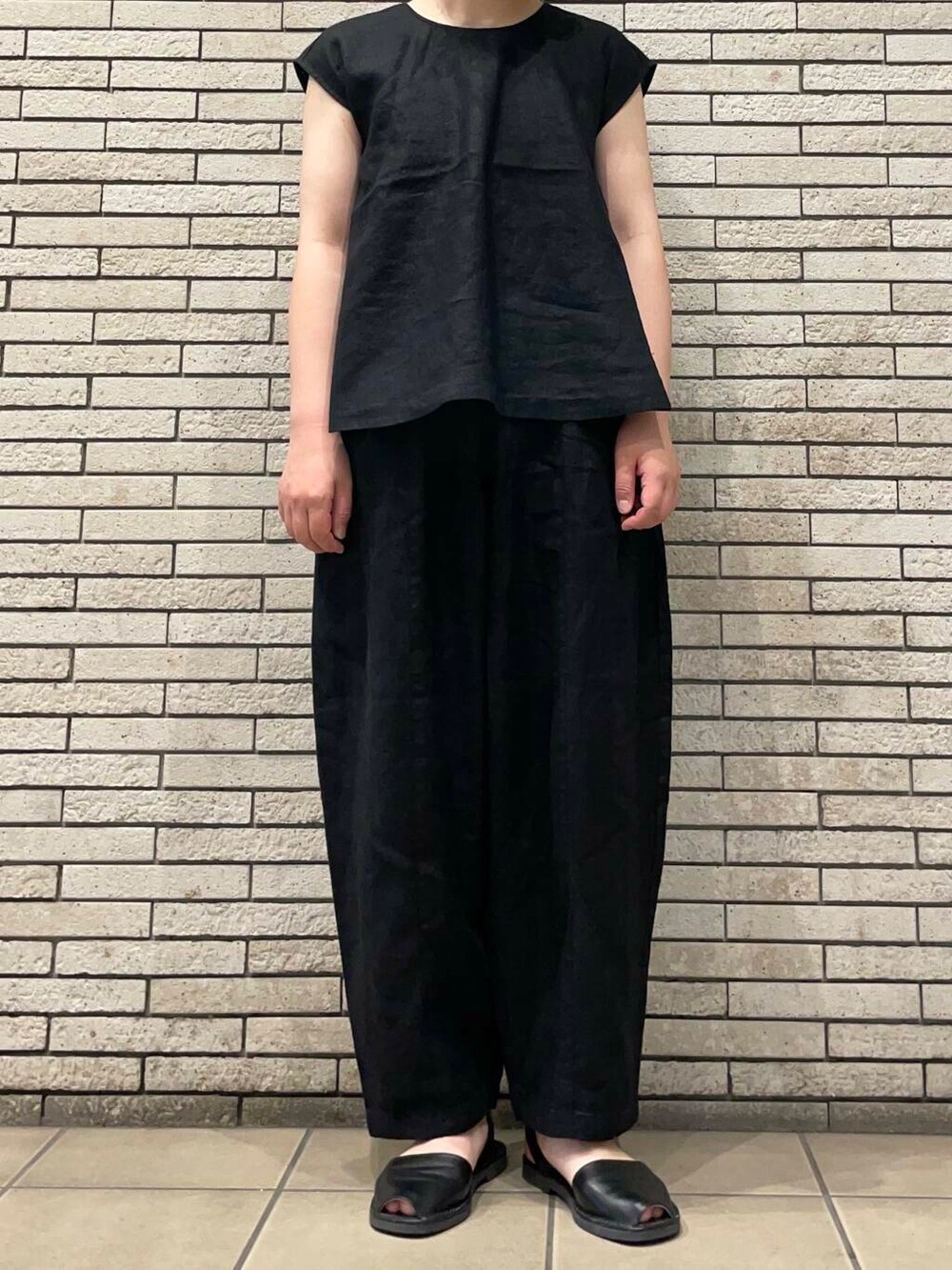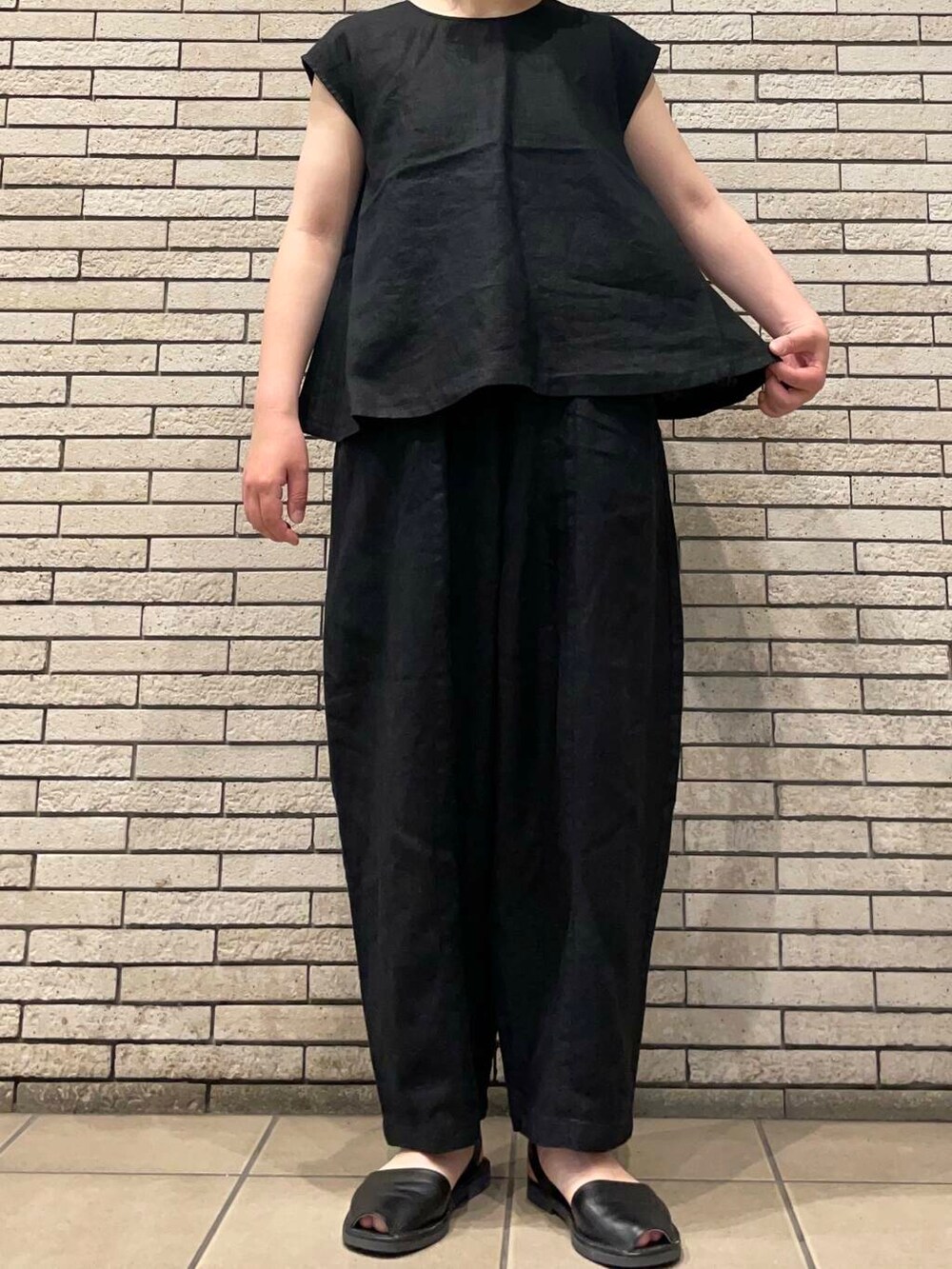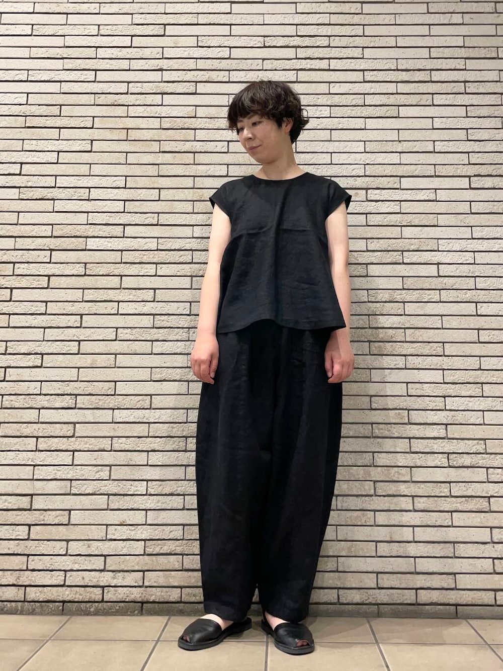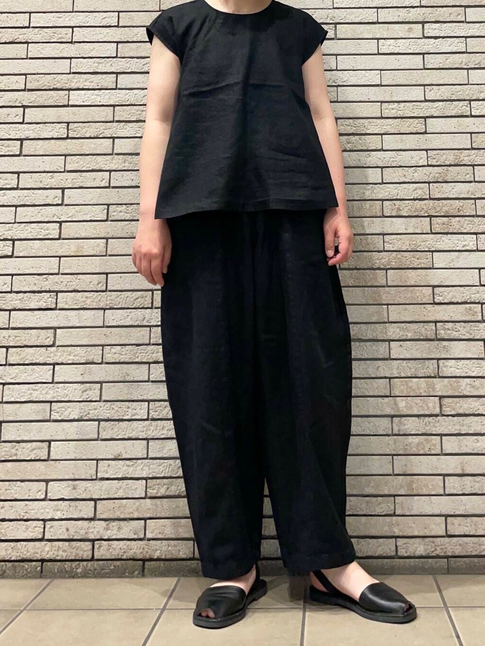 サラッとした肌触りのリネン素材です。ブラウスは裾にかけて優しく広がるシルエットですので、ウエストまわりをカバーしてくれます。ジャケットやカーディガンを合わせると、オンオフ問わず活躍するセットアップです。