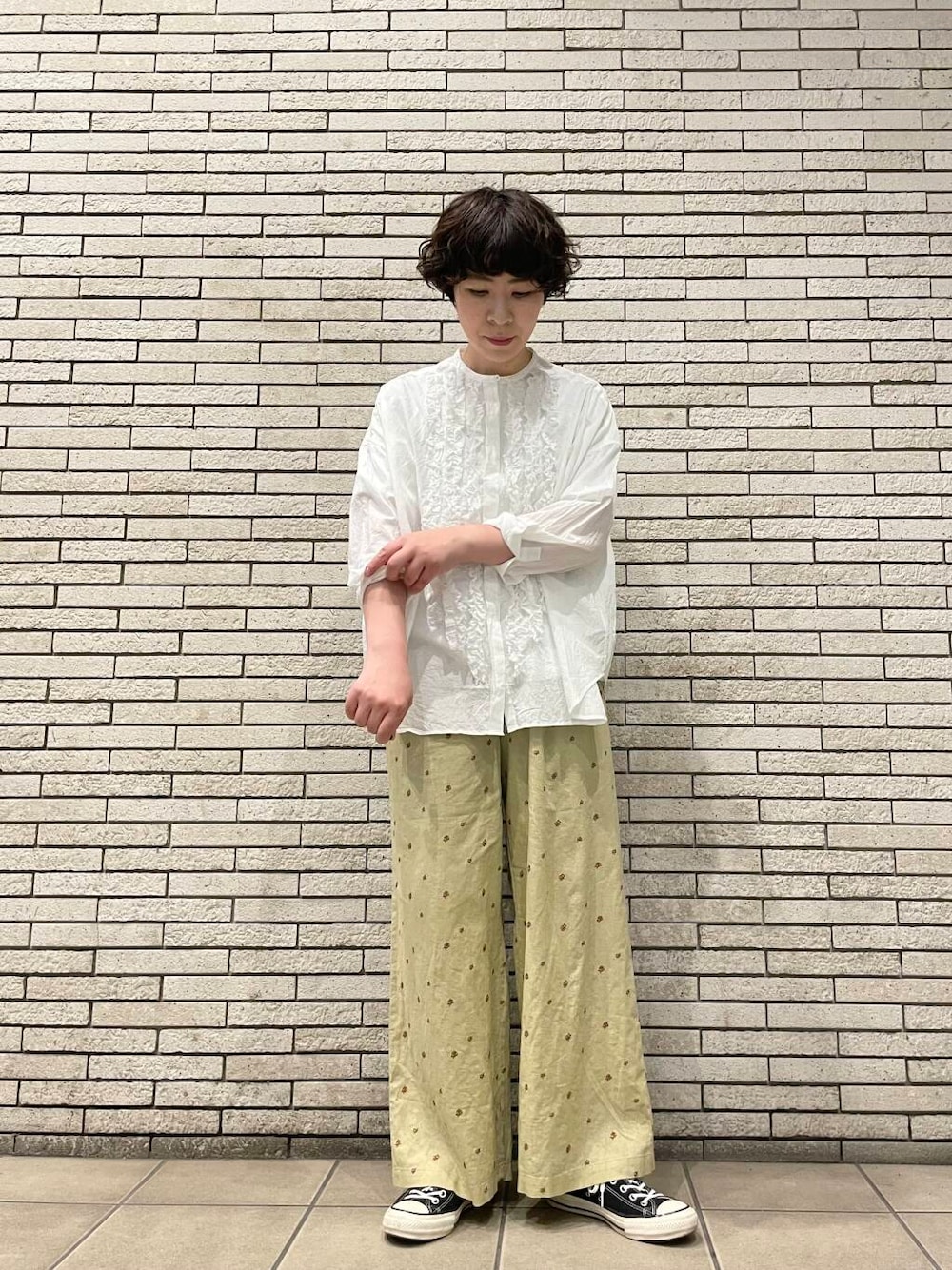 フリルデザインのシャツに刺繍のパンツを合わせてカジュアルダウンした装いです。