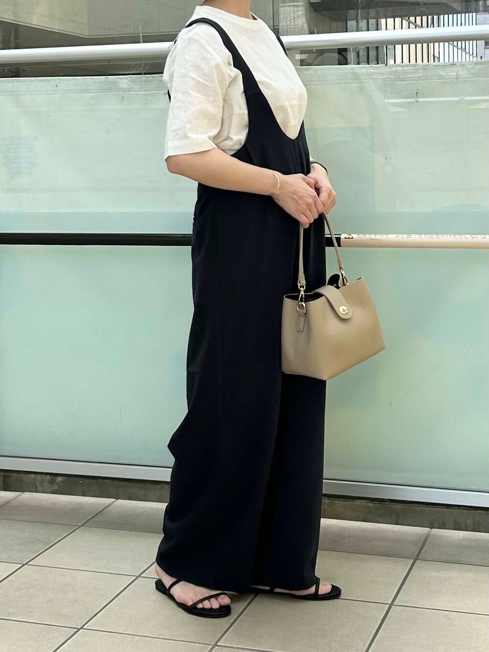 スッキリとしたシルエットのブラウスなのでサロペットのインナーにも使いやすいです。