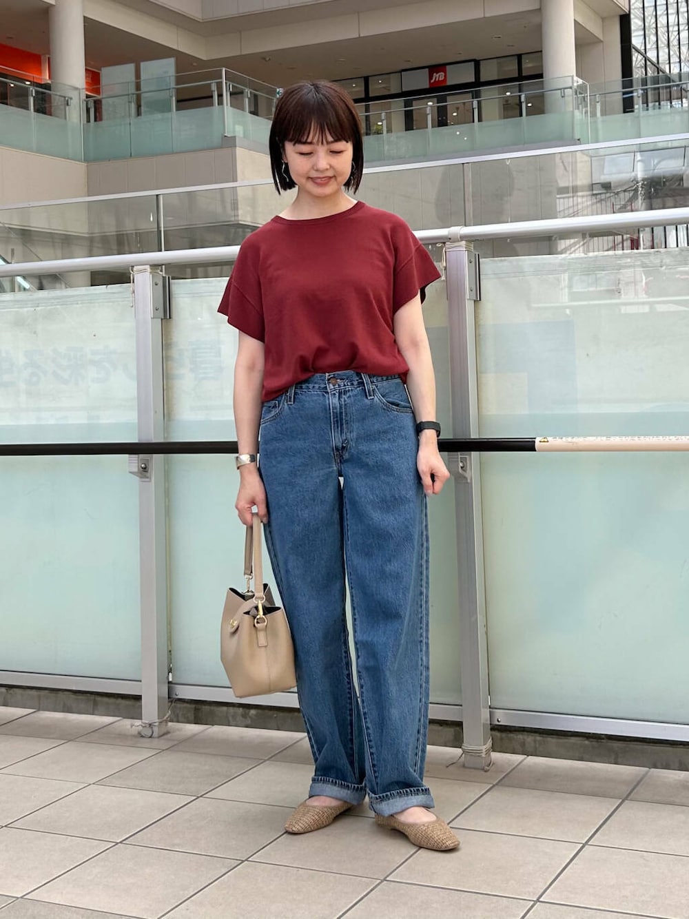 ダークレッドは深みがあって馴染みがいいので、カラーアイテムを普段着ないかたも挑戦しやすいと思います!