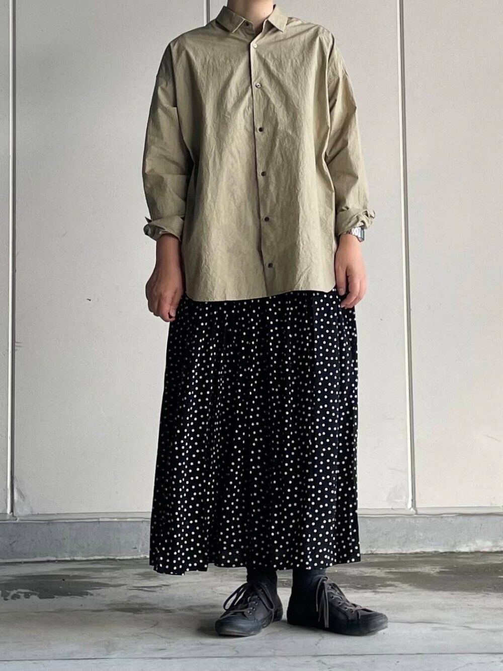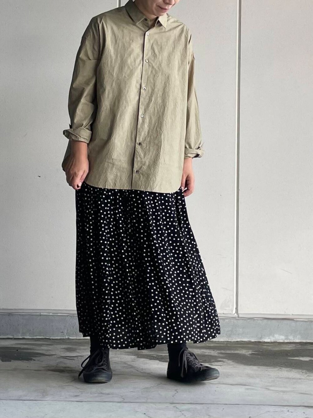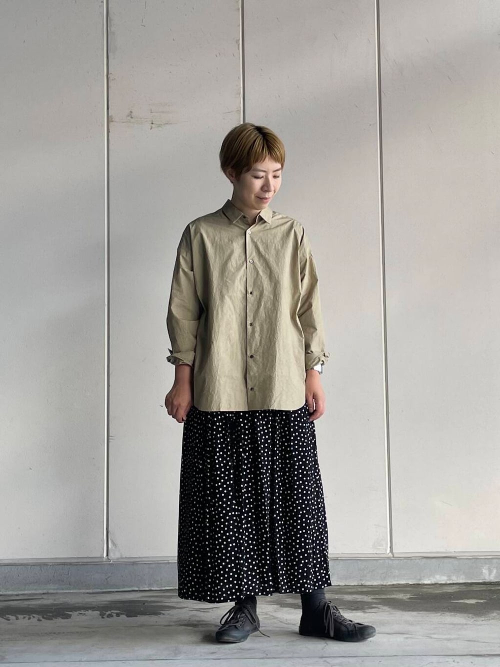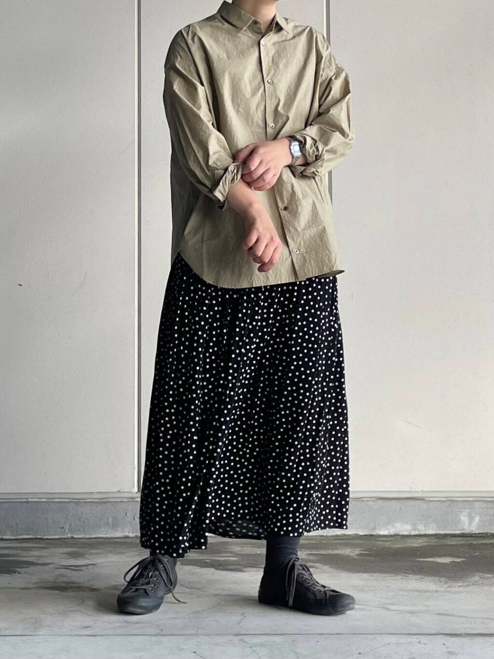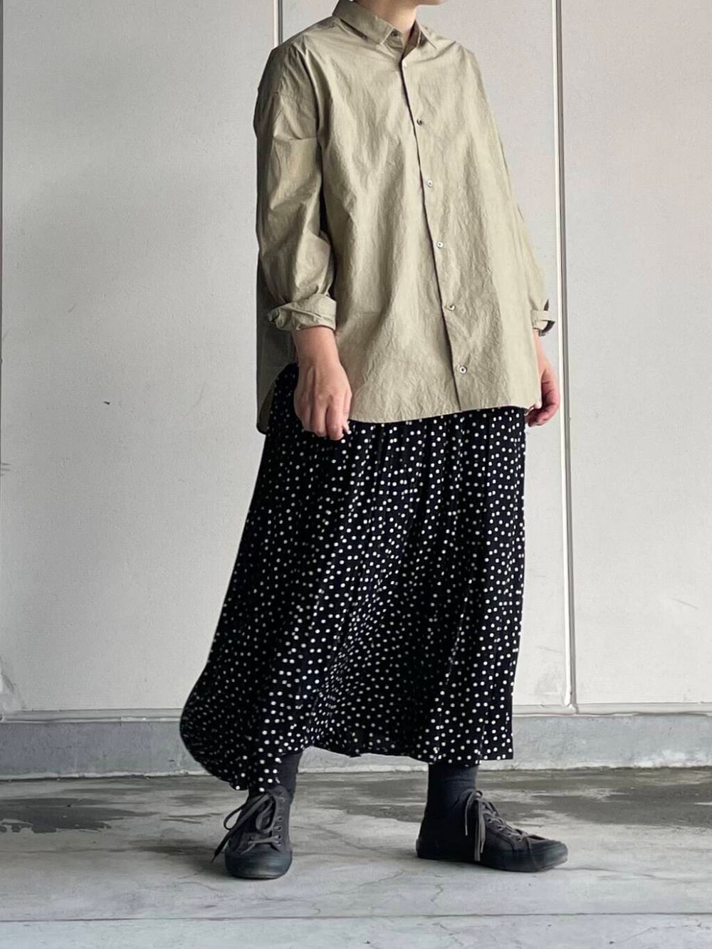 ドットのスカートは、レーヨン100%素材のとろみのある質感で、すとんと落ちるシルエットがスッキリと見せてくれます。