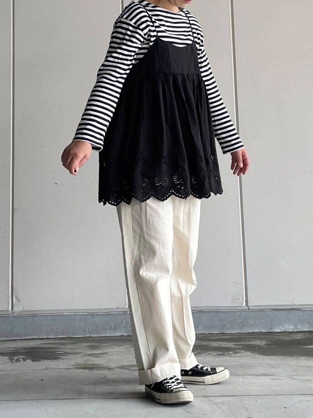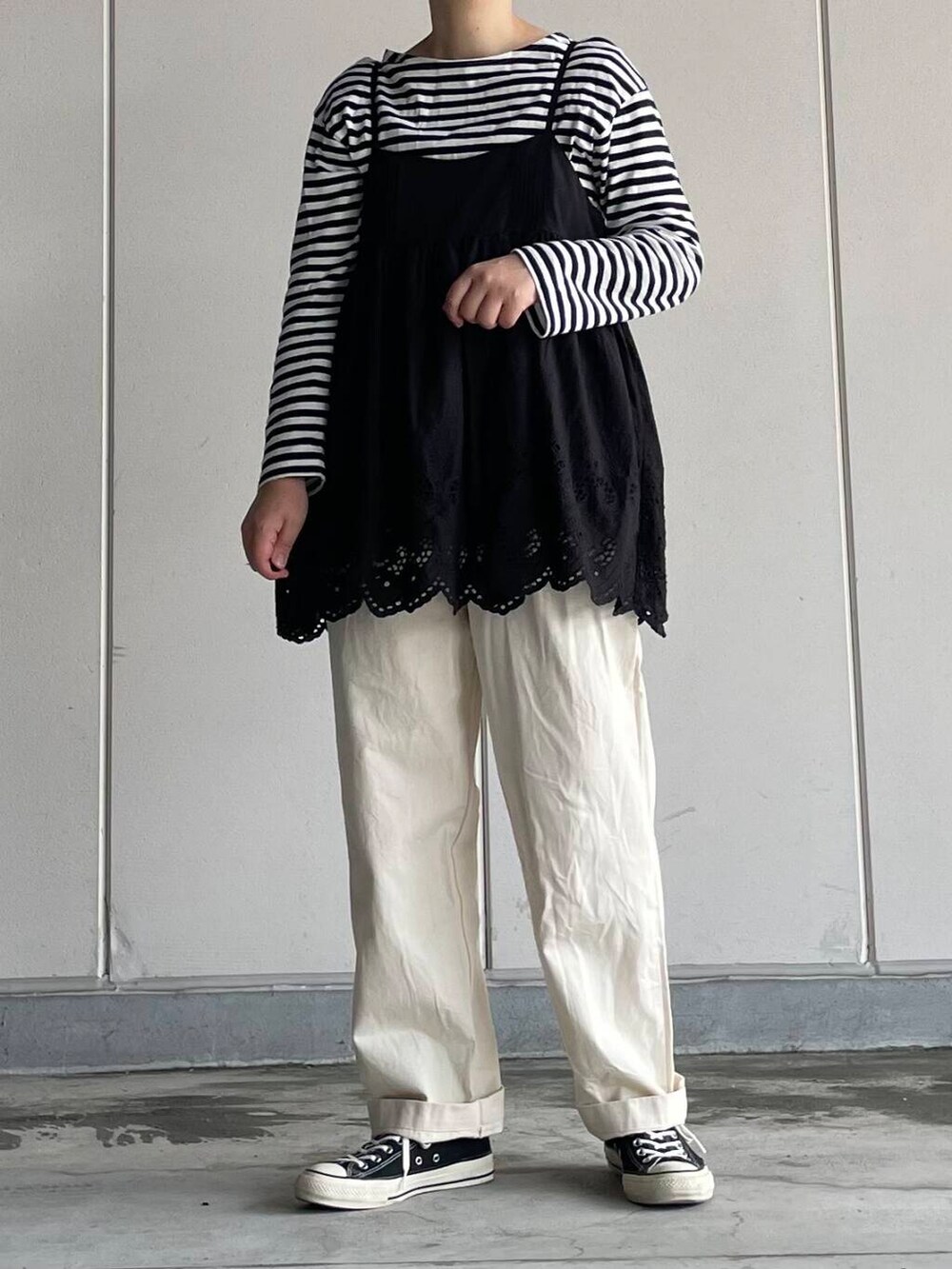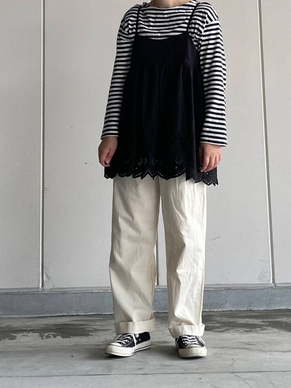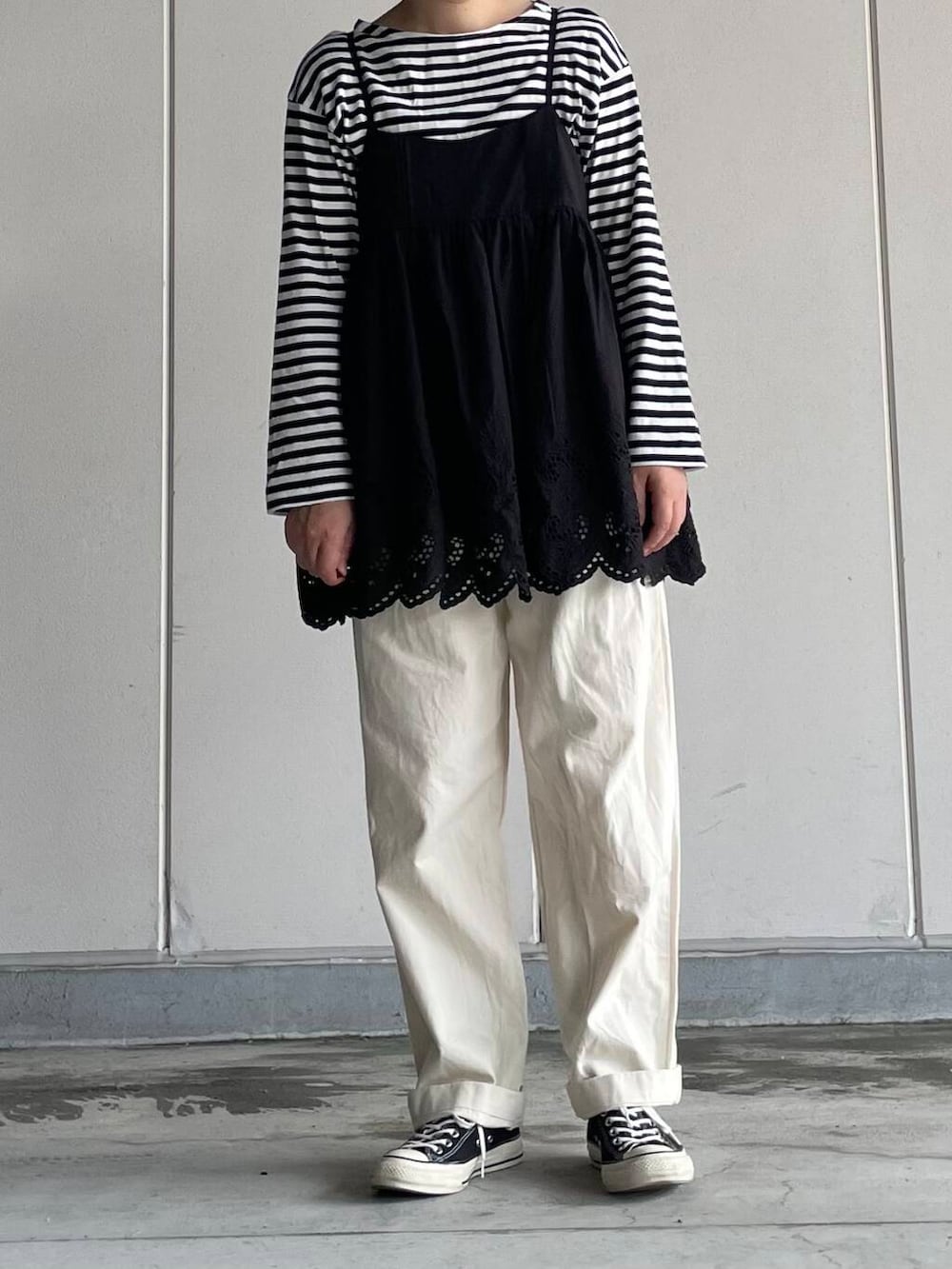 全体をモノトーンで揃えると、かわいい雰囲気のキャミソールも取り入れやすく、コーディネートのポイントになりますね。