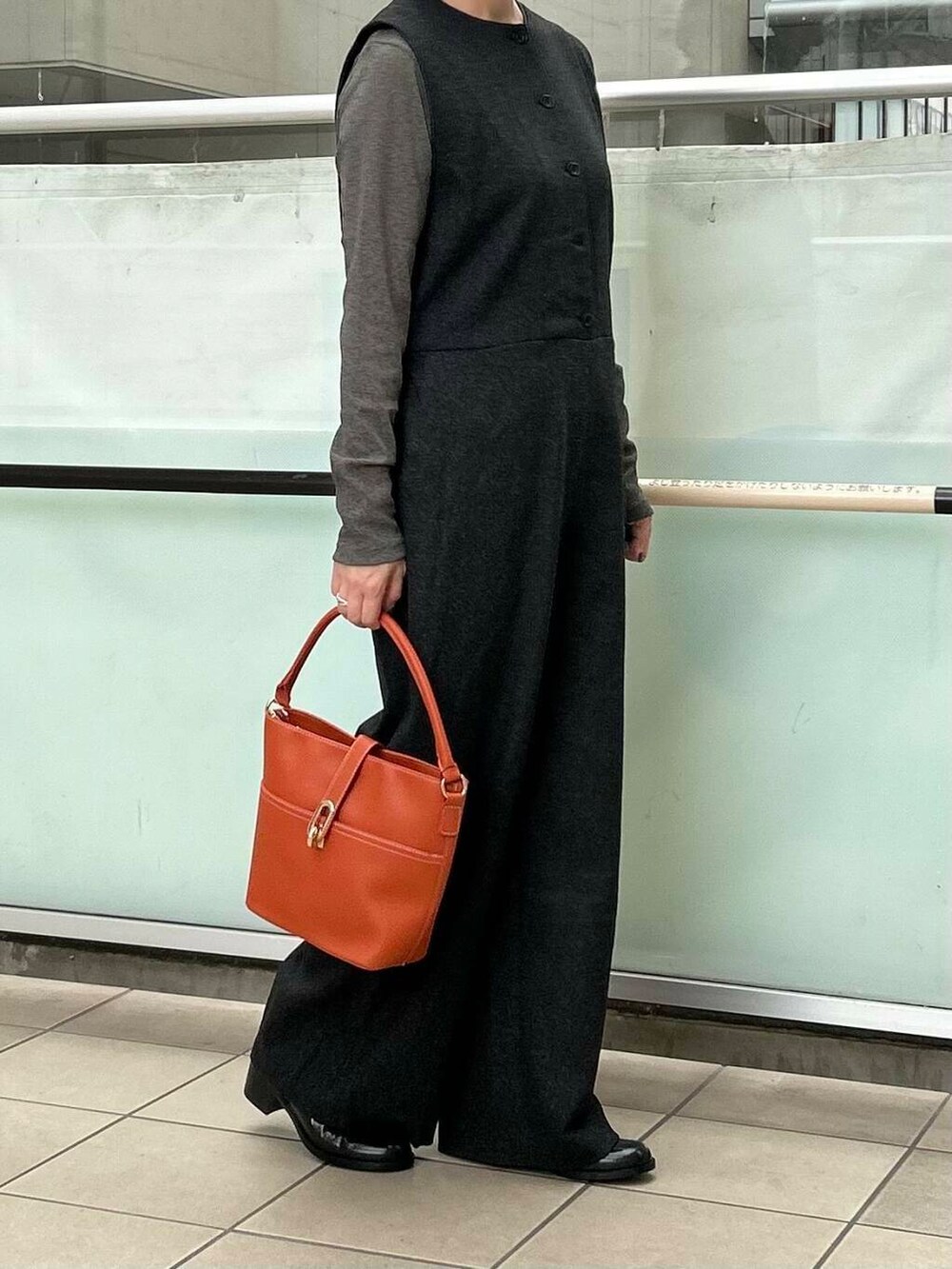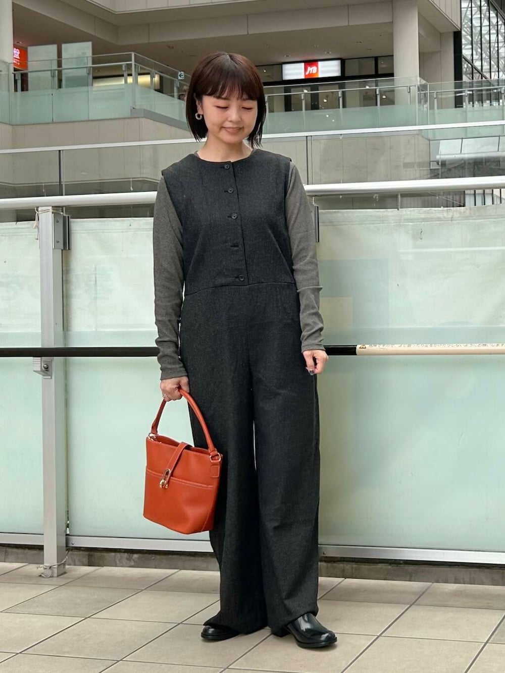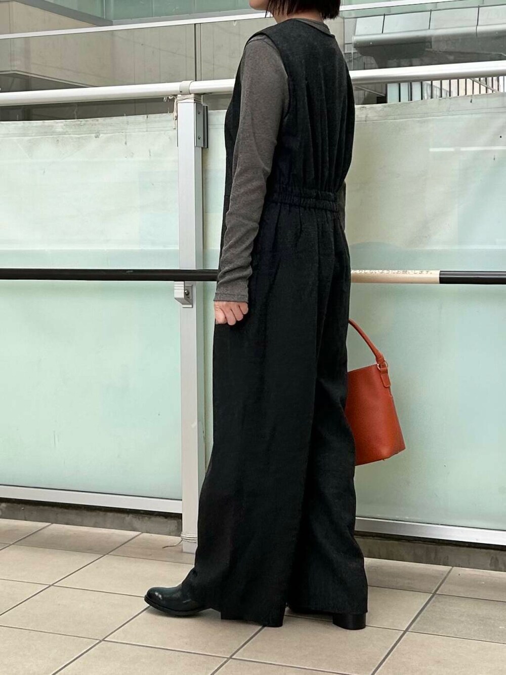 ウエストに切り替えがあるのでだぼっとせずスッキリと見えるオールインワンです。