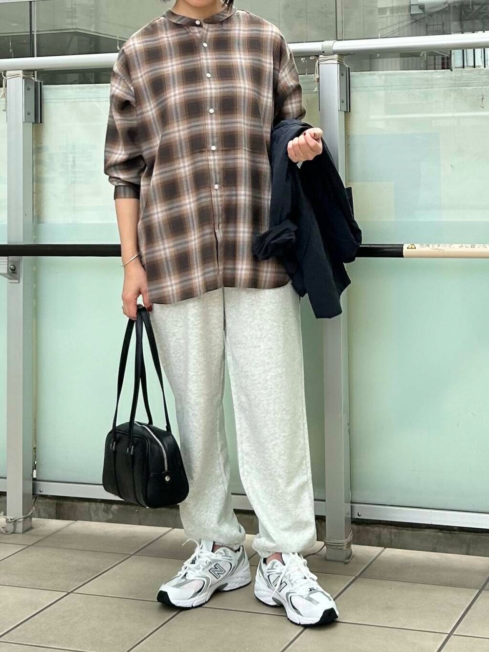 トップスも今すぐ着られるチェックシャツを合わせました。