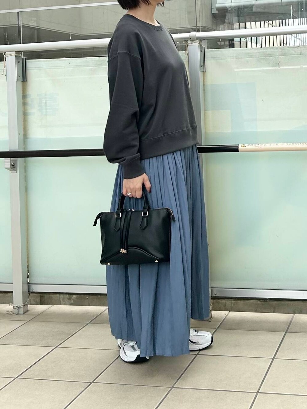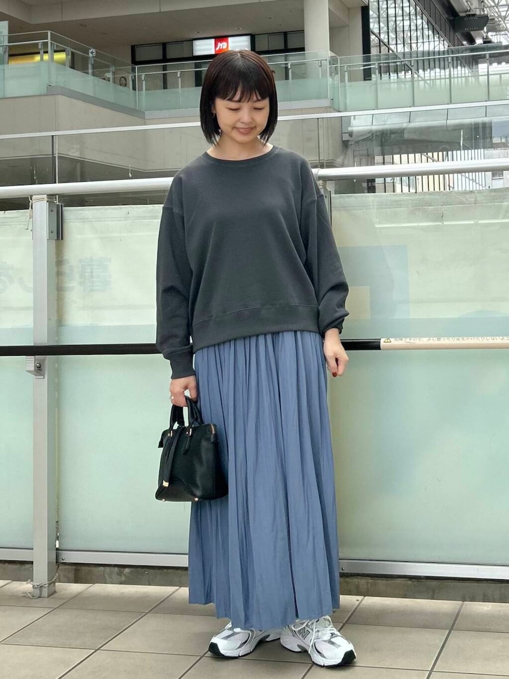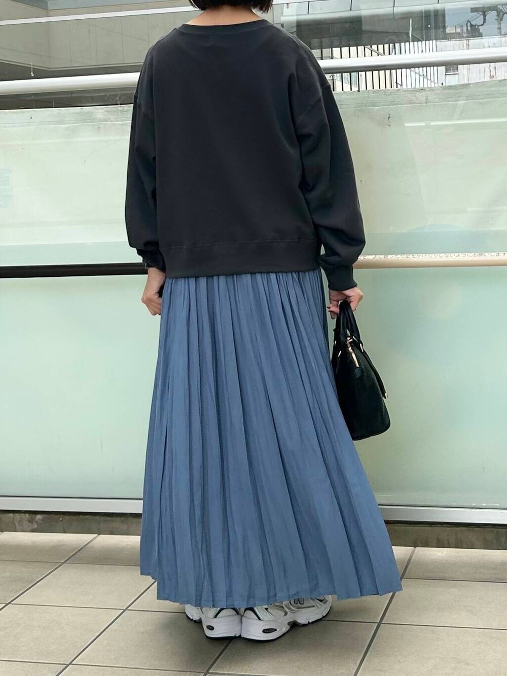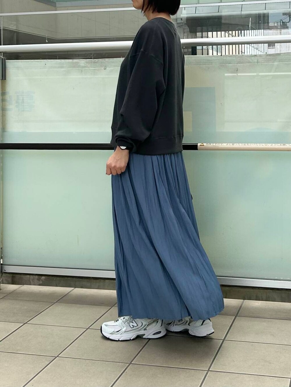 スウェットやざっくりニットなどボリュームのあるトップスと合わせるとスッキリと見せてくれてバランスよく見えるスカートです。