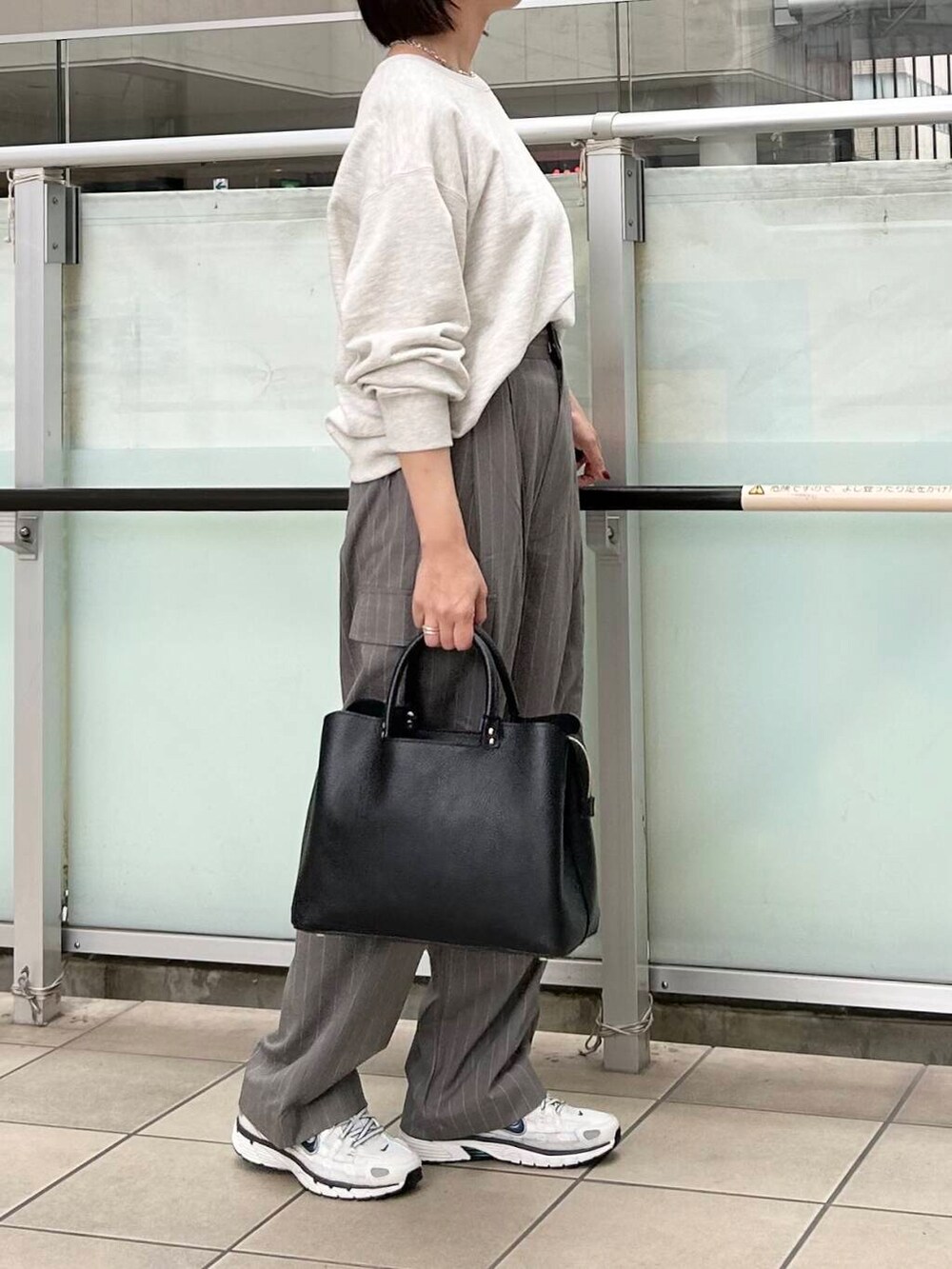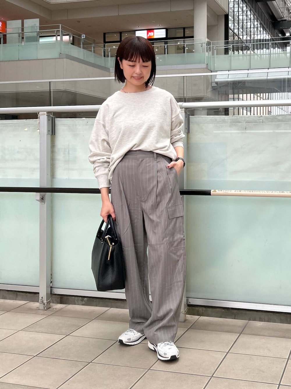 ボトムはカジュアルなカーゴパンツですがストライプで少し大人っぽい印象に。