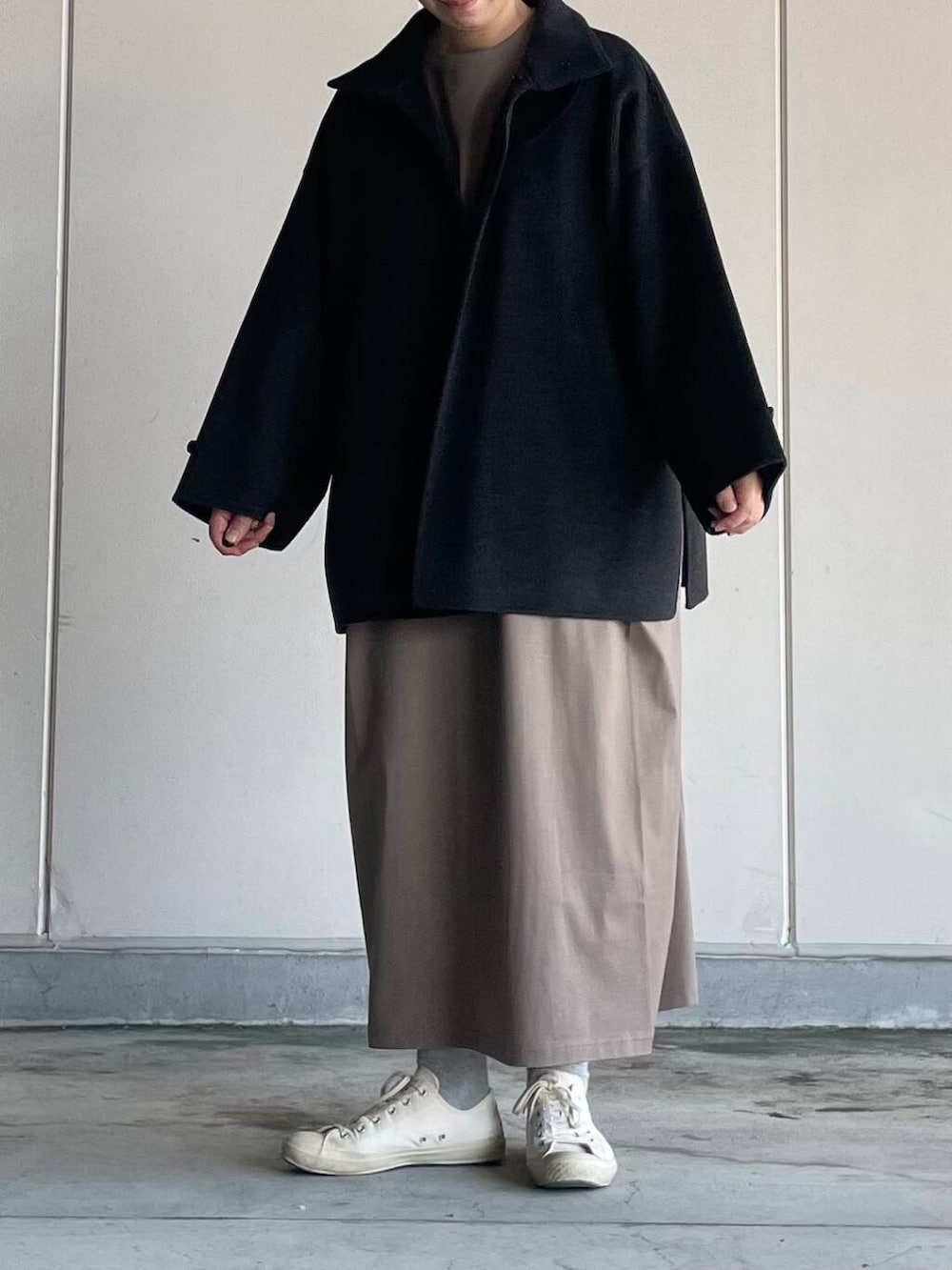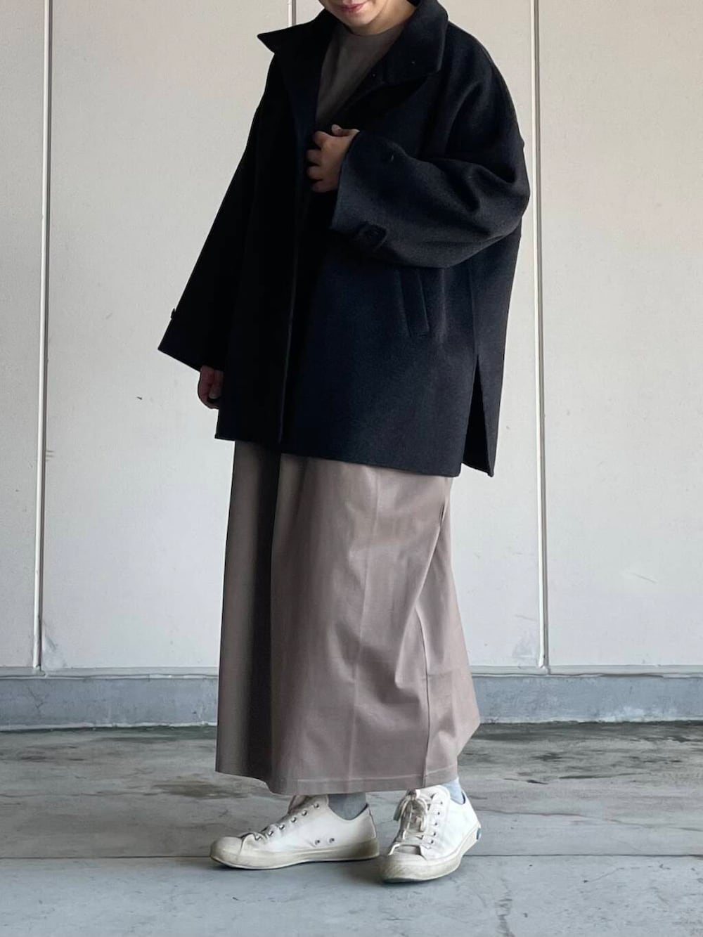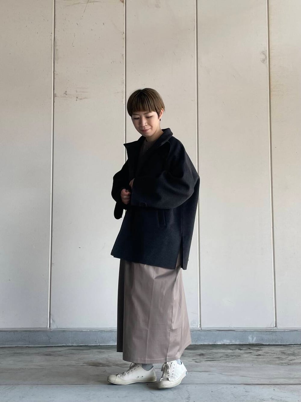 アウターは上品な素材感が魅力的なショートコートです。