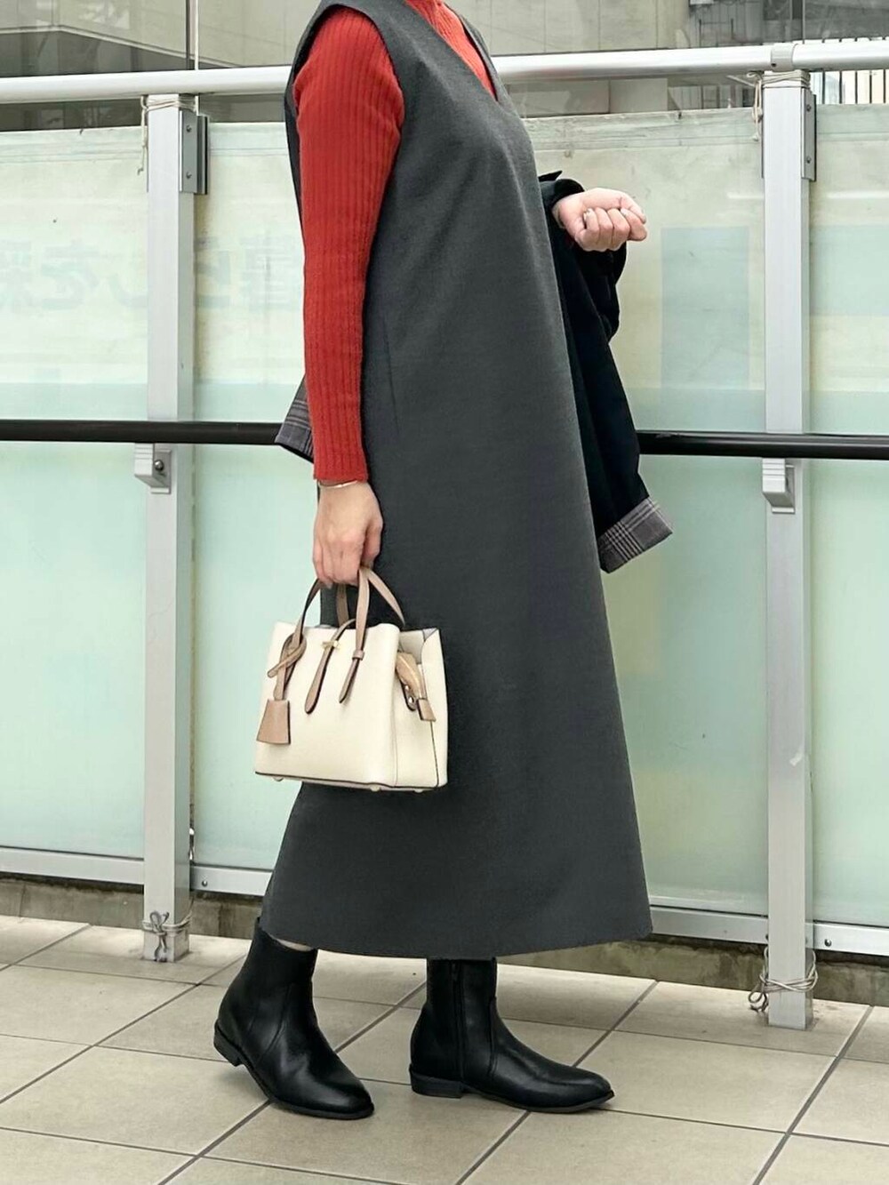 今回はテラコッタのニットを差し色に使いました。