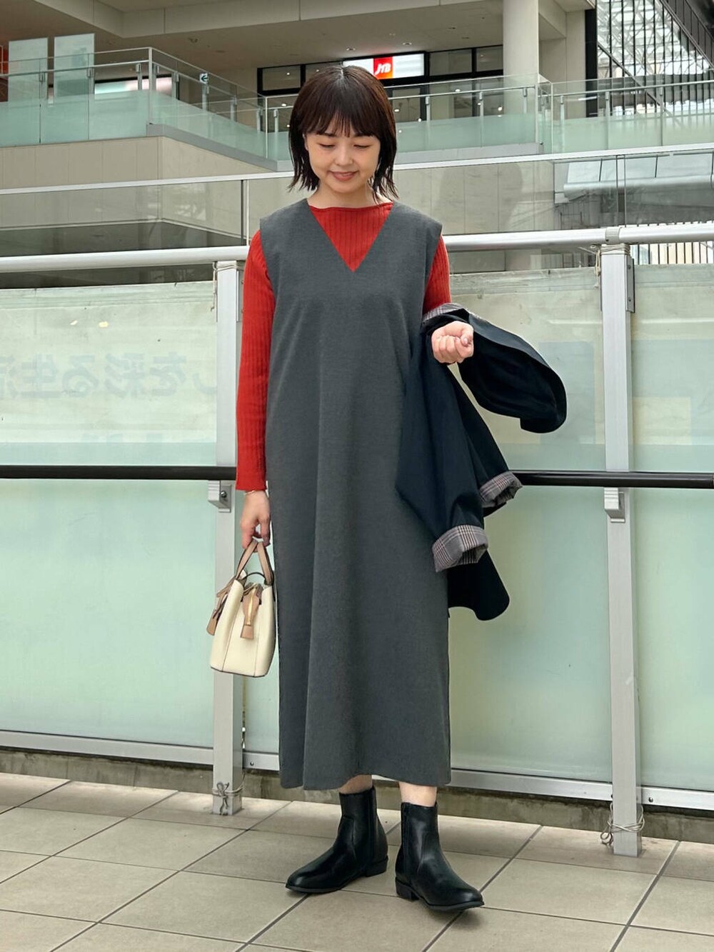 合わせるアイテムでキレイ目にも使えるので年末年始の行事でも使えて便利なワンピースです。